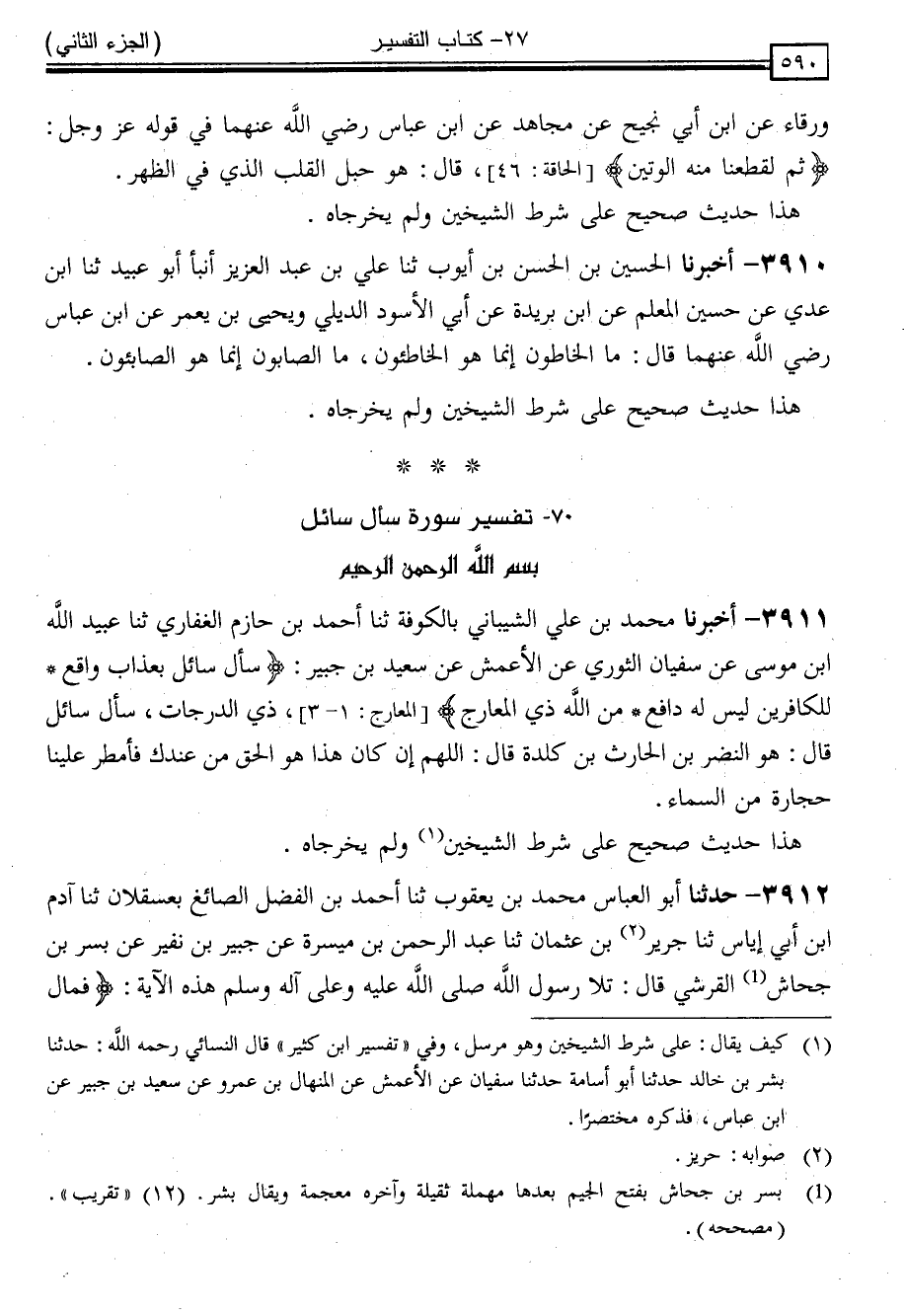 3911 - أَخْبَرَنَا مُحَمَّدُ بْنُ عَلِيٍّ الشَّيْبَانِيُّ بِالْكُوفَةَ ، ثنا أَحْمَدُ بْنُ حَازِمٍ الْغِفَارِيُّ ، ثنا عُبَيْدُ اللَّهِ بْنُ مُوسَى ، عَنْ سُفْيَانَ الثَّوْرِيِّ ، عَنِ الْأَعْمَشِ ، عَنْ سَعِيدِ بْنِ جُبَيْرٍ ، { سَأَلَ سَائِلٌ بِعَذَابٍ وَاقِعٍ لِلْكَافِرِينَ [قال كَائِنٌ] لَيْسَ لَهُ دَافِعٌ مِنَ اللَّهِ ذِي الْمَعَارِجِ } [المعارج: 2] ذِي الدَّرَجَاتِ { سَأَلَ سَائِلٌ } [المعارج: 1] قَالَ: هُوَ النَّضْرُ بْنُ الْحَارِثِ بْنِ كَلَدَةَ قَالَ: " اللَّهُمَّ إِنْ كَانَ هَذَا هُوَ الْحَقَّ مِنْ عِنْدِكَ ، فَأَمْطِرْ عَلَيْنَا حِجَارَةً مِنَ السَّمَاءِ "