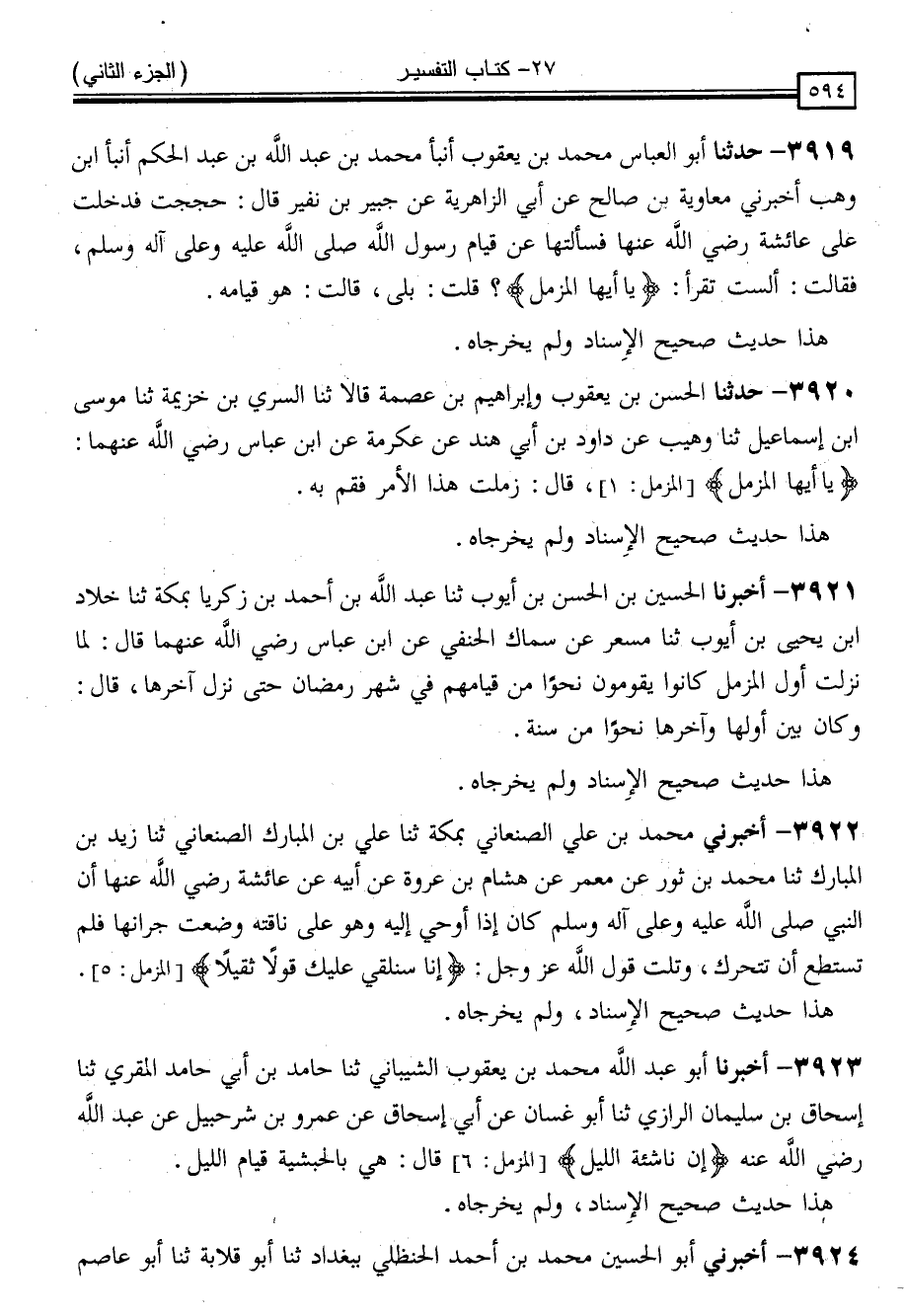 3919 - حَدَّثَنَا أَبُو الْعَبَّاسِ مُحَمَّدُ بْنُ يَعْقُوبَ ، أَنْبَأَ مُحَمَّدُ بْنُ عَبْدِ اللَّهِ بْنِ عَبْدِ الْحَكَمِ ، أَنْبَأَ ابْنُ وَهْبٍ ، أَخْبَرَنِي مُعَاوِيَةُ بْنُ صَالِحٍ ، عَنْ أَبِي الزَّاهِرِيَّةِ ، عَنْ جُبَيْرِ بْنِ نُفَيْرٍ ، قَالَ: حَجَجْتُ فَدَخَلْتُ عَلَى عَائِشَةَ رَضِيَ اللَّهُ عَنْهَا ، فَسَأَلْتُهَا عَنْ قِيَامِ رَسُولِ اللَّهِ صَلَّى اللَّهُ عَلَيْهِ وَسَلَّمَ ، فَقَالَتْ: " أَلَسْتَ تَقْرَأُ يَا أَيُّهَا الْمُزَّمِّلُ " قُلْتُ: بَلَى ، قَالَتْ: " هُوَ قِيَامُهُ "