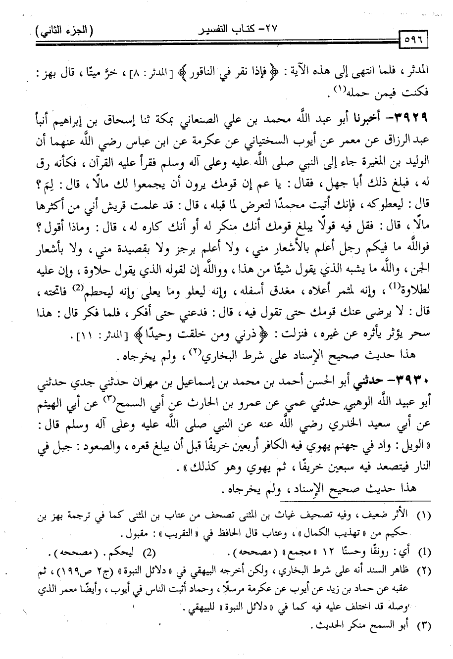 3929 - أَخْبَرَنَا أَبُو عَبْدِ اللَّهِ مُحَمَّدُ بْنُ عَلِيٍّ الصَّنْعَانِيُّ بِمَكَّةَ ، ثنا إِسْحَاقُ بْنُ إِبْرَاهِيمَ ، أَنْبَأَ عَبْدُ الرَّزَّاقِ ، عَنْ مَعْمَرٍ ، عَنْ أَيُّوبَ السَّخْتِيَانِيِّ ، عَنْ عِكْرِمَةَ ، عَنِ ابْنِ عَبَّاسٍ رَضِيَ اللَّهُ عَنْهُمَا ، أَنَّ الْوَلِيدَ بْنَ الْمُغِيرَةِ جَاءَ إِلَى النَّبِيِّ صَلَّى اللَّهُ عَلَيْهِ وَسَلَّمَ فَقَرَأَ عَلَيْهِ الْقُرْآنَ ، فَكَأَنَّهُ رَقَّ لَهُ فَبَلَغَ ذَلِكَ أَبَا جَهْلٍ ، فَأَتَاهُ فَقَالَ: يَا عَمُّ ، إِنَّ قَوْمَكَ يَرَوْنَ أَنْ يَجْمَعُوا لَكَ مَالًا . قَالَ: لَمَ ؟ قَالَ: لِيُعْطُوكَهُ فَإِنَّكَ أَتَيْتَ مُحَمَّدًا لِتُعْرِضَ لِمَا قِبَلَهُ قَالَ: قَدْ عَلِمَتْ قُرَيْشٌ أَنِّي مِنْ أَكْثَرِهَا مَالًا . قَالَ: فَقُلْ فِيهِ قَوْلًا يَبْلُغُ قَوْمَكَ أَنَّكَ مُنْكِرٌ لَهُ أَوْ أَنَّكَ كَارِهٌ لَهُ قَالَ: وَمَاذَا أَقُولُ " فَوَاللَّهِ مَا فِيكُمْ رَجُلٌ أَعْلَمَ بِالْأَشْعَارِ مِنِّي ، وَلَا أَعْلَمَ بِرَجَزٍ وَلَا بِقَصِيدَةٍ مِنِّي وَلَا بِأَشْعَارِ الْجِنِّ وَاللَّهِ مَا يُشْبِهُ الَّذِي يَقُولُ شَيْئًا مِنْ هَذَا وَوَاللَّهِ إِنَّ لِقَوْلِهِ الَّذِي يَقُولُ حَلَاوَةً ، وَإِنَّ عَلَيْهِ لَطَلَاوَةً ، وَإِنَّهُ لَمُثْمِرٌ أَعْلَاهُ مُغْدِقٌ أَسْفَلُهُ ، وَإِنَّهُ لَيَعْلُو وَمَا يُعْلَى وَإِنَّهُ لَيَحْطِمُ مَا تَحْتَهُ " قَالَ: لَا يَرْضَى عَنْكَ قَوْمُكَ حَتَّى تَقُولَ فِيهِ . قَالَ: فَدَعْنِي حَتَّى أُفَكِّرَ ، فَلَمَّا فَكَّرَ قَالَ: " هَذَا سِحْرٌ يُؤْثَرُ يَأْثُرُهُ مِنْ غَيْرِهِ فَنَزَلَتْ { ذَرْنِي وَمَنْ خَلَقْتُ وَحِيدًا } [المدثر: 11] "