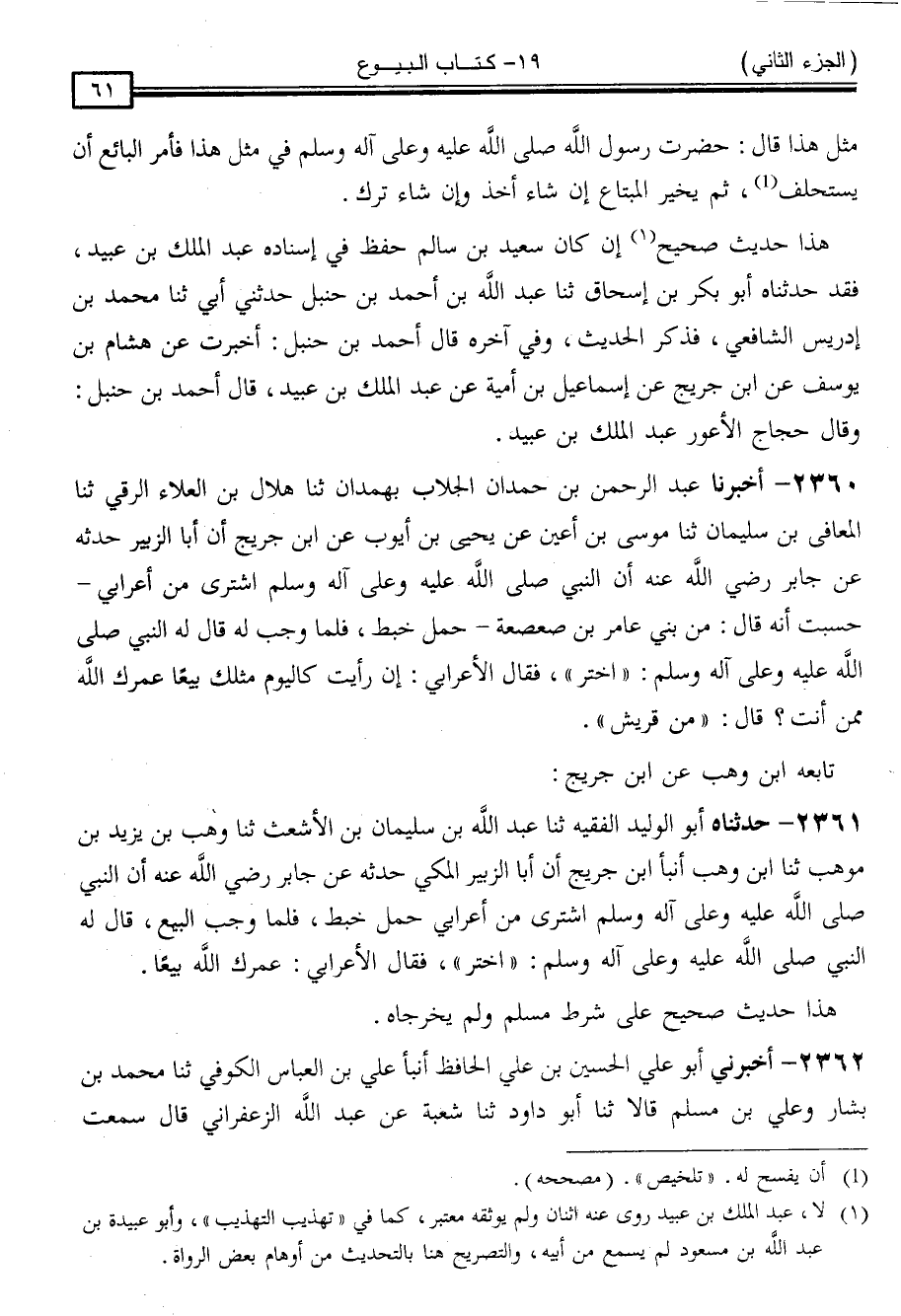 2361 - حَدَّثَنَاهُ أَبُو الْوَلِيدِ الْفَقِيهُ ، ثنا عَبْدُ اللَّهِ بْنُ سُلَيْمَانَ بْنِ الْأَشْعَثِ ، ثنا وَهْبُ بْنُ يَزِيدَ بْنَ مَوْهَبٍ ، ثنا ابْنُ وَهْبٍ ، أَنْبَأَ ابْنُ جُرَيْجٍ ، أَنَّ أَبَا الزُّبَيْرِ الْمَكِّيَّ ، حَدَّثَهُ ، عَنْ جَابِرٍ رَضِيَ اللَّهُ عَنْهُ ، أَنَّ النَّبِيَّ صَلَّى اللَّهُ عَلَيْهِ وَسَلَّمَ اشْتَرَى مِنْ أَعْرَابِيٍّ حِمْلَ خَبَطٍ فَلَمَّا وَجَبَ الْبَيْعُ ، قَالَ لَهُ النَّبِيُّ صَلَّى اللَّهُ عَلَيْهِ وَسَلَّمَ: " اخْتَرْ " فَقَالَ الْأَعْرَابِيُّ عَمْرُكَ اللَّهُ بَيِّعًا