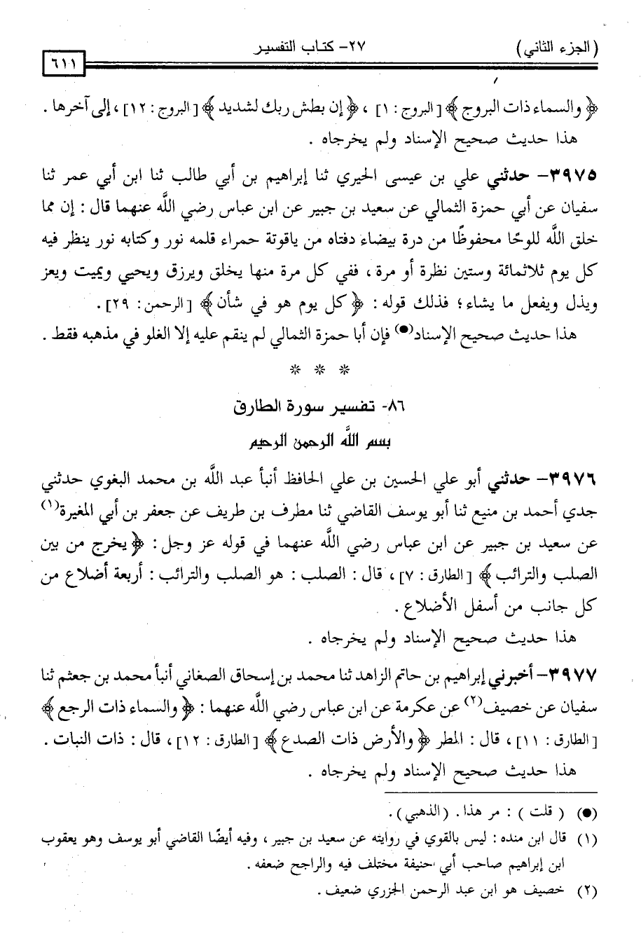 3977 - أَخْبَرَنِي إِبْرَاهِيمُ بْنُ [مُحَمَّدِ بْنِ] حَاتِمٍ الزَّاهِدُ ، ثنا مُحَمَّدُ بْنُ إِسْحَاقَ الصَّنْعَانِيُّ ، أَنْبَأَ مُحَمَّدُ بْنُ جُعْثُمٍ * ، ثنا سُفْيَانُ ، عَنْ خُصَيْفٍ ، عَنْ عِكْرِمَةَ ، عَنِ ابْنِ عَبَّاسٍ رَضِيَ اللَّهُ عَنْهُمَا ، { وَالسَّمَاءِ ذَاتِ الرَّجْعِ } [الطارق: 11] قَالَ: " الْمَطَرُ " { وَالْأَرْضِ ذَاتِ الصَّدْعِ } [الطارق: 12] قَالَ: " ذَاتُ النَّبَاتِ "