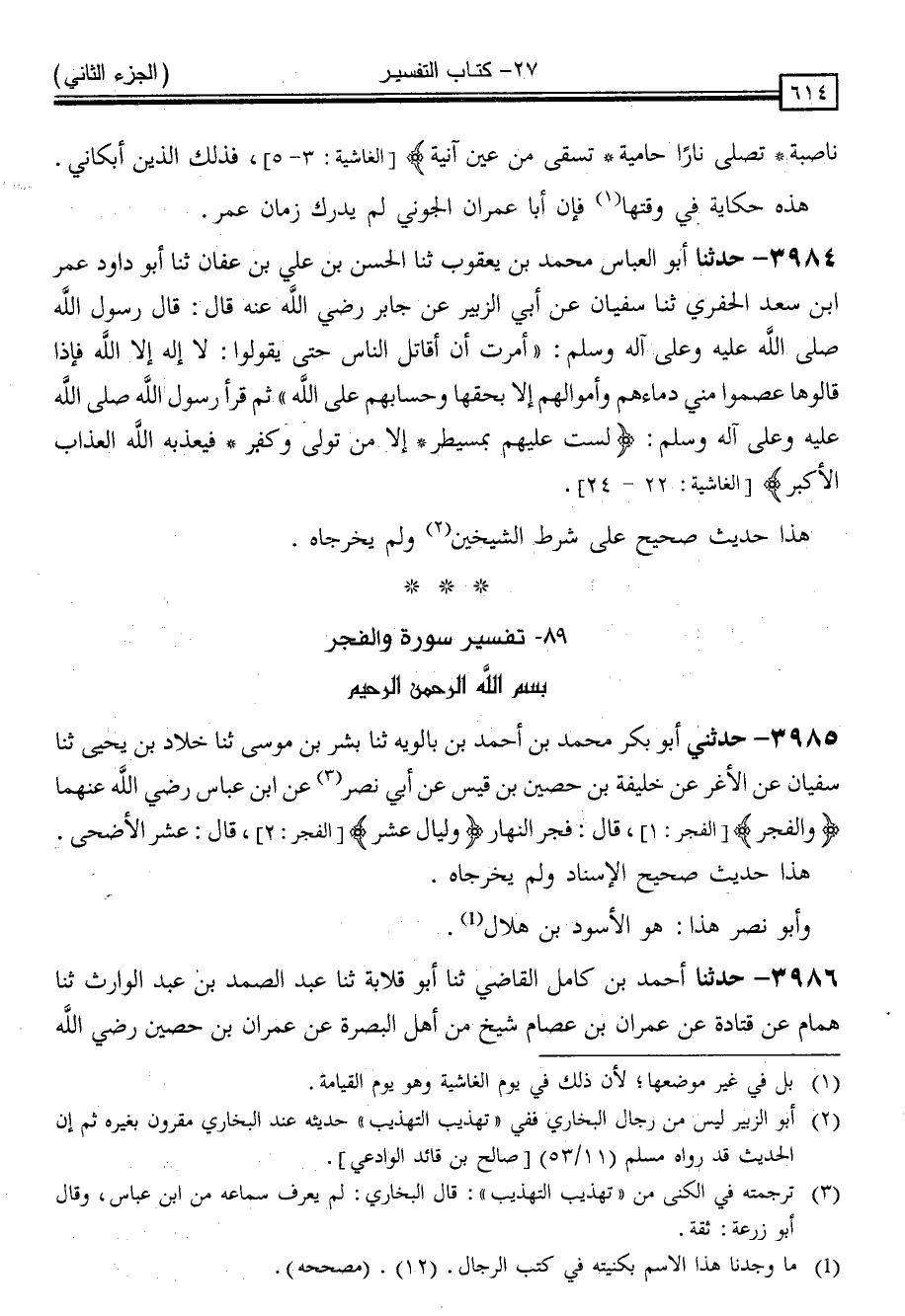 3985 - حَدَّثَنِي أَبُو بَكْرٍ مُحَمَّدُ بْنُ أَحْمَدَ بْنِ بَالَوَيْهِ ، ثنا بِشْرُ بْنُ مُوسَى ، ثنا خَلَّادُ بْنُ يَحْيَى ، ثنا سُفْيَانُ ، عَنِ الْأَغَرِّ ، عَنْ خَلِيفَةَ بْنِ حُصَيْنِ بْنِ قَيْسٍ ، عَنْ أَبِي نَصْرٍ ، عَنِ ابْنِ عَبَّاسٍ رَضِيَ اللَّهُ عَنْهُمَا ، { وَالْفَجْرِ } [الفجر: 1] قَالَ: " فَجْرُ النَّهَارِ " { وَلَيَالٍ عَشْرٍ } [الفجر: 2] قَالَ: " عَشْرُ الْأَضْحَى "