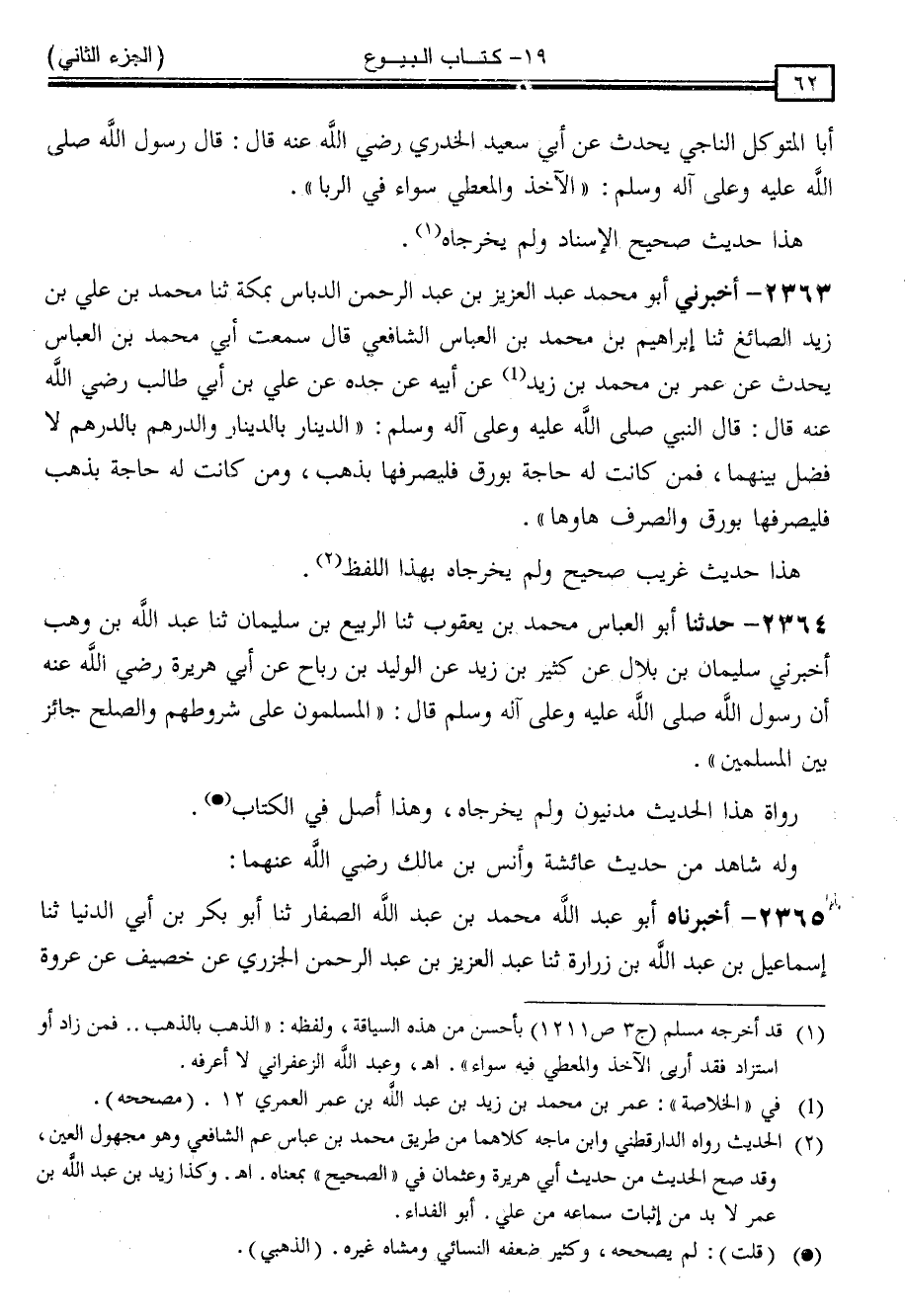 2363 - أَخْبَرَنِي أَبُو مُحَمَّدٍ عَبْدُ الْعَزِيزِ بْنُ عَبْدِ الرَّحْمَنِ الدَّبَّاسُ بِمَكَّةَ ، ثنا مُحَمَّدُ بْنُ عَلِيِّ بْنِ زَيْدٍ الصَّائِغُ ، ثنا إِبْرَاهِيمُ بْنُ مُحَمَّدِ بْنِ الْعَبَّاسِ الشَّافِعِيُّ ، قَالَ: سَمِعْتُ أَبِيَ مُحَمَّدَ بْنَ الْعَبَّاسِ ، يُحَدِّثُ ، عَنْ عُمَرَ بْنِ مُحَمَّدِ بْنِ زَيْدٍ ، عَنْ أَبِيهِ ، عَنْ جَدِّهِ ، عَنْ عَلِيِّ بْنِ أَبِي طَالِبٍ رَضِيَ اللَّهُ عَنْهُ ، قَالَ: قَالَ النَّبِيُّ صَلَّى اللَّهُ عَلَيْهِ وَسَلَّمَ: " الدِّينَارُ بِالدِّينَارِ وَالدِّرْهَمُ بِالدِّرْهَمِ لَا فَضْلَ بَيْنَهُمَا ، فَمَنْ كَانَتْ لَهُ حَاجَةٌ بِوَرِقٍ فَلْيَصْرِفْهَا بِذَهَبٍ ، وَمَنْ كَانَتْ لَهُ حَاجَةٌ بِذَهَبٍ فَلْيَصْرِفْهَا بِوَرِقٍ وَالصَّرْفُ هَا وَهَا "