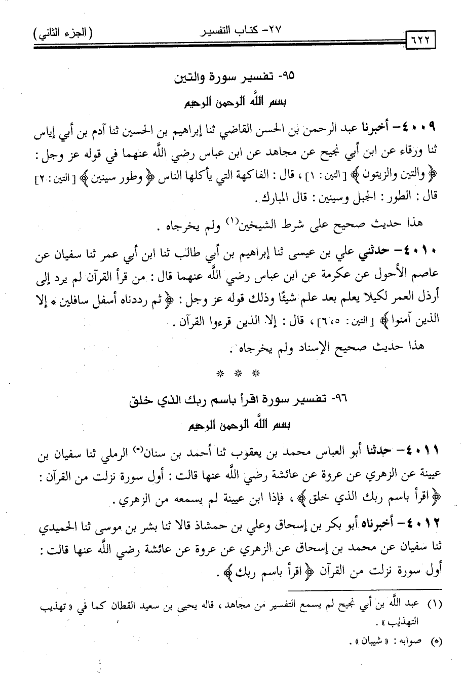 4009 - أَخْبَرَنَا عَبْدُ الرَّحْمَنِ بْنُ الْحَسَنِ الْقَاضِي ، ثنا إِبْرَاهِيمُ بْنُ الْحُسَيْنِ ، ثنا آدَمُ بْنُ أَبِي إِيَاسٍ ، ثنا وَرْقَاءُ ، عَنِ ابْنِ أَبِي نَجِيحٍ ، عَنْ مُجَاهِدٍ ، عَنِ ابْنِ عَبَّاسٍ رَضِيَ اللَّهُ عَنْهُمَا ، فِي قَوْلِهِ عَزَّ وَجَلَّ: { وَالتِّينِ وَالزَّيْتُونِ } [التين: 1] قَالَ: " الْفَاكِهَةُ الَّتِي يَأْكُلُهَا النَّاسُ " { وَطُورِ سِينِينَ } [التين: 2] قَالَ: { الطُّورُ } [البقرة: 63] الْجَبَلُ ، وَ { سِينِينَ } [التين: 2] قَالَ: " الْمُبَارَكُ "