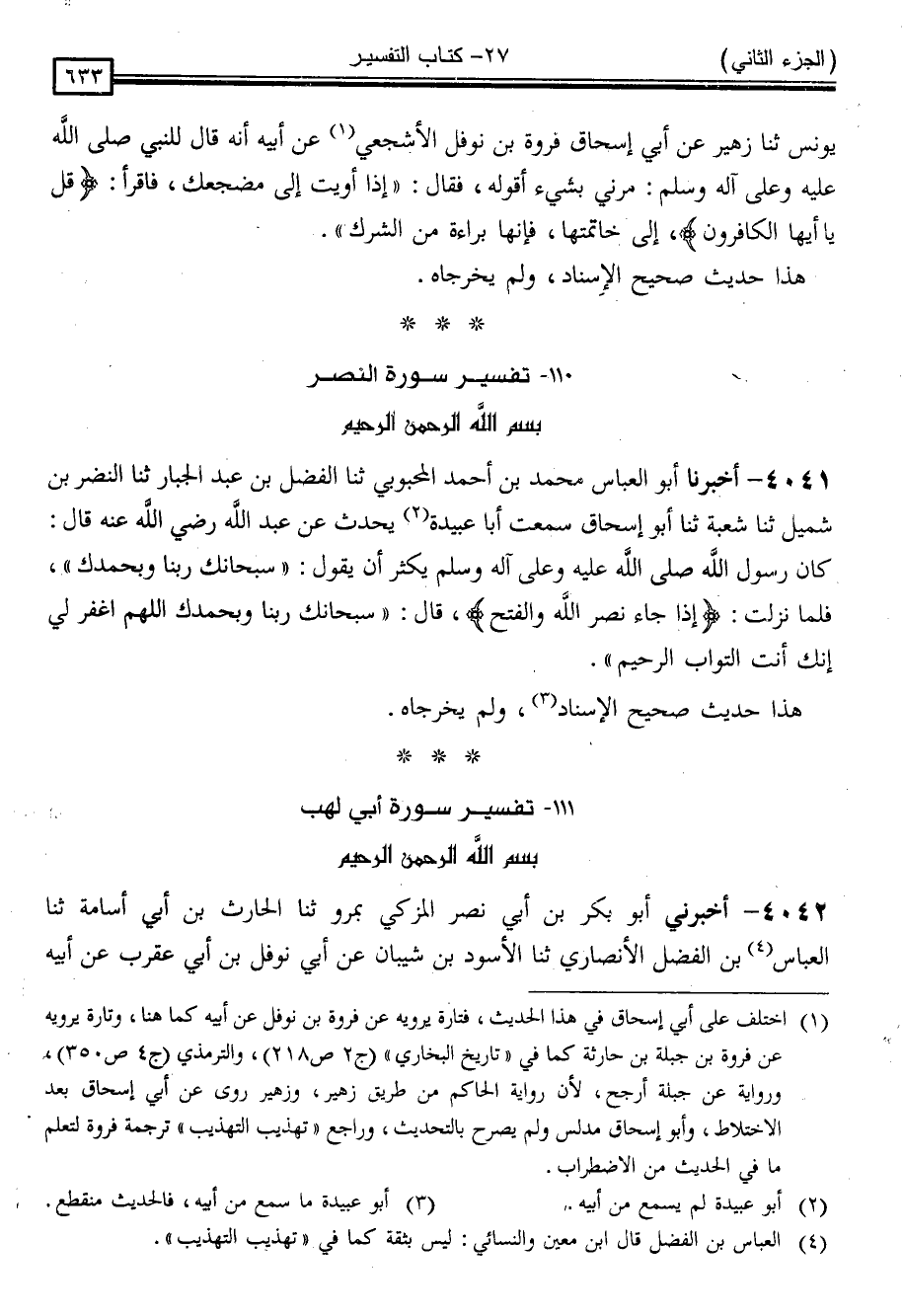 4041 - أَخْبَرَنَا أَبُو الْعَبَّاسِ مُحَمَّدُ بْنُ أَحْمَدَ الْمَحْبُوبِيُّ ، ثنا الْفَضْلُ بْنُ عَبْدِ الْجَبَّارِ ، ثنا النَّضْرُ بْنُ شُمَيْلٍ ، ثنا شُعْبَةُ ، ثنا أَبُو إِسْحَاقَ ، سَمِعْتُ أَبَا عُبَيْدَةَ ، يُحَدِّثُ عَنْ عَبْدِ اللَّهِ رَضِيَ اللَّهُ عَنْهُ ، قَالَ: كَانَ رَسُولُ اللَّهِ صَلَّى اللَّهُ عَلَيْهِ وَسَلَّمَ يُكْثِرُ أَنْ يَقُولَ: " سُبْحَانَكَ رَبَّنَا وَبِحَمْدِكَ " ، فَلَمَّا نَزَلَتْ إِذَا جَاءَ نَصْرُ اللَّهِ وَالْفَتْحُ قَالَ: " سُبْحَانَكَ رَبَّنَا وَبِحَمْدِكَ اللَّهُمَّ اغْفِرْ لِي إِنَّكَ أَنْتَ التَّوَّابُ الرَّحِيمُ "