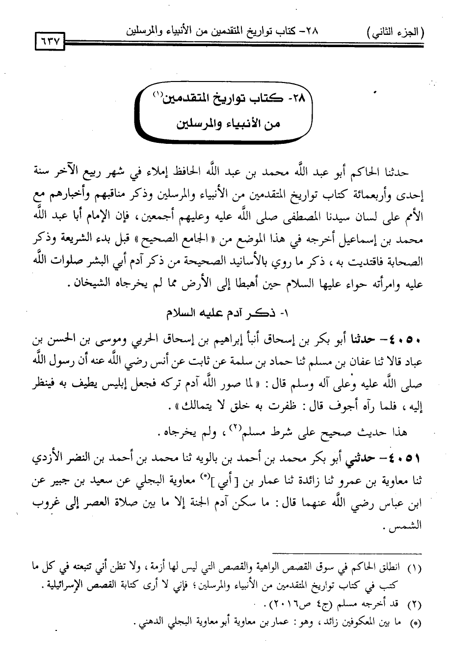 حَدَّثَنَا الْحَاكِمُ أَبُو عَبْدِ اللَّهِ مُحَمَّدُ بْنُ عَبْدِ اللَّهِ الْحَافِظُ إِمْلَاءً فِي شَهْرِ رَبِيعٍ الْآخِرِ سَنَةَ إِحْدَى وَأَرْبَعِ مِائَةٍ: كِتَابُ تَوَارِيخِ الْمُتَقَدِّمِينَ مِنَ الْأَنْبِيَاءِ وَالْمُرْسَلِينَ ، وَذِكْرِ مَنَاقِبِهِمْ وَأَخْبَارِهِمْ مَعَ الْأُمَمِ عَلَى لِسَانِ سَيِّدِنَا الْمُصْطَفَى صَلَّى اللَّهُ عَلَيْهِ وَسَلَّمَ وَعَلَيْهِمْ أَجْمَعِينَ ، فَإِنَّ الْإِمَامَ أَبَا عَبْدِ اللَّهِ مُحَمَّدَ بْنَ إِسْمَاعِيلَ أَخْرَجَهُ فِي هَذَا الْمَوْضِعِ مِنَ الْجَامِعِ الصَّحِيحِ قَبْلَ بَدْءِ الشَّرِيعَةِ وَذَكَرَ الصَّحَابَةَ فَاقْتَدَيْتُ بِهِ .