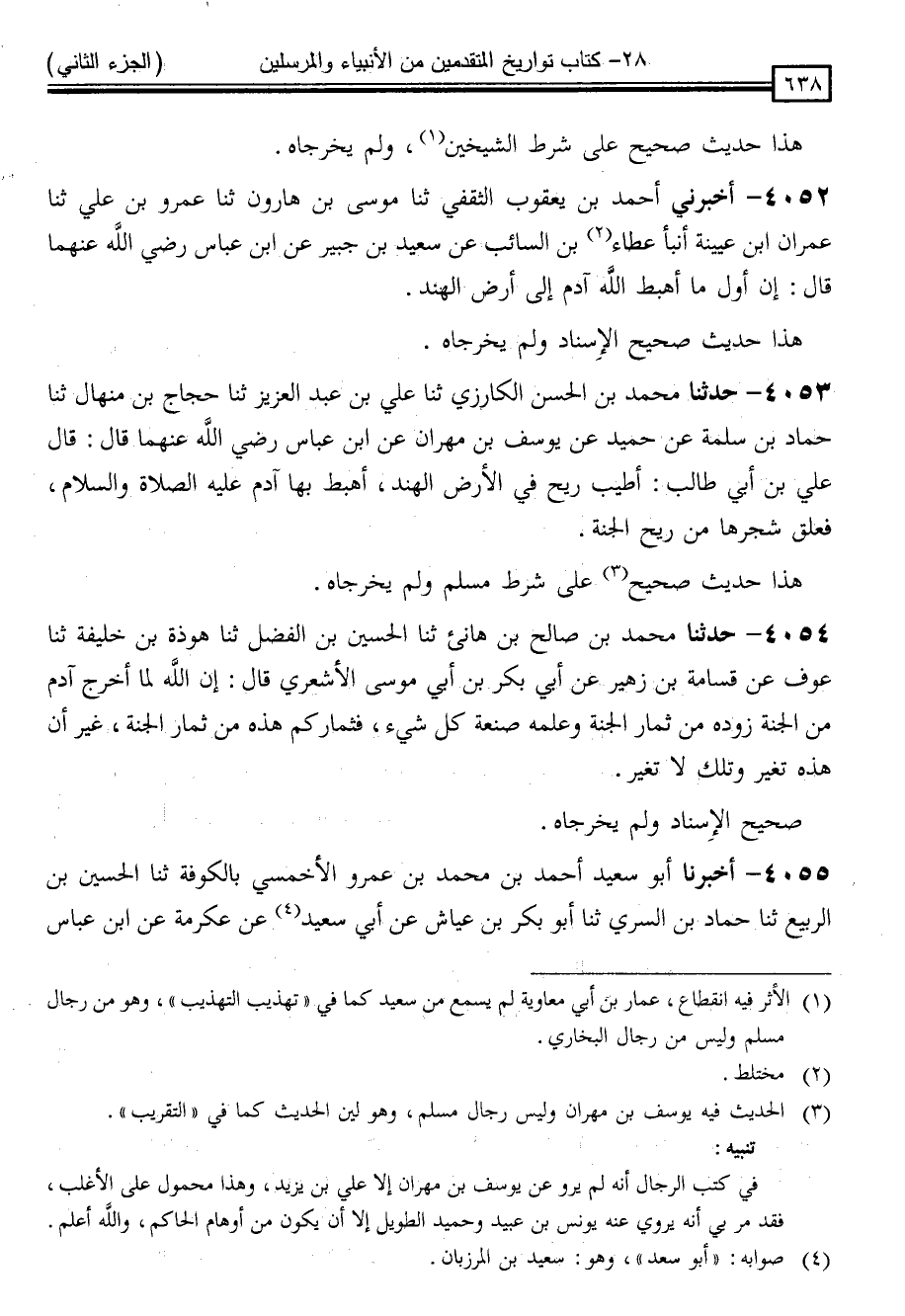 4052 - أَخْبَرَنِي أَحْمَدُ بْنُ يَعْقُوبَ الثَّقَفِيُّ ، ثنا مُوسَى بْنُ هَارُونَ ، ثنا عَمْرُو بْنُ عَلِيٍّ ، ثنا عِمْرَانُ بْنُ عُيَيْنَةَ ، أَنْبَأَ عَطَاءُ بْنُ السَّائِبِ ، عَنْ سَعِيدِ بْنِ جُبَيْرٍ ، عَنِ ابْنِ عَبَّاسٍ رَضِيَ اللَّهُ عَنْهُمَا ، قَالَ: " إِنَّ أَوَّلَ مَا أَهْبَطَ اللَّهُ آدَمَ إِلَى أَرْضِ الْهِنْدِ "