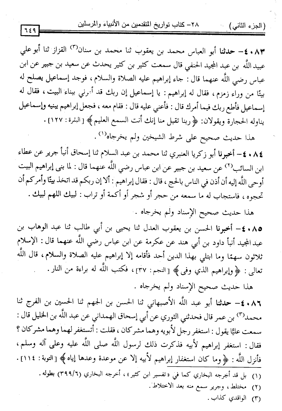 4083 - حَدَّثَنَا أَبُو الْعَبَّاسِ مُحَمَّدُ بْنُ يَعْقُوبَ ، ثنا مُحَمَّدُ بْنُ سِنَانٍ الْقَزَّازُ ، ثنا أَبُو عَلِيٍّ عُبَيْدُ اللَّهِ بْنُ عَبْدِ الْمَجِيدِ الْحَنَفِيُّ قَالَ: سَمِعْتُ كَثِيرَ بْنَ كَثِيرٍ ، يُحَدِّثُ عَنْ سَعِيدِ بْنِ جُبَيْرٍ ، عَنِ ابْنِ عَبَّاسٍ رَضِيَ اللَّهُ عَنْهُمَا ، قَالَ: " جَاءَ إِبْرَاهِيمُ عَلَيْهِ الصَّلَاةُ وَالسَّلَامُ ، فَوَجَدَ إِسْمَاعِيلَ يُصْلِحُ لَهُ بَيْتًا مِنْ وَرَاءِ زَمْزَمَ ، فَقَالَ لَهُ إِبْرَاهِيمُ: يَا إِسْمَاعِيلُ إِنَّ رَبَّكَ قَدْ أَمَرَنِي بِبِنَاءِ الْبَيْتِ . فَقَالَ لَهُ إِسْمَاعِيلُ: فَأَطِعْ رَبَّكَ فِيمَا أَمَرَكَ . قَالَ: فَأَعِنِّي عَلَيْهِ . قَالَ: فَقَامَ مَعَهُ فَجَعَلَ إِبْرَاهِيمُ يَبْنِيهِ وَإِسْمَاعِيلُ يُنَاوِلُهُ الْحِجَارَةَ وَيَقُولَانِ: { رَبَّنَا تَقَبَّلْ مِنَّا إِنَّكَ أَنْتَ السَّمِيعُ الْعَلِيمُ } [البقرة: 127] "