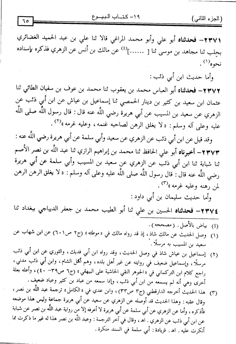 2372 - فَحَدَّثْنَاهُ أَبُو الْعَبَّاسِ مُحَمَّدُ بْنُ يَعْقُوبَ ، ثنا مُحَمَّدُ بْنُ عَوْفِ بْنِ سُفْيَانَ الطَّائِيُّ ، ثنا عُثْمَانُ بْنُ سَعِيدِ بْنِ كَثِيرِ بْنِ دِينَارٍ الْحِمْصِيُّ ، ثنا إِسْمَاعِيلُ بْنُ عَيَّاشٍ ، عَنِ ابْنِ أَبِي ذِئْبٍ ، عَنِ الزُّهْرِيِّ ، عَنْ سَعِيدِ بْنِ الْمُسَيِّبِ ، عَنْ أَبِي هُرَيْرَةَ رَضِيَ اللَّهُ عَنْهُ ، قَالَ: قَالَ رَسُولُ اللَّهِ صَلَّى اللَّهُ عَلَيْهِ وَسَلَّمَ: " لَا يُغْلَقِ الرَّهْنُ لِصَاحِبِهِ غُنْمُهُ وَعَلَيْهِ غُرْمُهُ "