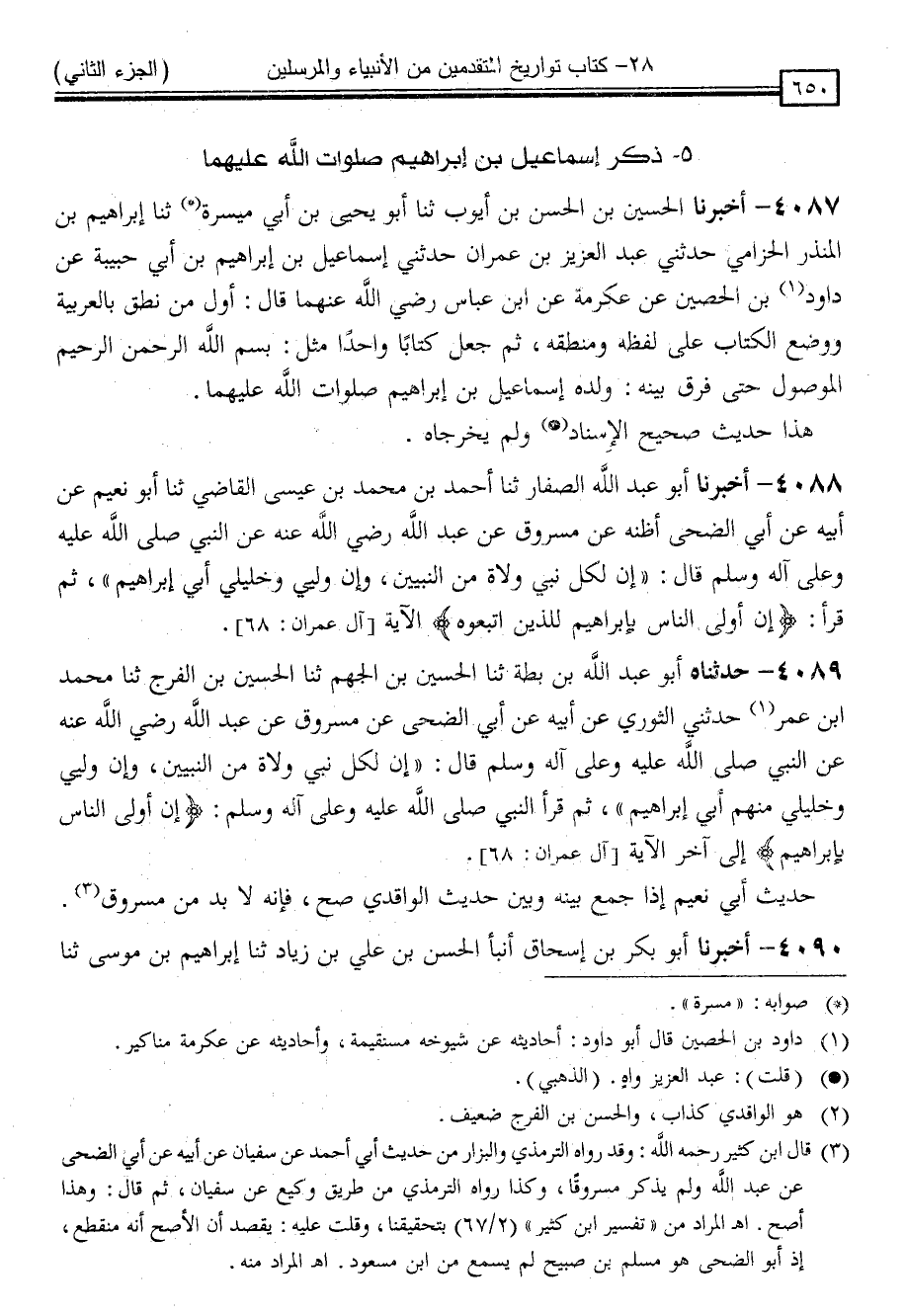 4089 - حَدَّثَنَاهُ أَبُو عَبْدِ اللَّهِ بْنُ بُطَّةَ ، ثنا الْحُسَيْنُ * بْنُ الْجَهْمِ ، ثنا الْحُسَيْنُ بْنُ الْفَرَجِ ، ثنا مُحَمَّدُ بْنُ عُمَرَ ، حَدَّثَنِي الثَّوْرِيُّ ، عَنْ أَبِيهِ ، عَنْ أَبِي الضُّحَى ، عَنْ مَسْرُوقٍ ، عَنْ عَبْدِ اللَّهِ رَضِيَ اللَّهُ عَنْهُ ، عَنِ النَّبِيِّ صَلَّى اللَّهُ عَلَيْهِ وَسَلَّمَ ، قَالَ: " إِنَّ لِكُلِّ نَبِيٍّ وُلَاةً مِنَ النَّبِيِّينَ وَإِنَّ وَلِيِّي وَخَلِيلِي مِنْهُمْ أَبِي إِبْرَاهِيمُ ، ثُمَّ قَرَأَ النَّبِيُّ صَلَّى اللَّهُ عَلَيْهِ وَسَلَّمَ { إِنَّ أَوْلَى النَّاسِ بِإِبْرَاهِيمَ } [آل عمران: 68] " إِلَى آخِرِ الْآيَةِ "
