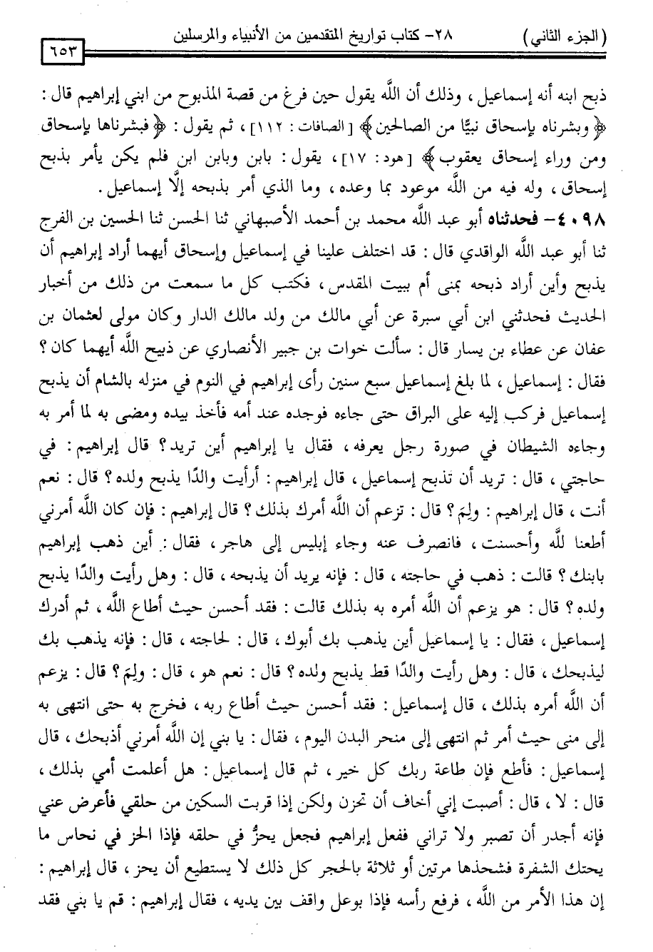 4098 - فَحَدَّثْنَاهُ أَبُو عَبْدِ اللَّهِ مُحَمَّدُ بْنُ أَحْمَدَ الْأَصْبَهَانِيُّ ، ثنا الْحَسَنُ ، ثنا الْحُسَيْنُ بْنُ الْفَرَجِ ، ثنا أَبُو عَبْدِ اللَّهِ الْوَاقِدِيُّ ، قَالَ: قَدِ اخْتَلَفَ عَلَيْنَا فِي إِسْمَاعِيلَ وَإِسْحَاقَ أَيُّهُمَا أَرَادَ إِبْرَاهِيمُ أَنْ يَذْبَحَ ، وَأَيْنَ أَرَادَ ذَبْحَهُ بِمِنًى أَمْ بِبَيْتِ الْمَقْدِسِ فَكَتَبْتُ كُلَّمَا سَمِعْتُ مِنَ ذَلِكَ مِنْ أَخْبَارِ الْحَدِيثِ فَحَدَّثَنِي ابْنُ أَبِي سَبْرَةَ ، عَنْ أَبِي مَالِكٍ مِنْ وَلَدِ مَالِكِ الدَّارِ وَكَانَ مَوْلًى لِعُثْمَانَ بْنِ عَفَّانَ ، عَنْ عَطَاءِ بْنِ يَسَارٍ قَالَ: سَأَلْتُ خَوَّاتَ بْنَ جُبَيْرٍ الْأَنْصَارِيَّ ، عَنْ ذَبِيحِ اللَّهِ أَيُّهُمَا كَانَ ؟ فَقَالَ: إِسْمَاعِيلُ ، لَمَّا بَلَغَ إِسْمَاعِيلُ سَبْعَ سِنِينَ رَأَى إِبْرَاهِيمُ فِي النَّوْمِ فِي مَنْزِلِهِ بِالشَّامِ أَنَّهُ يَذْبَحُ إِسْمَاعِيلَ فَرَكِبَ إِلَيْهِ عَلَى الْبُرَاقِ حَتَّى جَاءَهُ فَوَجَدَهُ عِنْدَ أُمِّهِ ، فَأَخَذَ بِيَدِهِ وَمَضَى بِهِ لِمَا أُمِرَ بِهِ وَجَاءَهُ الشَّيْطَانُ فِي صُورَةِ رَجُلٍ يَعْرِفُهُ ، فَقَالَ: يَا إِبْرَاهِيمُ ، أَيْنَ تُرِيدُ ؟ قَالَ إِبْرَاهِيمُ: " فِي حَاجَتِي " . قَالَ: تُرِيدُ أَنْ تَذْبَحَ إِسْمَاعِيلَ . قَالَ إِبْرَاهِيمُ: " أَرَأَيْتَ وَالِدًا يَذْبَحُ وَلَدَهُ ؟ " قَالَ: نَعَمْ ، أَنْتَ ، قَالَ إِبْرَاهِيمُ: " وَلِمَ ؟ " قَالَ: تَزْعُمُ أَنَّ اللَّهَ أَمَرَكَ بِذَلِكَ ، قَالَ إِبْرَاهِيمُ: " فَإِنْ كَانَ اللَّهُ أَمَرَنِي أَطَعْنَا لِلَّهِ وَأَحْسَنْتُ " ، فَانْصَرَفَ عَنْهُ وَجَاءَ إِبْلِيسُ إِلَى هَاجَرَ فَقَالَ: أَيْنَ ذَهَبَ إِبْرَاهِيمُ بِابْنِكِ ؟ قَالَتْ: ذَهَبَ فِي حَاجَتِهِ ، قَالَ: فَإِنَّهُ يُرِيدُ أَنْ يَذْبَحَهُ ، قَالَتْ: وَهَلْ رَأَيْتَ وَالِدًا يَذْبَحُ وَلَدَهُ ؟ قَالَ: هُوَ يَزْعُمُ أَنَّ اللَّهَ أَمَرَهُ بِذَلِكَ ، قَالَتْ: فَقَدْ أَحْسَنَ حَيْثُ أَطَاعَ اللَّهَ ، ثُمَّ أَدْرَكَ إِسْمَاعِيلَ فَقَالَ: يَا إِسْمَاعِيلُ أَيْنَ يَذْهَبُ بِكَ أَبُوكَ ؟ قَالَ: لِحَاجَتِهِ ، قَالَ: فَإِنَّهُ يَذْهَبُ بِكَ لِيَذْبَحَكَ ، قَالَ: وَهَلْ رَأَيْتَ وَالِدًا قَطُّ يَذْبَحُ وَلَدَهُ ؟ قَالَ: نَعَمْ هُوَ ، قَالَ: وَلِمَ ؟ قَالَ: يَزْعُمُ أَنَّ اللَّهَ أَمَرَهُ بِذَلِكَ ، قَالَ إِسْمَاعِيلُ: فَقَدْ أَحْسَنَ حَيْثُ أَطَاعَ رَبَّهُ ، قَالَ: فَخَرَجَ بِهِ حَتَّى انْتَهَى بِهِ إِلَى مِنًى حَيْثُ أَمَرَ ، ثُمَّ انْتَهَى إِلَى مَنْحَرِ الْبُدْنِ الْيَوْمَ ، فَقَالَ: " أَبُنَيَّ ، إِنَّ اللَّهَ أَمَرَنِي أَنْ أَذْبَحَكَ " ، قَالَ إِسْمَاعِيلُ: فَأَطِعْ فَإِنَّ طَاعَةَ رَبِّكَ كُلُّ خَيْرٍ ، ثُمَّ قَالَ إِسْمَاعِيلُ: هَلْ أَعْلَمْتَ أُمِّي بِذَلِكَ ؟ قَالَ: " لَا " ، قَالَ: أَصَبْتَ ، إِنِّي أَخَافُ أَنْ تَحْزَنَ وَلَكِنْ إِذَا قَرِّبْتَ السِّكِّينَ مِنْ حَلْقِي فَأَعْرِضْ عَنِّي ، فَإِنَّهُ أَجْدَرُ أَنْ تَصْبِرَ وَلَا تَرَانِي فَفَعَلَ إِبْرَاهِيمُ ، فَجَعَلَ يَحُزُّ فِي حَلْقِهِ ، فَإِذَا الْحَزُّ فِي نُحَاسٍ مَا يَحْتَكُّ الشَّفْرَةُ فَشَحَذَهَا مَرَّتَيْنِ أَوْ ثَلَاثَةً بِالْحَجَرِ كُلُّ ذَلِكَ لَا يَسْتَطِيعُ أَنْ يَحُزَّ ، قَالَ إِبْرَاهِيمُ: " إِنَّ هَذَا الْأَمْرَ مِنَ اللَّهِ فَرَفَعَ رَأْسَهُ " ، فَإِذَا بِوَعْلٍ وَاقِفٍ بَيْنَ يَدَيْهِ فَقَالَ إِبْرَاهِيمُ: " قُمْ يَا بُنَيَّ فَقَدْ -[654]- نَزَلَ فِدَاكَ " فَذَبَحَهُ هُنَاكَ بِمِنًى