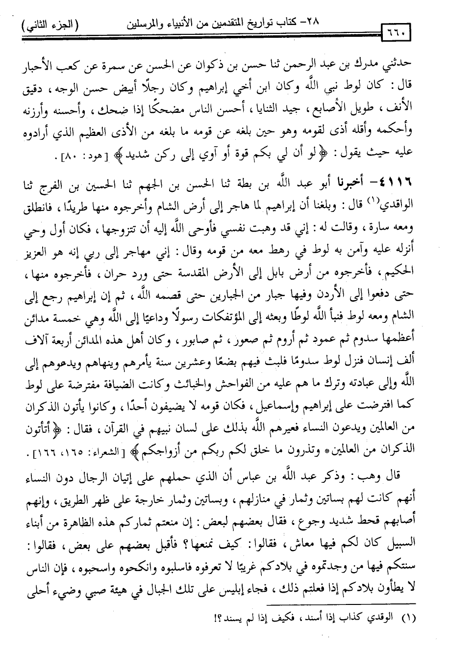4116 - أَخْبَرَنَا أَبُو عَبْدِ اللَّهِ بْنُ بُطَّةَ ، ثنا الْحَسَنُ بْنُ الْجَهْمِ ، ثنا الْحُسَيْنُ بْنُ الْفَرَجِ ، ثنا الْوَاقِدِيُّ ، قَالَ: وَبَلَغَنَا أَنَّ إِبْرَاهِيمَ لَمَّا هَاجَرَ إِلَى أَرْضِ الشَّامِ ، وَأَخْرَجُوهُ مِنْهَا طَرِيدًا فَانْطَلَقَ وَمَعَهُ سَارَةُ وَقَالَتْ لَهُ: إِنِّي قَدْ وَهَبَتْ نَفْسِي فَأَوْحَى اللَّهُ إِلَيْهِ أَنْ تَتَزَوَّجَهَا ، فَكَانَ أَوَّلَ وَحْيٍ أَنْزَلَهُ عَلَيْهِ وَآمَنَ بِهِ لُوطٌ فِي رَهْطٍ مَعَهُ مِنْ قَوْمِهِ ، وَقَالَ: " إِنِّي مُهَاجِرٌ إِلَى رَبِّي إِنَّهُ هُوَ الْعَزِيزُ الْحَكِيمُ ، فَأَخْرَجُوهُ مِنْ أَرْضِ بَابِلَ إِلَى الْأَرْضِ الْمُقَدَّسَةِ حَتَّى وَرَدَ حَرَّانَ ، فَأَخْرَجُوهُ مِنْهَا حَتَّى دَفَعُوا إِلَى الْأُرْدُنِّ وَفِيهَا جَبَّارٌ مِنَ الْجَبَّارِينَ ، حَتَّى قَصَمَهُ اللَّهُ ، ثُمَّ إِنَّ إِبْرَاهِيمَ رَجَعَ إِلَى الشَّامِ وَمَعَهُ لُوطٌ فَنَبَأَ اللَّهُ لُوطًا وَبَعْثَهُ إِلَى الْمُؤْتَفِكَاتِ رَسُولًا وَدَاعِيًا إِلَى اللَّهِ وَهِيَ خَمْسَةُ مَدَائِنَ أَعْظَمُهَا سَدُومُ ، ثُمَّ عَمُودُ ، ثُمَّ أَرُومُ ، ثُمَّ صَعُورُ ، ثُمَّ صَابُورُ ، وَكَانَ أَهْلُ هَذِهِ الْمَدَائِنِ أَرْبَعَةَ آلَافِ أَلْفَ إِنْسَانٍ فَنَزَلَ لُوطٌ سَدُومًا ، فَلَبِثَ فِيهِمْ بِضْعًا وَعِشْرِينَ سَنَةً يَأْمُرُهُمْ وَيَنْهَاهُمْ وَيَدْعُوهُمْ إِلَى اللَّهِ وَإِلَى عِبَادَتِهِ وَتَرَكَ مَا هُمْ عَلَيْهِ مِنَ الْفَوَاحِشِ وَالْخَبَائِثِ ، وَكَانَتِ الضِّيَافَةُ مُفْتَرَضَةً عَلَى لُوطٍ كَمَا افْتُرِضَتْ عَلَى إِبْرَاهِيمَ وَإِسْمَاعِيلَ ، فَكَانَ قَوْمُهُ لَا يُضِيفُونَ أَحَدًا وَكَانُوا يَأْتُونَ الذُّكْرَانَ مِنَ الْعَالَمِينَ وَيَدْعُونَ النِّسَاءَ فَعَيَّرَهُمُ اللَّهُ بِذَلِكَ عَلَى لِسَانِ نَبِيِّهِمْ فِي الْقُرْآنِ ، فَقَالَ: { أَتَأْتُونَ الذُّكْرَانَ مِنَ الْعَالَمِينَ وَتَذَرُونَ مَا خَلَقَ لَكُمْ رَبُّكُمْ مِنْ أَزْوَاجِكُمْ } [الشعراء: 166] قَالَ وَهْبٌ: وَذَكَرَ عَبْدُ اللَّهِ بْنُ عَبَّاسٍ أَنَّ الَّذِي حَمَلَهُمْ عَلَى إِتْيَانِ الرِّجَالِ دُونَ النِّسَاءِ أَنَّهُمْ كَانَتْ لَهُمْ بَسَاتِينُ وَثِمَارٌ فِي مَنَازِلِهِمْ وَبَسَاتِينَ وَثِمَارٌ خَارِجَةً عَلَى ظَهْرِ الطَّرِيقِ ، وَأَنَّهُمْ أَصَابَهُمْ قَحْطٌ شَدِيدٌ وَجُوعٌ ، فَقَالَ بَعْضُهُمْ لِبَعْضٍ: إِنْ مَنَعْتُمْ ثِمَارَكُمْ هَذِهِ الظَّاهِرَةَ مِنْ أَبْنَاءِ السَّبِيلِ كَانَ لَكُمْ فِيهَا مَعَاشٌ ، فَقَالُوا: كَيْفَ نَمْنَعُهَا فَأَقْبَلَ بَعْضُهُمْ عَلَى بَعْضٍ ، فَقَالُوا: اجْعَلُوا سُنَّتُكُمْ فِيهَا مَنْ وَجَدْتُمُوهُ فِي بِلَادِكُمْ غَرِيبًا لَا تَعْرِفُوهُ فَاسْلُبُوهُ وَانْكِحُوهُ وَاسْحَبُوهُ ، فَإِنَّ النَّاسَ لَا يَطَئُونَ بِلَادَكُمْ إِذَا فَعَلْتُمْ ذَلِكَ ، فَجَاءَهُمْ إِبْلِيسُ عَلَى تِلْكَ الْجِبَالِ فِي هَيْئَةِ صَبِيٍّ وَضِيءٍ أَحْلَى -[661]- صَبِيٍّ رَآهُ النَّاسُ وَأَوْسَمَهُ فَعَمَدُوهُ فَنَكَحُوهُ وَسَلَبُوهُ وَسَحَبُوهُ ، ثُمَّ ذَهَبَ فَكَانَ لَا يَأْتِيهِمْ مِنَ النَّاسِ إِلَّا فَعَلُوا بِهِ فَكَانَ تِلْكَ سُنَّتُهُمْ ، حَتَّى بَعَثَ اللَّهُ إِلَيْهِمْ لُوطًا فَنَهَاهُمْ لُوطٌ عَنْ ذَلِكَ وَحَذَّرَهُمُ الْعَذَابَ وَاعْتَذَرَ إِلَيْهِمْ ، فَقَالَ: يَا قَوْمِ إِنَّكُمْ لَتَأْتُونَ الْفَاحِشَةَ مَا سَبَقَكُمْ بِهَا مِنْ أَحَدٍ مِنَ الْعَالَمِينَ " ثُمَّ ذَكَرَ بَاقِي الْحَدِيثَ عَنِ ابْنِ عَبَّاسٍ "