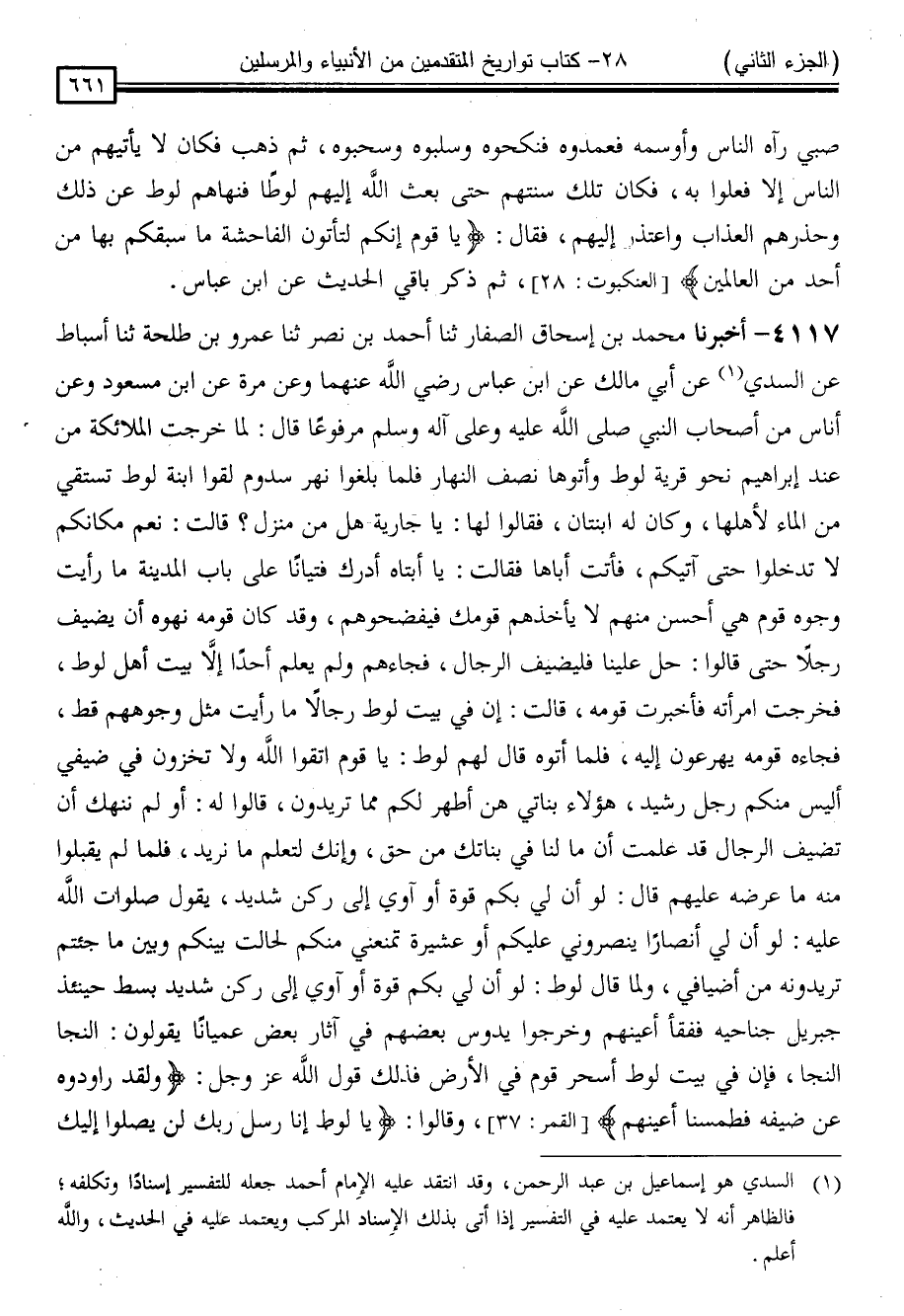 4117 - أَخْبَرَنَا مُحَمَّدُ بْنُ إِسْحَاقَ الصَّفَّارُ ، ثنا أَحْمَدُ بْنُ نَصْرٍ ، ثنا عَمْرُو بْنُ طَلْحَةَ ، ثنا أَسْبَاطٌ ، عَنِ السُّدِّيِّ ، عَنْ أَبِي مَالِكٍ ، عَنِ ابْنِ عَبَّاسٍ رَضِيَ اللَّهُ عَنْهُمَا ، وَعَنْ مُرَّةَ ، عَنِ ابْنِ مَسْعُودٍ ، وَعَنْ أُنَاسٍ ، مِنْ أَصْحَابِ النَّبِيِّ صَلَّى اللَّهُ عَلَيْهِ وَسَلَّمَ مَرْفُوعًا قَالَ: " لَمَّا خَرَجَتِ الْمَلَائِكَةُ مِنْ عِنْدِ إِبْرَاهِيمَ نَحْوَ قَرْيَةِ لُوطٍ وَأَتَوْهَا نِصْفَ النَّهَارِ ، فَلَمَّا بَلَغُوا نَهَرَ سَدُومٍ لَقَوُا ابْنَةَ لُوطٍ تَسْتَقِي مِنَ الْمَاءِ لِأَهْلِهَا وَكَانَ لَهُ ابْنَتَانِ ، فَقَالُوا لَهَا: يَا جَارِيَةُ ، هَلْ مِنْ مَنْزِلٍ ؟ قَالَتْ: نَعَمْ ، مَكَانَكُمْ لَا تَدْخُلُوا حَتَّى آتِيَكُمْ فَأَتَتْ أَبَاهَا ، فَقَالَتْ: يَا أَبَتَاهُ أَدْرِكْ فِتْيَانًا عَلَى بَابِ الْمَدِينَةِ مَا رَأَيْتُ وُجُوهَ قَوْمٍ هِيَ أَحْسَنُ مِنْهُمْ لَا يَأْخُذُهُمْ قَوْمُكَ فَيَفْضَحُوهُمْ ، وَقَدْ كَانَ قَوْمُهُ نَهَوْهُ أَنْ يُضِيفَ رَجُلًا حَتَّى قَالُوا: حَلَّ عَلَيْنَا فَلْيُضَيِّفِ الرِّجَالَ فَجَاءَهُمْ وَلَمْ يُعْلِمْ أَحَدًا إِلَّا بَيْتَ أَهْلِ لُوطٍ ، فَخَرَجَتِ امْرَأَتُهُ فَأَخْبَرَتْ قَوْمَهُ ، قَالَتْ: إِنَّ فِي بَيْتِ لُوطٍ رِجَالًا مَا رَأَيْتُ مِثْلَ وُجُوهِهِمْ قَطُّ ، فَجَاءَهُ قَوْمُهُ يُهْرَعُونَ إِلَيْهِ ، فَلَمَّا أَتَوْهُ قَالَ لَهُمْ لُوطٌ: " يَا قَوْمِ اتَّقُوا اللَّهَ وَلَا تُخْزُونِ فِي ضَيْفِي أَلَيْسَ مِنْكُمْ رَجُلٌ رُشَيْدٌ هَؤُلَاءِ بَنَاتِي هُنَّ أَطْهُرُ لَكُمْ مِمَّا تُرِيدُونَ " ، قَالُوا لَهُ: أَوَ لَمْ نَنْهَكَ إِنْ تُضَيِّفَ الرِّجَالَ قَدْ عَلِمْتَ أَنَّ مَا لَنَا فِي بَنَاتِكَ مِنْ حَقٍّ ، وَإِنَّكَ لَتَعْلَمُ مَا نُرِيدُ ، فَلَمَّا لَمْ يَقْبَلُوا مِنْهُ مَا عَرَضَهُ عَلَيْهِمْ ، قَالَ: " لَوْ أَنَّ لِيَ بِكُمْ قُوَّةً أَوْ آوِي إِلَى رُكْنٍ شَدِيدٍ " يَقُولُ صَلَوَاتُ اللَّهِ عَلَيْهِ: " لَوْ أَنَّ لِي أَنْصَارًا يَنْصُرُونِي عَلَيْكُمْ أَوْ عَشِيرَةً تَمْنَعُنِي مِنْكُمْ لَحَالَتْ بَيْنَكُمْ وَبَيْنَ مَا جِئْتُمْ تُرِيدُونَهُ مِنْ أَضْيَافِي " وَلَمَّا قَالَ لُوطٌ: " لَوْ أَنَّ لِيَ بِكُمْ قُوَّةً أَوْ آوِي إِلَى رُكْنٍ شَدِيدٍ بَسَطَ حِينَئِذٍ جِبْرِيلُ جَنَاحَيْهِ فَفَقَأَ أَعْيُنَهُمْ وَخَرَجُوا يَدُوسُ بَعْضُهُمْ فِي آثَارِ بَعْضٍ عُمْيَانًا ، يَقُولُونَ: النَّجَا النَّجَا ، فَإِنَّ فِي بَيْتِ لُوطٍ أَسْحَرَ قَوْمٍ فِي الْأَرْضِ فَذَلِكَ قَوْلُ اللَّهِ عَزَّ وَجَلَّ { وَلَقَدْ رَاوَدُوهُ عَنْ ضَيْفِهِ فَطَمَسْنَا أَعْيُنَهُمْ } [القمر: 37] وَقَالُوا: يَا لُوطُ إِنَّا رُسُلُ رَبِّكَ لَنْ يَصِلُوا إِلَيْكَ ، -[662]- فَأَسْرِ بِأَهْلِكَ بِقِطِعٍ مِنَ اللَّيْلِ وَلَا يَلْتَفِتْ مِنْكُمْ أَحَدٌ إِلَّا امْرَأَتُكَ فَاتَّبِعْ آثَارَ أَهْلِكَ ، يَقُولُ: " وَامْضُوا حَيْثُ تُؤْمَرُونَ فَأَخْرَجَهُمُ اللَّهُ إِلَى الشَّامِ " وَقَالَ لُوطٌ: أَهْلِكُوهُمُ السَّاعَةَ فَقَالُوا: إِنَّا لَمْ نُؤْمَرْ إِلَّا بِالصُّبْحِ أَلَيْسَ الصُّبْحُ بِقَرِيبٍ فَلَمَّا أَنْ كَانَ السَّحَرُ خَرَجَ لُوطٌ وَأَهْلُهُ عَدَا امْرَأَتِهِ فَذَلِكَ قَوْلُ اللَّهِ عَزَّ وَجَلَّ: { إِلَّا آلَ لُوطٍ نَجَّيْنَاهُمْ بِسَحَرٍ } [القمر: 34] "