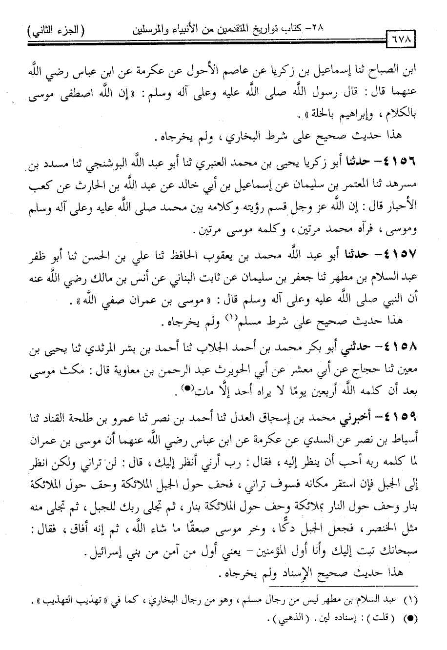 4157 - حَدَّثَنَا أَبُو عَبْدِ اللَّهِ مُحَمَّدُ بْنُ يَعْقُوبَ الْحَافِظُ ، ثنا عَلِيُّ بْنُ الْحَسَنِ ، ثنا أَبُو ظُفُرٍ عَبْدُ السَّلَامِ بْنِ مُطَهَّرٍ ، ثنا جَعْفَرُ بْنُ سُلَيْمَانَ ، عَنْ ثَابِتٍ الْبُنَانِيِّ ، عَنْ أَنَسِ بْنِ مَالِكٍ رَضِيَ اللَّهُ عَنْهُ ، أَنَّ النَّبِيَّ صَلَّى اللَّهُ عَلَيْهِ وَسَلَّمَ قَالَ: " مُوسَى بْنُ عِمْرَانَ صَفِيُّ اللَّهِ "