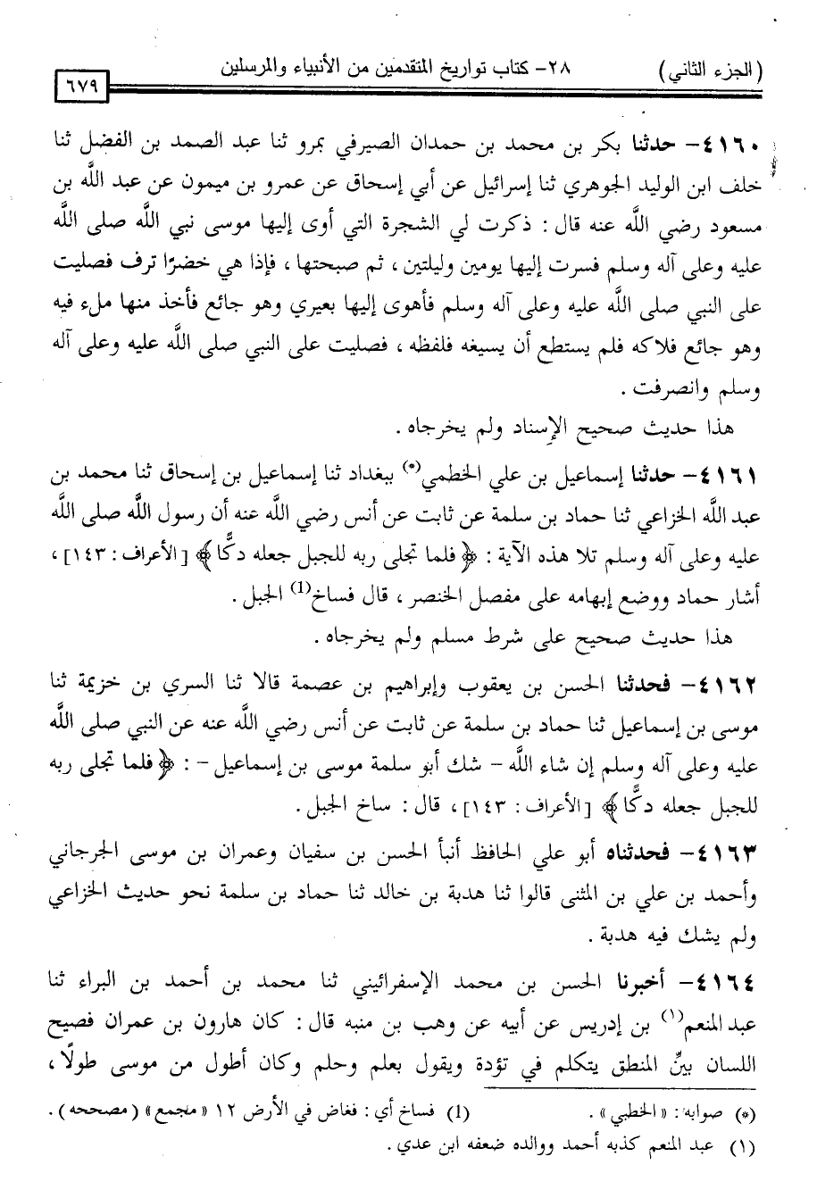 4163 - فَحَدَّثْنَاهُ أَبُو عَلِيٍّ الْحَافِظُ ، أَنْبَأَ الْحَسَنُ بْنُ سُفْيَانَ ، وَعِمْرَانُ بْنُ مُوسَى الْجُرْجَانِيُّ ، وَأَحْمَدُ بْنُ عَلِيِّ بْنِ الْمُثَنَّى قَالُوا: ثنا هُدْبَةُ بْنُ خَالِدٍ ، ثنا حَمَّادُ بْنُ سَلَمَةَ نَحْوَ حَدِيثِ الْخُزَاعِيِّ وَلَمْ يَشُكَّ فِيهِ هُدْبَةُ