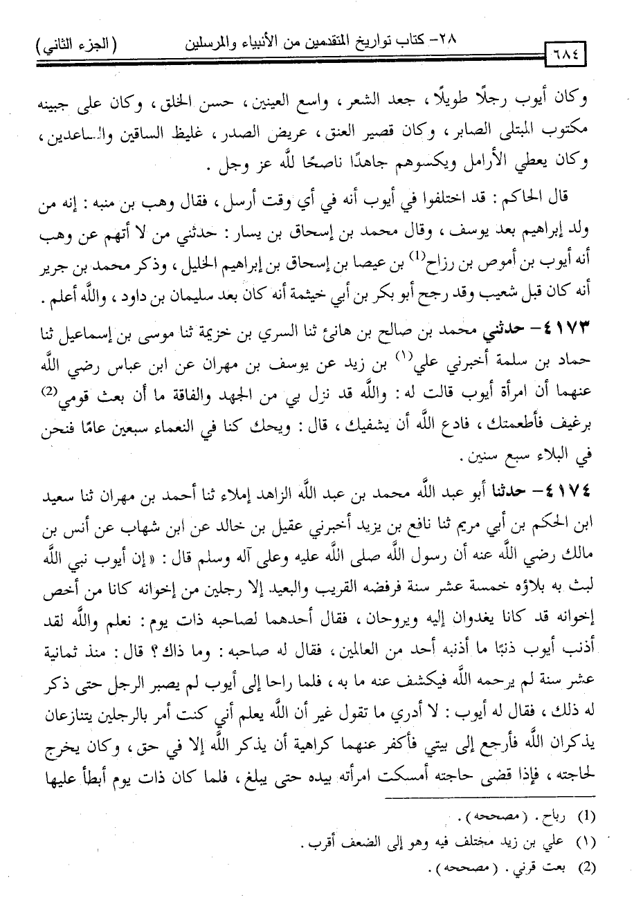 4173 - حَدَّثَنِي مُحَمَّدُ بْنُ صَالِحِ بْنِ هَانِئٍ ، ثنا السَّرِيُّ بْنُ خُزَيْمَةَ ، ثنا مُوسَى بْنُ إِسْمَاعِيلَ ، ثنا حَمَّادُ بْنُ سَلَمَةَ ، أَخْبَرَنِي عَلِيُّ بْنُ زَيْدٍ ، عَنْ يُوسُفَ بْنِ مِهْرَانَ ، عَنِ ابْنِ عَبَّاسٍ رَضِيَ اللَّهُ عَنْهُمَا ، أَنَّ امْرَأَةَ أَيُّوبَ ، قَالَتْ لَهُ: " وَاللَّهُ قَدْ نَزَلَ بِي مِنَ الْجَهْدِ وَالْفَاقَةِ مَا أَنْ بَعَثَ قَوْمِي بِرَغِيفٍ فَأَطْعَمْتُكَ فَادْعُ اللَّهَ أَنْ يَشْفِيَكَ ، قَالَ: وَيْحَكِ كُنَّا فِي النَّعْمَاءِ سَبْعِينَ عَامًا ، فَنَحْنُ فِي الْبَلَاءِ سَبْعَ سِنِينَ "