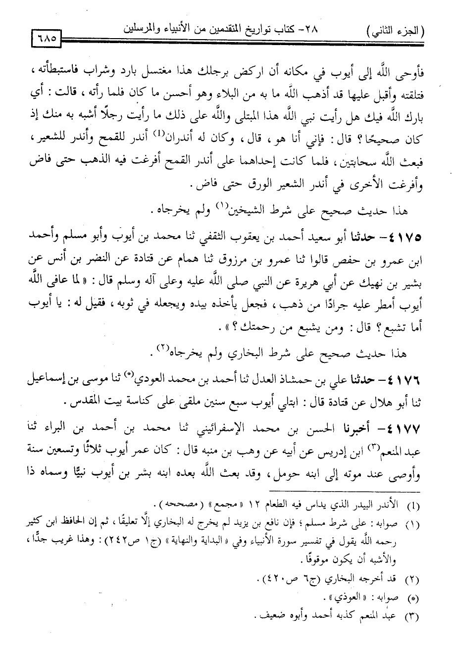 4177 - أَخْبَرَنَا الْحَسَنُ بْنُ مُحَمَّدٍ الْإِسْفَرَايِينِيُّ ، ثنا مُحَمَّدُ بْنُ أَحْمَدَ بْنِ الْبَرَاءِ ، ثنا عَبْدُ الْمُنْعِمِ بْنُ إِدْرِيسَ ، عَنْ أَبِيهِ ، عَنْ وَهْبِ بْنِ مُنَبِّهٍ ، قَالَ: " كَانَ عُمْرُ أَيُّوبَ ثَلَاثًا وَتِسْعِينَ سَنَةً ، وَأَوْصَى عِنْدَ مَوْتِهِ إِلَى ابْنِهِ حَوْمَلٍ ، وَقَدْ بَعَثَ اللَّهُ بَعْدَهُ ابْنَهُ بِشْرَ بْنَ أَيُّوبَ نَبِيًّا وَسَمَّاهُ ذَا -[686]- الْكِفْلِ ، وَأَمَرَهُ بِالدُّعَاءِ إِلَى تَوْحِيدِهِ ، وَأَنَّهُ كَانَ مُقِيمًا بِالشَّامِ ، عُمْرَهُ حَتَّى مَاتَ وَكَانَ عُمْرُهُ خَمْسًا وَسَبْعِينَ سَنَةً وَإِنَّ بِشْرًا أَوْصَى إِلَى ابْنِهِ عَبْدَانَ ثُمَّ بَعَثَ اللَّهُ بَعْدَهُمْ شُعَيْبًا "