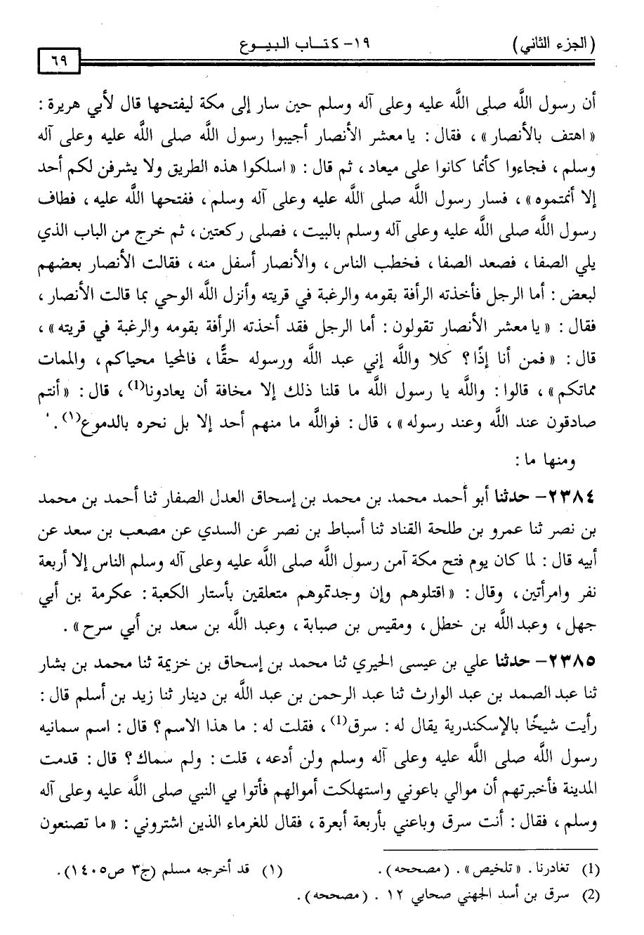 2385 - حَدَّثَنَا عَلِيُّ بْنُ عِيسَى الْحِيرِيُّ ، ثنا مُحَمَّدُ بْنُ إِسْحَاقَ بْنِ خُزَيْمَةَ ، ثنا مُحَمَّدُ بْنُ بَشَّارٍ ، ثنا عَبْدُ الصَّمَدِ بْنُ عَبْدِ الْوَارِثِ ، ثَنا عَبْدُ الرَّحْمَنِ بْنُ عَبْدِ اللَّهِ بْنِ دِينَارٍ ، ثنا زَيْدُ بْنُ أَسْلَمَ ، قَالَ: رَأَيْتُ شَيْخًا بِالْإِسْكَنْدَرِيَّةِ يُقَالُ لَهُ سَرَّقٌ فَقُلْتُ لَهُ: مَا هَذَا الِاسْمُ ؟ قَالَ: اسْمٌ سَمَّانِيهِ رَسُولُ اللَّهِ صَلَّى اللَّهُ عَلَيْهِ وَسَلَّمَ وَلَنْ أَدَعَهُ قُلْتُ وَلِمَ سَمَّاكَ ؟ قَالَ قَدِمْتُ الْمَدِينَةَ فَأَخْبَرْتُهُمْ أَنَّ مَوَالِيَّ بَاعُونِي ، وَاسْتَهْلَكْتُ أَمْوَالَهُمْ ، فَأَتَوْا بِي النَّبِيَّ صَلَّى اللَّهُ عَلَيْهِ وَسَلَّمَ فَقَالَ: " أَنْتَ سَرَّقٌ " وَبَاعَنِي بِأَرْبَعِ أَبْعِرَةٍ ، فَقَالَ لِلْغُرَمَاءِ الَّذِينَ اشْتَرُونِي: " مَا تَصْنَعُونَ -[70]- بِهِ ؟ " قَالُوا: نُعْتِقُهُ . قَالُوا: فَلَسْنَا بِأَزْهَدَ فِي الْآخِرَةِ مِنْكُمْ ، فَأَعْتَقُونِي بَيْنَهُمْ ، وَبَقِيَ اسْمِي
