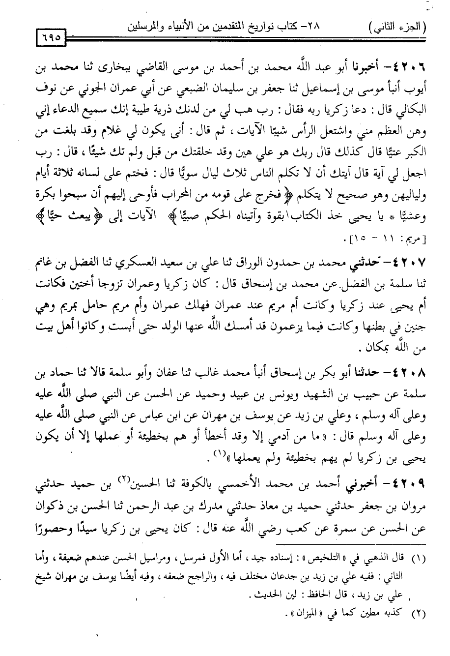 4207 - حَدَّثَنِي مُحَمَّدُ بْنُ حَمْدُونَ الْوَرَّاقُ ، ثنا عَلِيُّ بْنُ سَعِيدٍ الْعَسْكَرِيُّ ، ثنا الْفَضْلُ بْنُ غَانِمٍ ، ثنا سَلَمَةُ بْنُ الْفَضْلِ ، عَنْ مُحَمَّدِ بْنِ إِسْحَاقَ ، قَالَ: " كَانَ زَكَرِيَّا وَعِمْرَانُ تَزَوَّجَا أُخْتَيْنِ فَكَانَتْ أُمُّ يَحْيَى عِنْدَ زَكَرِيَّا وَكَانَتْ أُمُّ مَرْيَمَ عِنْدَ عِمْرَانَ فَهَلَكَ عِمْرَانُ وَأُمُّ مَرْيَمَ حَامِلٌ بِمَرْيَمَ وَهِيَ جَنِينٌ فِي بَطْنِهَا وَكَانَتْ فِيمَ يَزْعُمُونَ قَدْ أَمْسَكَ اللَّهُ عَنْهَا الْوَلَدَ حَتَّى أَيِسَتْ وَكَانُوا أَهْلَ بَيْتٍ مِنَ اللَّهِ بِمَكَانٍ "