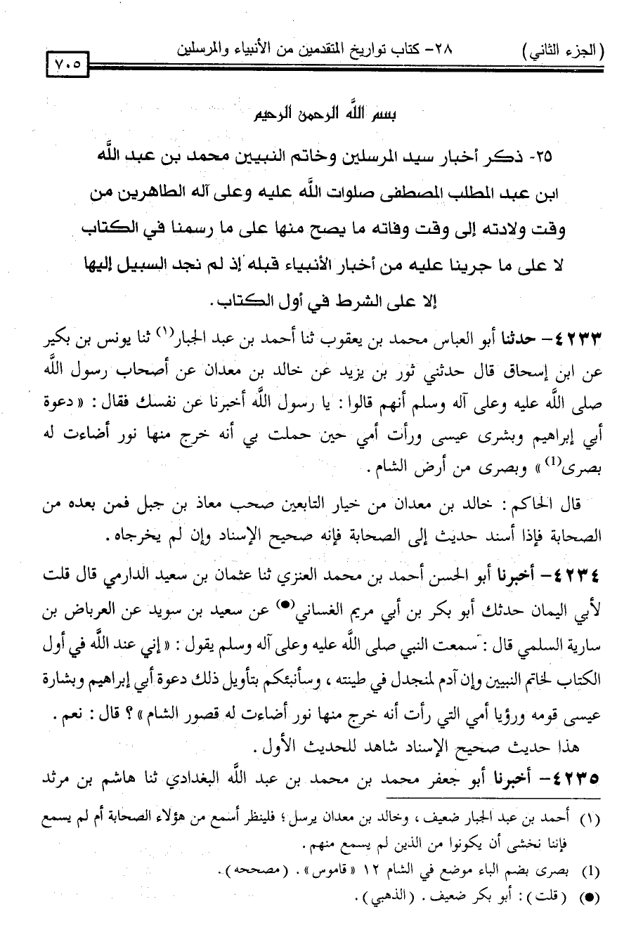 4233 - حَدَّثَنَا أَبُو الْعَبَّاسِ مُحَمَّدُ بْنُ يَعْقُوبَ ، ثنا أَحْمَدُ بْنُ عَبْدِ الْجَبَّارِ ، ثنا يُونُسُ بْنُ بُكَيْرٍ ، عَنِ ابْنِ إِسْحَاقَ ، قَالَ: حَدَّثَنِي ثَوْرُ بْنُ يَزِيدَ ، عَنْ خَالِدِ بْنِ مَعْدَانَ ، عَنْ أَصْحَابِ رَسُولِ اللَّهِ صَلَّى اللَّهُ عَلَيْهِ وَسَلَّمَ ، أَنَّهُمْ قَالُوا: يَا رَسُولَ اللَّهِ ، أَخْبِرْنَا عَنْ نَفْسِكَ ، فَقَالَ: " دَعْوَةُ أَبِي إِبْرَاهِيمَ ، وَبُشْرَى عِيسَى ، وَرَأَتْ أُمِّي حِينَ حَمَلَتْ بِي أَنَّهُ خَرَجَ مِنْهَا نُورٌ أَضَاءَتْ لَهُ بُصْرَى وَبُصْرَى مِنْ أَرْضِ الشَّامِ " قَالَ الْحَاكِمُ: " خَالِدُ بْنُ مَعْدَانَ مِنْ خِيَارِ التَّابِعِينَ ، صَحِبَ مُعَاذَ بْنَ جَبَلٍ فَمَنْ بَعْدَهُ مِنَ الصَّحَابَةِ فَإِذَا أَسْنَدَ حَدِيثًا إِلَى الصَّحَابَةِ فَإِنَّهُ صَحِيحُ الْإِسْنَادِ وَلَمْ يُخَرِّجَاهُ "