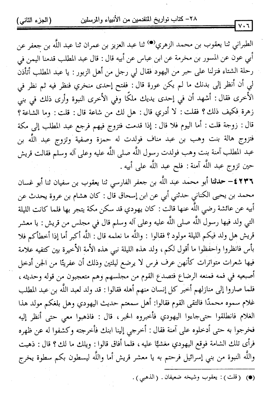 4236 - حَدَّثَنَا أَبُو مُحَمَّدٍ عَبْدُ اللَّهِ بْنُ جَعْفَرٍ الْفَارِسِيُّ ، ثنا يَعْقُوبُ بْنُ سُفْيَانَ ، ثنا أَبُو غَسَّانَ مُحَمَّدُ بْنُ يَحْيَى الْكِنَانِيُّ ، حَدَّثَنِي أَبِي ، عَنِ ابْنِ إِسْحَاقَ ، قَالَ: كَانَ هِشَامُ بْنُ عُرْوَةَ يُحَدِّثُ عَنْ أَبِيهِ ، عَنْ عَائِشَةَ رَضِيَ اللَّهُ عَنْهُمَا ، قَالَتْ: " كَانَ يَهُودِيٌّ قَدْ سَكَنَ مَكَّةَ يَتَّجِرُ بِهَا فَلَمَّا كَانَتِ اللَّيْلَةُ الَّتِي وُلِدَ فِيهَا رَسُولُ اللَّهِ صَلَّى اللَّهُ عَلَيْهِ وَسَلَّمَ قَالَ فِي مَجْلِسٍ مِنْ قُرَيْشٍ: يَا مَعْشَرَ قُرَيْشٍ ، هَلْ وُلِدَ فِيكُمُ اللَّيْلَةَ مَوْلُودٌ ؟ فَقَالُوا: وَاللَّهِ مَا نَعْلَمُهُ ، قَالَ: اللَّهُ أَكْبَرُ أَمَّا إِذَا أَخْطَأَكُمْ فَلَا بَأْسَ ، فَانْظُرُوا وَاحْفَظُوا مَا أَقُولُ لَكُمْ ، وُلِدَ هَذِهِ اللَّيْلَةَ نَبِيُّ هَذِهِ الْأُمَّةِ الْأَخِيرَةِ بَيْنَ كَتِفَيْهِ عَلَامَةٌ فِيهَا شَعَرَاتٌ مُتَوَاتِرَاتٌ كَأَنَّهُنَّ عُرْفُ فَرَسٍ ، لَا يَرْضَعُ لَيْلَتَيْنِ ، وَذَلِكَ أَنَّ عِفْرِيتًا مِنَ الْجِنِّ أَدْخَلَ أُصْبُعَيْهِ فِي فَمِهِ ، فَمَنَعَهُ الرَّضَاعَ ، فَتَصَدَّعَ الْقَوْمُ مِنْ مَجْلِسِهِمْ وَهُمْ مُتَعَجِّبُونَ مِنْ قَوْلِهِ وَحَدِيثِهِ ، فَلَمَّا صَارُوا إِلَى مَنَازِلِهِمْ أَخْبَرَ كُلُّ إِنْسَانٍ مِنْهُمْ أَهْلَهُ فَقَالُوا: قَدْ وُلِدَ لِعَبْدِ اللَّهِ بْنِ عَبْدِ الْمُطَّلِبِ غُلَامٌ سَمَّوْهُ مُحَمَّدًا فَالْتَقَى الْقَوْمُ فَقَالُوا: هَلْ سَمِعْتُمْ حَدِيثَ الْيَهُودِيِّ وَهَلْ بَلَغَكُمْ مَوْلِدُ هَذَا الْغُلَامِ فَانْطَلَقُوا حَتَّى جَاءُوا الْيَهُودِيَّ فَأَخْبَرُوهُ الْخَبَرَ قَالَ: فَاذْهَبُوا مَعِي حَتَّى أَنْظُرَ إِلَيْهِ فَخَرَجُوا حَتَّى أَدْخَلُوهُ عَلَى آمِنَةَ فَقَالَ: أَخْرِجِي إِلَيْنَا ابْنَكِ فَأَخْرَجَتْهُ ، وَكَشَفُوا لَهُ عَنْ ظَهْرِهِ فَرَأَى تِلْكَ الشَّامَةِ فَوَقَعَ الْيَهُودِيُّ مَغْشِيًّا عَلَيْهِ فَلَمَّا أَفَاقَ قَالُوا: وَيْلَكَ مَا لَكَ ؟ قَالَ: ذَهَبَتْ وَاللَّهِ النُّبُوَّةُ مِنْ بَنِي إِسْرَائِيلَ فَرُحْتُمْ بِهِ يَا مَعْشَرَ قُرَيْشٍ ، أَمَا وَاللَّهِ لَيَسْطُوَنَّ بِكُمْ سَطْوَةً يَخْرُجُ -[707]- خَبَرُهَا مِنَ الْمَشْرِقِ وَالْمَغْرِبِ وَكَانَ فِي النَّفَرِ يَوْمَئِذٍ الَّذِينَ قَالَ لَهُمُ الْيَهُودِيُّ: مَا قَالَ هِشَامُ بْنُ الْوَلِيدِ بْنِ الْمُغِيرَةِ وَمُسَافِرُ بْنُ أَبِي عَمْرٍو وَعُبَيْدَةُ بْنُ الْحَارِثِ بْنِ عَبْدِ الْمُطَّلِبِ وَعُتْبَةُ بْنُ رَبِيعَةَ شَابٌّ فَوْقَ الْمُحْتَلَمِ فِي نَفَرٍ مِنْ بَنِي مَنَافٍ وَغَيْرِهِمْ مِنْ قُرَيْشٍ "