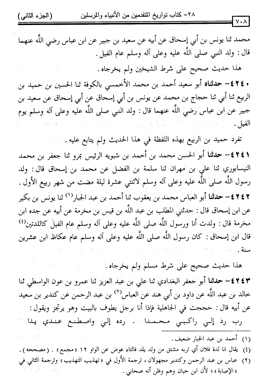 4240 - حَدَّثَنَاهُ أَبُو سَعِيدٍ أَحْمَدُ بْنُ مُحَمَّدٍ الْأَحْمَسِيُّ بِالْكُوفَةِ ، ثنا الْحُسَيْنُ بْنُ حُمَيْدِ بْنِ الرَّبِيعِ ، ثنا أَبِي ، ثنا حَجَّاجُ بْنُ مُحَمَّدٍ ، عَنْ يُونُسَ بْنِ أَبِي إِسْحَاقَ ، عَنْ أَبِي إِسْحَاقَ ، عَنْ سَعِيدِ بْنِ جُبَيْرٍ ، عَنِ ابْنِ عَبَّاسٍ رَضِيَ اللَّهُ عَنْهُمَا ، قَالَ: " وُلِدَ النَّبِيُّ صَلَّى اللَّهُ عَلَيْهِ وَسَلَّمَ يَوْمَ الْفِيلِ " تَفَرَّدَ حُمَيْدُ بْنُ الرَّبِيعِ بِهَذِهِ اللَّفْظَةِ فِي هَذَا الْحَدِيثِ وَلَمْ يُتَابَعْ عَلَيْهِ
