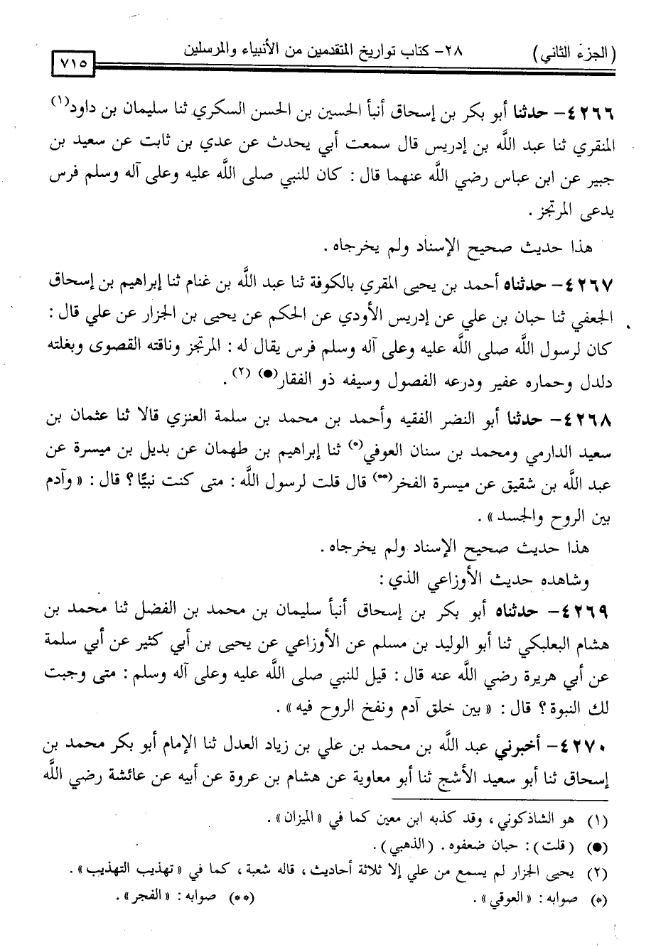 4268 - حَدَّثَنَا أَبُو النَّضْرِ الْفَقِيهُ ، وَأَحْمَدُ بْنُ مُحَمَّدِ بْنِ سَلَمَةَ الْعَنَزِيُّ ، قَالَا: ثنا عُثْمَانُ بْنُ سَعِيدٍ الدَّارِمِيُّ ، وَ * مُحَمَّدُ بْنُ سِنَانٍ الْعَوَقِيُّ ، ثنا إِبْرَاهِيمُ بْنُ طَهْمَانَ ، عَنْ بُدَيْلِ بْنِ مَيْسَرَةَ ، عَنْ عَبْدِ اللَّهِ بْنِ شَقِيقٍ ، عَنْ مَيْسَرَةَ الْفَخْرِ ** ، قَالَ: قُلْتُ لِرَسُولِ اللَّهِ صَلَّى اللَّهُ عَلَيْهِ وَسَلَّمَ: مَتَى كُنْتُ نَبِيًّا ؟ قَالَ: " وَآدَمُ بَيْنَ الرُّوحِ وَالْجَسَدِ "