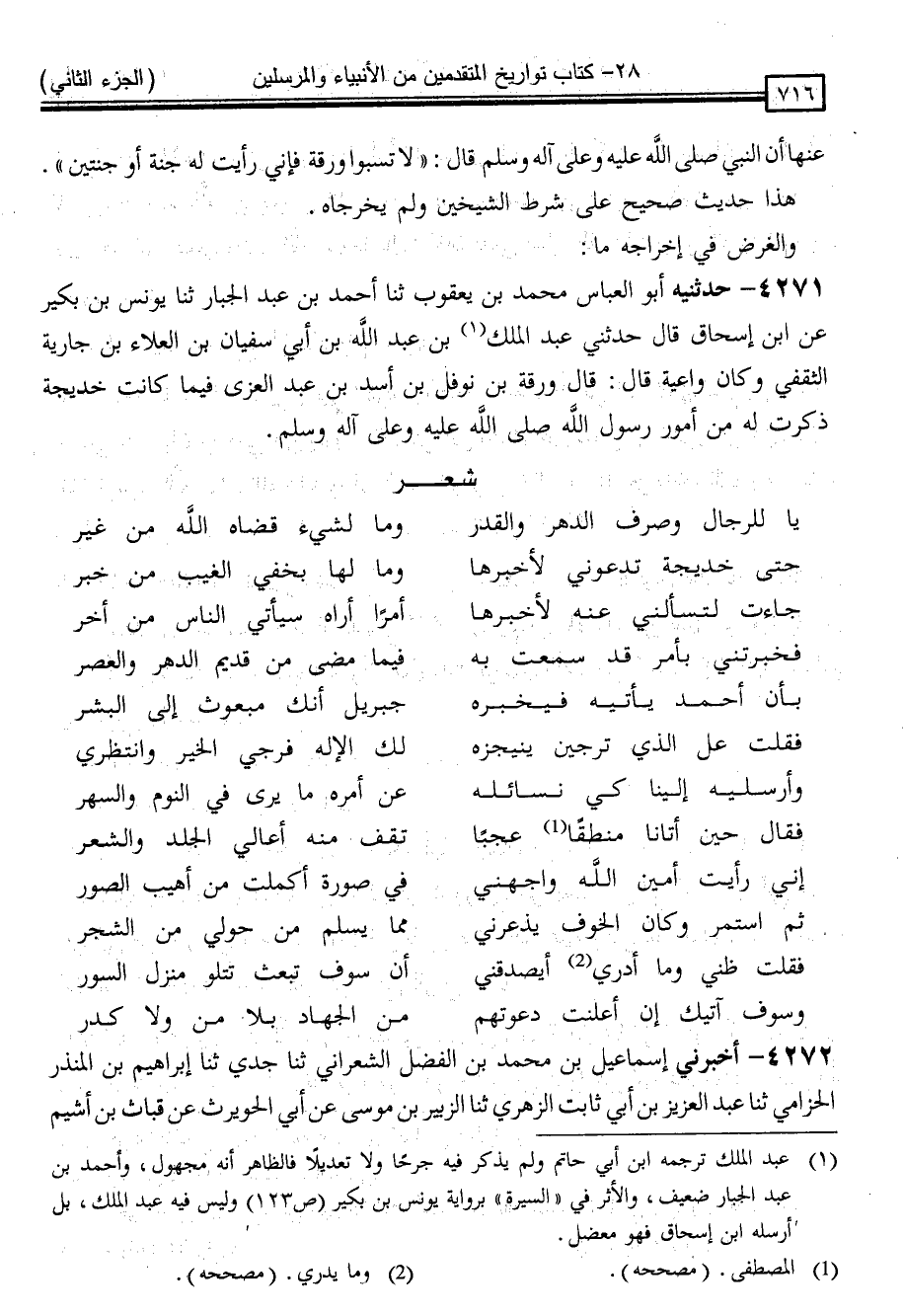 4271 - مَا حَدَّثَنِيهِ أَبُو الْعَبَّاسِ مُحَمَّدُ بْنُ يَعْقُوبَ ، ثنا أَحْمَدُ بْنُ عَبْدِ الْجَبَّارِ ، ثنا يُونُسُ بْنُ بُكَيْرٍ ، عَنِ ابْنِ إِسْحَاقَ ، قَالَ: حَدَّثَنِي عَبْدُ الْمَلِكِ بْنُ عَبْدِ اللَّهِ بْنِ أَبِي سُفْيَانَ بْنِ الْعَلَاءِ بْنِ جَارِيَةَ الثَّقَفِيُّ ، وَكَانَ وَاعِيَةً قَالَ: قَالَ وَرَقَةُ بْنُ نَوْفَلِ بْنِ أَسَدِ بْنِ عَبْدِ الْعُزَّى ، فِيمَا كَانَتْ خَدِيجَةُ ذَكَرَتْ لَهُ مِنْ أُمُورِ رَسُولِ اللَّهِ صَلَّى اللَّهُ عَلَيْهِ وَسَلَّمَ: شِعْرًا: "