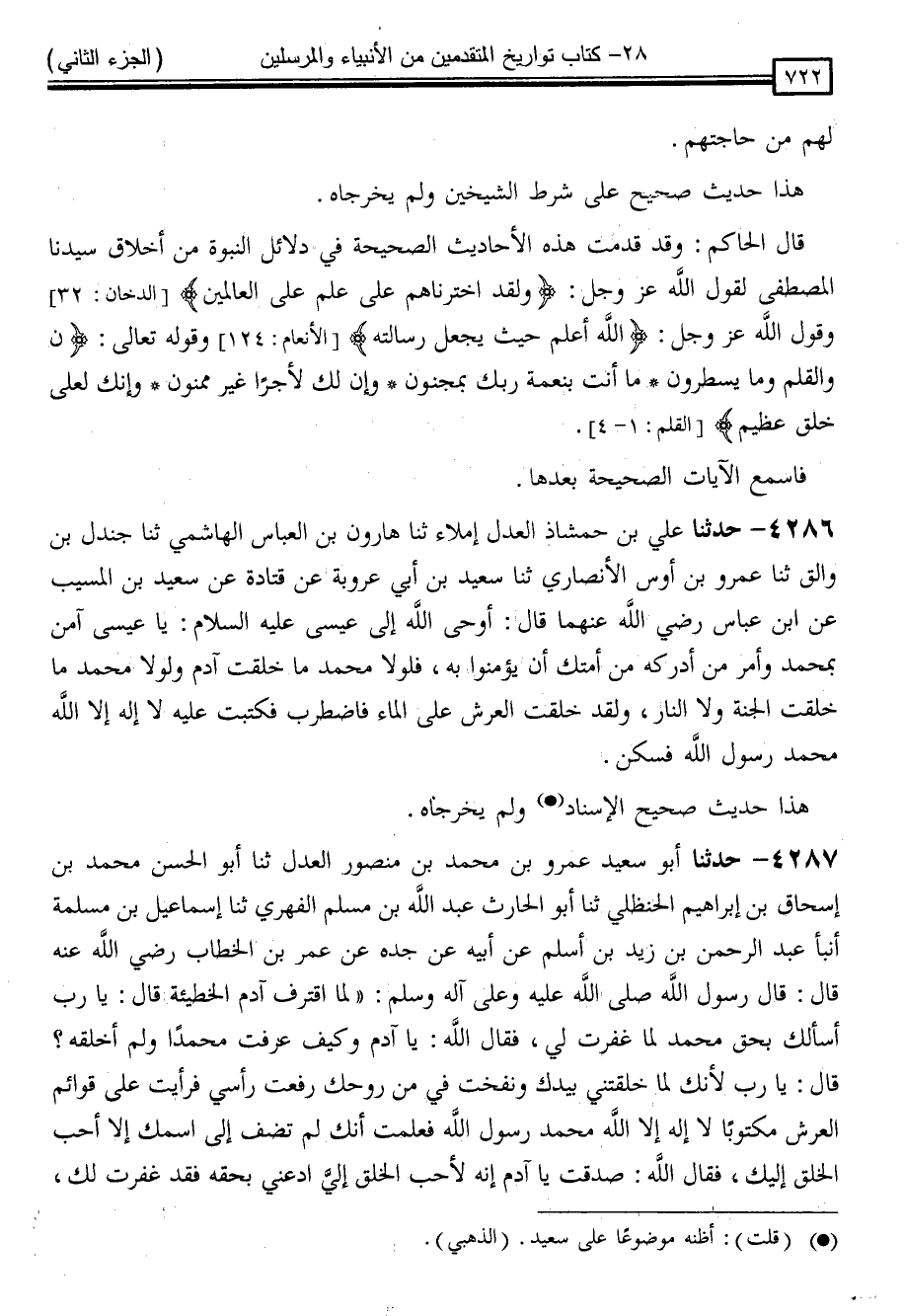 4287 - حَدَّثَنَا أَبُو سَعِيدٍ عَمْرُو بْنُ مُحَمَّدِ بْنِ مَنْصُورٍ الْعَدْلُ ، ثنا أَبُو الْحَسَنِ مُحَمَّدُ بْنُ إِسْحَاقَ بْنِ إِبْرَاهِيمَ الْحَنْظَلِيُّ ، ثنا أَبُو الْحَارِثِ عَبْدُ اللَّهِ بْنُ مُسْلِمٍ الْفِهْرِيُّ ، ثنا إِسْمَاعِيلُ بْنُ مَسْلَمَةَ ، أَنْبَأَ عَبْدُ الرَّحْمَنِ بْنُ زَيْدِ بْنِ أَسْلَمَ ، عَنْ أَبِيهِ ، عَنْ جَدِّهِ ، عَنْ عُمَرَ بْنِ الْخَطَّابِ رَضِيَ اللَّهُ عَنْهُ ، قَالَ: قَالَ رَسُولُ اللَّهِ صَلَّى اللَّهُ عَلَيْهِ وَسَلَّمَ: " لَمَّا اقْتَرَفَ آدَمُ الْخَطِيئَةَ قَالَ: يَا رَبِّ أَسْأَلُكَ بِحَقِّ مُحَمَّدٍ لَمَا غَفَرْتَ لِي ، فَقَالَ اللَّهُ: يَا آدَمُ ، وَكَيْفَ عَرَفْتَ مُحَمَّدًا وَلَمْ أَخْلُقْهُ ؟ قَالَ: يَا رَبِّ ، لِأَنَّكَ لَمَّا خَلَقْتَنِي بِيَدِكَ وَنَفَخْتَ فِيَّ مِنْ رُوحِكَ رَفَعْتُ رَأْسِي فَرَأَيْتُ عَلَىَ قَوَائِمِ الْعَرْشِ مَكْتُوبًا لَا إِلَهَ إِلَّا اللَّهُ مُحَمَّدٌ رَسُولُ اللَّهِ فَعَلِمْتُ أَنَّكَ لَمْ تُضِفْ إِلَى اسْمِكَ إِلَّا أَحَبَّ الْخَلْقِ إِلَيْكَ ، فَقَالَ اللَّهُ: صَدَقْتَ يَا آدَمُ ، إِنَّهُ لَأُحِبُّ الْخَلْقِ إِلَيَّ ادْعُنِي بِحَقِّهِ فَقَدْ غَفَرْتُ لَكَ -[723]- وَلَوْلَا مُحَمَّدٌ مَا خَلَقْتُكَ