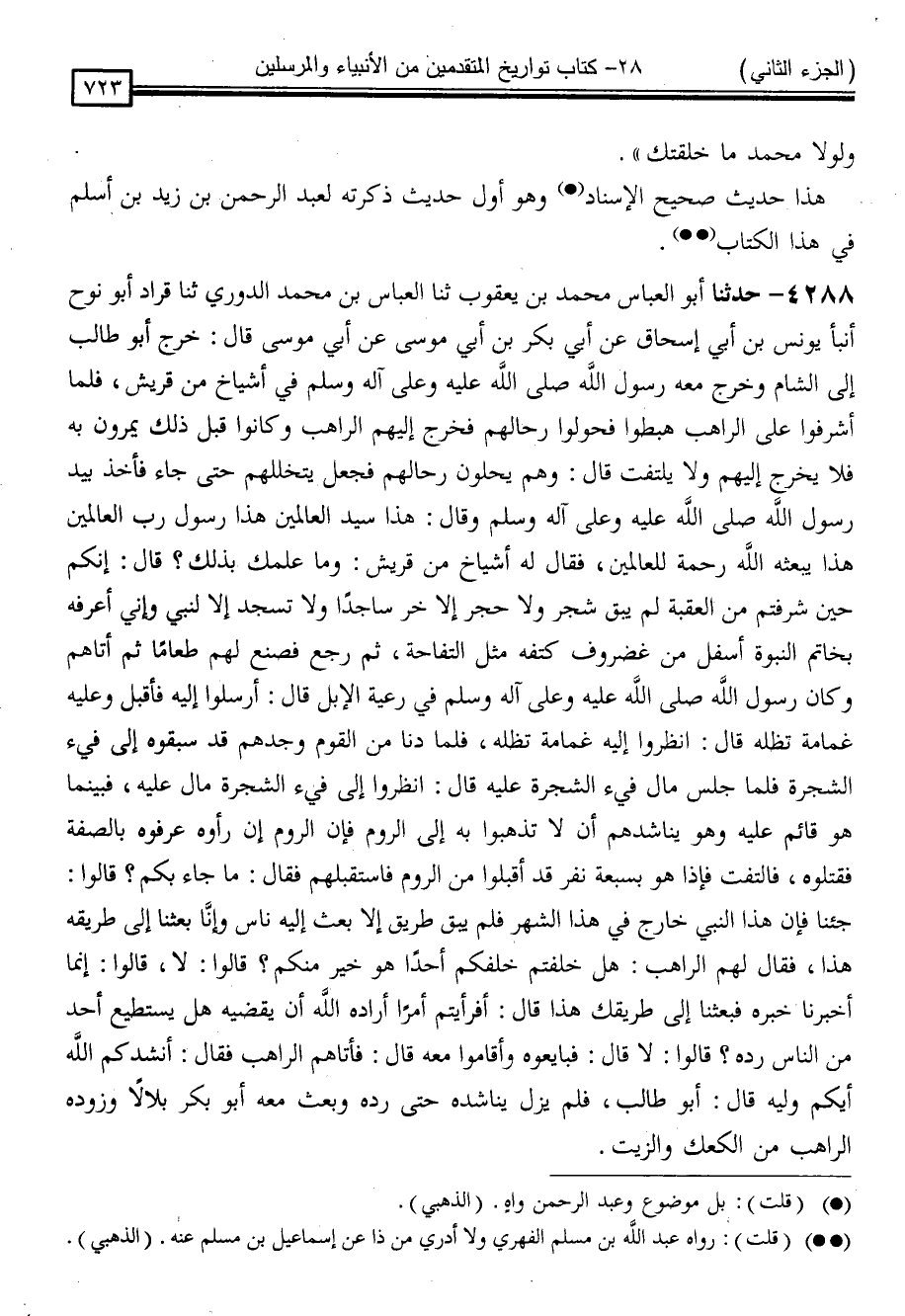 4288 - حَدَّثَنَا أَبُو الْعَبَّاسِ مُحَمَّدُ بْنُ يَعْقُوبَ ، ثنا الْعَبَّاسُ بْنُ مُحَمَّدٍ الدُّورِيُّ ، ثنا قُرَادٌ أَبُو نُوحٍ ، أَنْبَأَ يُونُسُ بْنُ أَبِي إِسْحَاقَ ، عَنْ أَبِي بَكْرِ بْنِ أَبِي مُوسَى ، عَنْ أَبِي مُوسَى ، قَالَ: " خَرَجَ أَبُو طَالِبٍ إِلَى الشَّامِ وَخَرَجَ مَعَهُ رَسُولُ اللَّهِ صَلَّى اللَّهُ عَلَيْهِ وَسَلَّمَ فِي أَشْيَاخٍ مِنْ قُرَيْشٍ فَلَمَّا أَشْرَفُوا عَلَى الرَّاهِبِ هَبَطُوا فَحَوَّلُوا رِحَالَهُمْ فَخَرَجَ إِلَيْهِمُ الرَّاهِبُ وَكَانُوا قَبْلَ ذَلِكَ يَمُرُّونَ بِهِ فَلَا يَخْرُجُ إِلَيْهِمْ وَلَا يَلْتَفِتُ قَالَ: وَهُمْ يَحِلُّونَ رِحَالَهُمْ فَجَعَلَ يَتَخَلَّلُهُمْ حَتَّى جَاءَ فَأَخَذَ بِيَدِ رَسُولِ اللَّهِ صَلَّى اللَّهُ عَلَيْهِ وَسَلَّمَ وَقَالَ: هَذَا سَيِّدُ الْعَالَمِينَ ، هَذَا رَسُولُ رَبِّ الْعَالَمِينَ ، هَذَا يَبْعَثُهُ اللَّهُ رَحْمَةً الْعَالَمِينَ ، فَقَالَ لَهُ أَشْيَاخٌ مِنْ قُرَيْشٍ: وَمَا عِلْمُكَ بِذَلِكَ ؟ قَالَ: إِنَّكُمْ حِينَ شَرَفْتُمْ مِنَ الْعَقَبَةِ لَمْ يَبْقَ شَجَرٌ ، وَلَا حَجَرٌ ، إِلَّا خَرَّ سَاجِدًا وَلَا تَسْجُدُ إِلَّا لِنَبِيٍّ وَإِنِّي أَعْرِفُهُ بِخَاتَمِ النُّبُوَّةِ ، أَسْفَلَ مِنْ غُضْرُوفِ كَتِفِهِ مِثْلِ التُّفَّاحَةِ ثُمَّ رَجَعَ فَصَنَعَ لَهُمْ طَعَامًا ثُمَّ أَتَاهُمْ وَكَانَ رَسُولُ اللَّهِ صَلَّى اللَّهُ عَلَيْهِ وَسَلَّمَ فِي رَعِيَّةِ الْإِبِلِ قَالَ: أَرْسِلُوا إِلَيْهِ فَأَقْبَلَ وَعَلَيْهِ غَمَامَةٌ تُظِلُّهُ قَالَ: انْظُرُوا إِلَيْهِ غَمَامَةٌ تُظِلُّهُ ، فَلَمَّا دَنَا مِنَ الْقَوْمِ وَجَدَهُمْ قَدْ سَبَقُوهُ إِلَى فَيْءِ الشَّجَرَةِ فَلَمَّا جَلَسَ مَالَ فَيْءُ الشَّجَرَةِ عَلَيْهِ قَالَ: انْظُرُوا إِلَى فَيْءِ الشَّجَرَةِ مَالَ عَلَيْهِ ، فَبَيْنَمَا هُوَ قَائِمٌ عَلَيْهِ وَهُوَ يُنَاشِدُهُمْ أَنْ لَا تَذْهَبُوا بِهِ إِلَى الرُّومِ فَإِنَّ الرُّومَ إِنْ رَأَوْهُ عَرَفُوهُ بِالصِّفَةِ فَقَتَلُوهُ ، فَالْتَفَتَ فَإِذَا هُوَ بِسَبْعَةِ نَفَرٍ قَدْ أَقْبَلُوا مِنَ الرُّومِ فَاسْتَقْبَلَهُمْ فَقَالَ: مَا جَاءَ بِكُمْ ؟ قَالُوا: جِئْنَا فَإِنَّ هَذَا النَّبِيَّ خَارِجٌ فِي هَذَا الشَّهْرِ فَلَمْ يَبْقَ طَرِيقٌ إِلَّا بُعِثَ إِلَيْهِ نَاسٌ وَإِنَّا بُعِثْنَا إِلَى طَرِيقِهِ هَذَا ، فَقَالَ لَهُمُ الرَّاهِبُ: هَلْ خَلَّفْتُمْ خَلْفَكُمْ أَحَدًا هُوَ خَيْرٌ مِنْكُمْ ؟ قَالُوا: لَا ، قَالُوا: إِنَّمَا أُخْبِرْنَا خَبَرَهُ فَبَعَثْنَا إِلَى طَرِيقِكَ هَذَا ، قَالَ: أَفَرَأَيْتُمْ أَمْرًا أَرَادَهُ اللَّهُ أَنْ يَقْضِيَهُ هَلْ يَسْتَطِيعُ أَحَدٌ مِنَ النَّاسِ رَدَّهُ ؟ قَالُوا: لَا ، قَالَ: فَبَايِعُوهُ فَبَايَعُوهُ وَأَقَامُوا مَعَهُ قَالَ: فَأَتَاهُمُ الرَّاهِبُ فَقَالَ: أَنْشُدُكُمُ اللَّهَ أَيُّكُمْ وَلِيُّهُ ؟ قَالَ أَبُو طَالِبٍ: فَلَمْ يَزَلْ يُنَاشِدُهُ حَتَّى رَدَّهُ وَبَعَثَ مَعَهُ أَبُو بَكْرٍ ، بِلَالًا وَزَوَّدَهُ الرَّاهِبُ مِنَ الْكَعْكِ وَالزَّيْتِ "