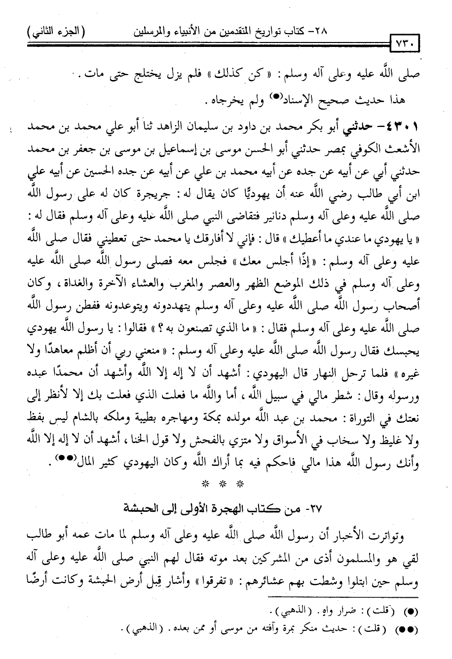 4301 - حَدَّثَنِي أَبُو بَكْرٍ مُحَمَّدُ بْنُ دَاوُدَ بْنِ سُلَيْمَانَ الزَّاهِدُ ، ثنا أَبُو عَلِيٍّ مُحَمَّدُ بْنُ مُحَمَّدٍ الْأَشْعَثُ الْكُوفِيُّ بِمِصْرَ ، حَدَّثَنِي أَبُو الْحَسَنِ مُوسَى بْنُ إِسْمَاعِيلَ بْنِ مُوسَى بْنِ جَعْفَرِ بْنِ مُحَمَّدٍ ، حَدَّثَنِي أَبِي ، عَنْ أَبِيهِ ، عَنْ جَدِّهِ ، عَنْ أَبِيهِ مُحَمَّدِ بْنِ عَلِيٍّ ، عَنْ أَبِيهِ ، عَنْ جَدِّهِ الْحُسَيْنِ ، عَنْ أَبِيهِ عَلِيِّ بْنِ أَبِي طَالِبٍ رَضِيَ اللَّهُ عَنْهُ ، أَنْ يَهُودِيًّا ، كَانَ يُقَالَ لَهُ جُرَيْجِرَةُ كَانَ لَهُ عَلَى رَسُولِ اللَّهِ صَلَّى اللَّهُ عَلَيْهِ وَسَلَّمَ دَنَانِيرُ فَتَقَاضَى النَّبِيَّ صَلَّى اللَّهُ عَلَيْهِ وَسَلَّمَ فَقَالَ لَهُ: " يَا يَهُودِيُّ ، مَا عِنْدِي مَا أُعْطِيكَ " قَالَ: فَإِنِّي لَا أُفَارِقُكَ يَا مُحَمَّدُ حَتَّى تُعْطِيَنِي ، فَقَالَ صَلَّى اللَّهُ عَلَيْهِ وَسَلَّمَ: " إِذًا أَجْلِسُ مَعَكَ " فَجَلَسَ مَعَهُ فَصَلَّى رَسُولُ اللَّهِ صَلَّى اللَّهُ عَلَيْهِ وَسَلَّمَ فِي ذَلِكَ الْمَوْضِعِ الظُّهْرَ وَالْعَصْرَ وَالْمَغْرِبَ وَالْعِشَاءَ الْآخِرَةَ وَالْغَدَاةَ وَكَانَ أَصْحَابُ رَسُولِ اللَّهِ صَلَّى اللَّهُ عَلَيْهِ وَسَلَّمَ يَتَهَدَّدُونَهُ ، وَيَتَوَعَّدُونَهُ فَفَطِنَ رَسُولُ اللَّهِ صَلَّى اللَّهُ عَلَيْهِ وَسَلَّمَ فَقَالَ: " مَا الَّذِي تَصْنَعُونَ بِهِ ؟ " فَقَالُوا: يَا رَسُولَ اللَّهِ ، يَهُودِيٌّ يَحْبِسُكَ ، فَقَالَ رَسُولُ اللَّهِ صَلَّى اللَّهُ عَلَيْهِ وَسَلَّمَ: " مَنَعَنِي رَبِّي أَنْ أَظْلِمَ مُعَاهَدًا وَلَا غَيْرَهُ " فَلَمَّا تَرَحَّلَ النَّهَارُ قَالَ الْيَهُودِيُّ: أَشْهَدُ أَنْ لَا إِلَهَ إِلَّا اللَّهُ وَأَشْهَدُ أَنَّ مُحَمَّدًا عَبْدُهُ وَرَسُولُهُ ، وَقَالَ: شَطْرُ مَالِي فِي سَبِيلِ اللَّهِ أَمَا وَاللَّهِ مَا فَعَلْتُ الَّذِي فَعَلْتُ بِكَ إِلَّا لِأَنْظُرَ إِلَى نَعْتِكَ فِي التَّوْرَاةِ: مُحَمَّدُ بْنُ عَبْدِ اللَّهِ مَوْلِدُهُ بِمَكَّةَ ، وَمُهَاجَرُهُ بِطَيْبَةَ وَمُلْكُهُ بِالشَّامِ لَيْسَ بِفَظٍّ وَلَا غَلِيظٍ وَلَا سَخَّابٍ فِي الْأَسْوَاقِ وَلَا مُتَزَيٍّ بِالْفُحْشِ ، وَلَا قَوْلِ الْخَنَا ، أَشْهَدُ أَنْ لَا إِلَهَ إِلَّا اللَّهُ وَأَنَّكَ رَسُولُ اللَّهِ ، هَذَا مَالِي فَاحْكُمْ فِيهِ بِمَا أَرَاكَ اللَّهُ ، وَكَانَ الْيَهُودِيُّ كَثِيرَ الْمَالِ