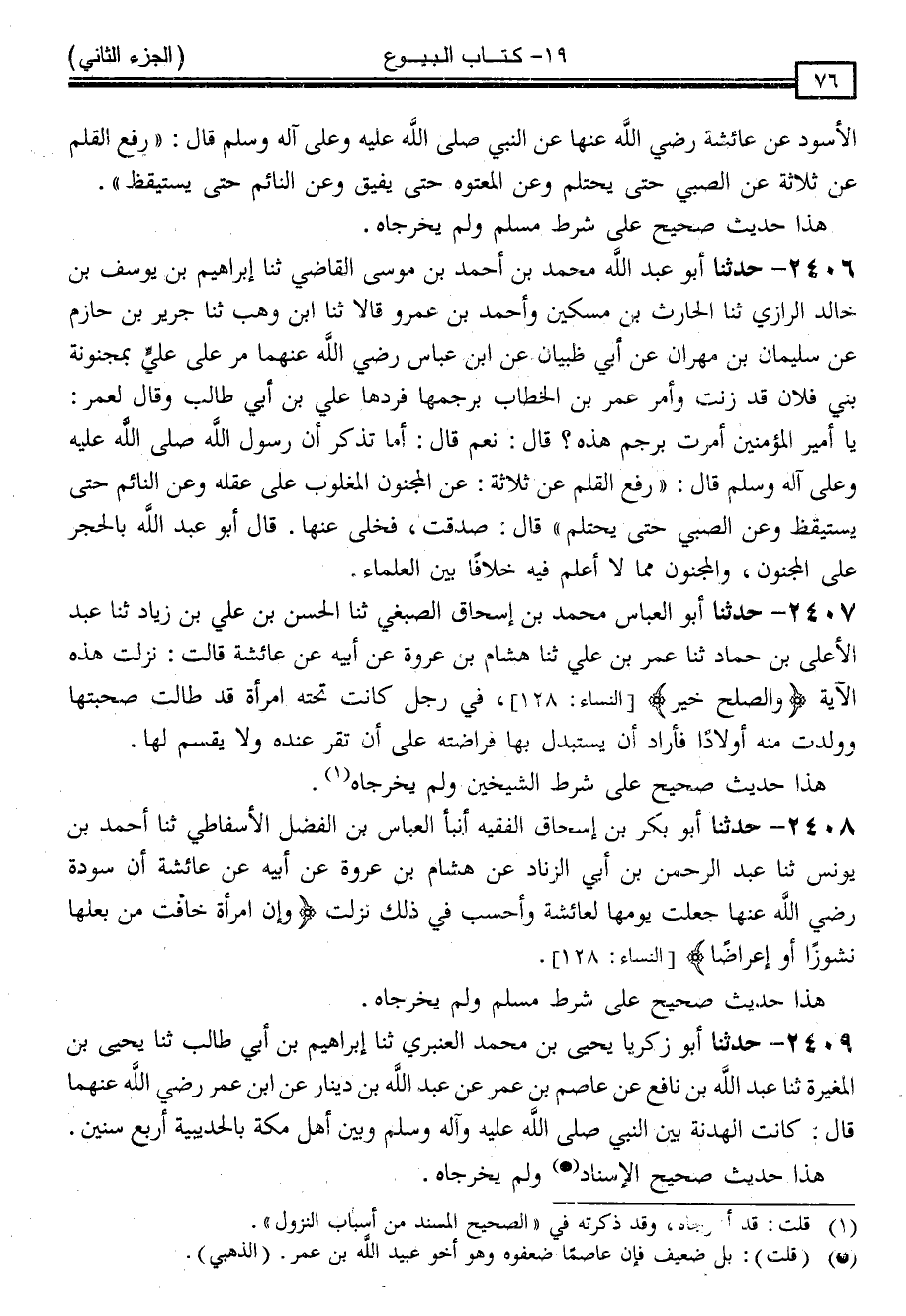2406 - حَدَّثَنَا أَبُو عَبْدِ اللَّهِ مُحَمَّدُ بْنُ أَحْمَدَ بْنِ مُوسَى الْقَاضِي ، ثنا إِبْرَاهِيمُ بْنُ يُوسُفَ بْنِ خَالِدٍ الرَّازِيُّ ، ثنا الْحَارِثُ بْنُ مِسْكِينٍ ، وَأَحْمَدُ بْنُ عَمْرٍو ، قَالَا: ثنا ابْنُ وَهْبٍ ، ثنا جَرِيرُ بْنُ حَازِمٍ ، عَنْ سُلَيْمَانَ بْنِ مِهْرَانَ ، عَنْ أَبِي ظَبْيَانَ ، عَنِ ابْنِ عَبَّاسٍ رَضِيَ اللَّهُ عَنْهُمَا ، مُرَّ عَلَى عَلِيٍّ بِمَجْنُونَةِ بَنِي فُلَانٍ ، قَدْ زَنَتْ ، وَأَمَرَ عُمَرُ بْنُ الْخَطَّابِ بِرَجْمِهَا ، فَرَدَّهَا عَلِيُّ بْنُ أَبِي طَالِبٍ ، وَقَالَ لِعُمَرَ: يَا أَمِيرَ الْمُؤْمِنِينَ أَمَرْتَ بِرَجْمِ هَذِهِ ؟ قَالَ: نَعَمْ ، قَالَ: أَمَا تَذْكُرُ أَنَّ رَسُولَ اللَّهِ صَلَّى اللَّهُ عَلَيْهِ وَسَلَّمَ قَالَ: " رُفِعَ الْقَلَمُ عَنْ ثَلَاثٍ: عَنِ الْمَجْنُونِ الْمَغْلُوبِ عَلَى عَقْلِهِ ، وَعَنِ النَّائِمِ حَتَّى يَسْتَيْقِظَ ، وَعَنِ الصَّبِيِّ حَتَّى يَحْتَلِمَ " قَالَ: صَدَقْتَ فَخَلَّى عَنْهَا . قَالَ أَبُو عَبْدِ اللَّهِ: " بِالْحَجْرِ عَلَى الْمَجْنُونِ وَالْمَجْنُونَةِ مِمَّا لَا أَعْلَمُ فِيهِ خِلَافًا بَيْنَ الْعُلَمَاءِ "