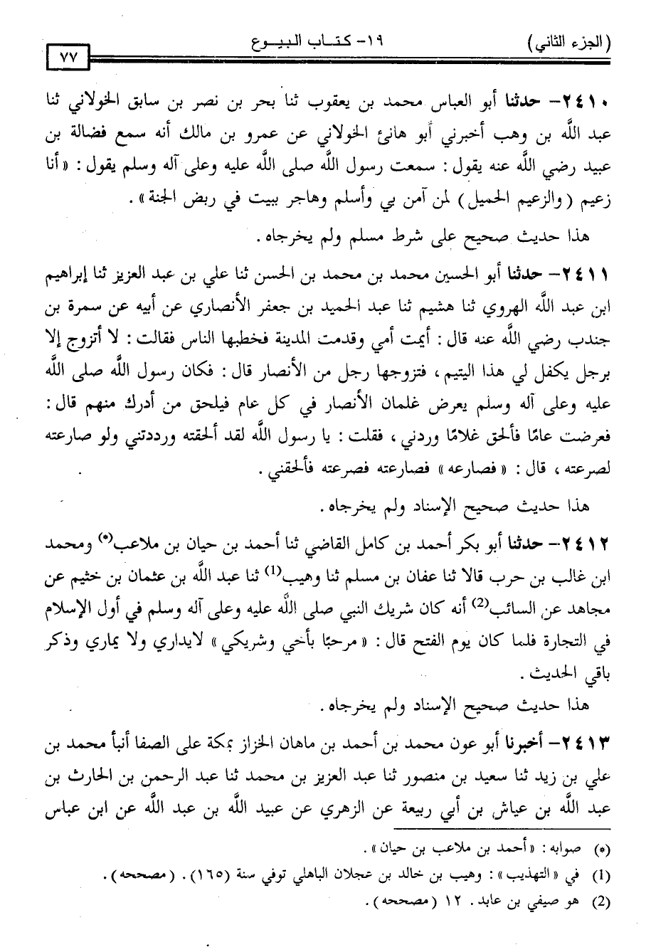 2412 - حَدَّثَنَا أَبُو بَكْرٍ أَحْمَدُ بْنُ كَامِلٍ الْقَاضِي ، ثنا أَحْمَدُ بْنُ مُلَاعِبِ بْنِ حَيَّانَ ، وَمُحَمَّدُ بْنُ غَالِبِ بْنِ حَرْبٍ ، قَالَا: ثنا عَفَّانُ بْنُ مُسْلِمٍ ، ثنا وُهَيْبٌ ، ثنا عَبْدُ اللَّهِ بْنُ عُثْمَانَ بْنِ خُثَيْمٍ ، عَنْ مُجَاهِدٍ ، عَنِ السَّائِبِ بْنِ أَبِي السَّائِبِ ، أَنَّهُ كَانَ شَرِيكَ النَّبِيِّ صَلَّى اللَّهُ عَلَيْهِ وَسَلَّمَ فِي أَوَّلِ الْإِسْلَامِ فِي التِّجَارَةِ ، فَلَمَّا كَانَ يَوْمُ الْفَتْحِ قَالَ: " مَرْحَبًا بِأَخِي وَشَرِيكِي لَا يُدَارِي وَلَا يُمَارِي " وَذَكَرَ بَاقِي الْحَدِيثِ