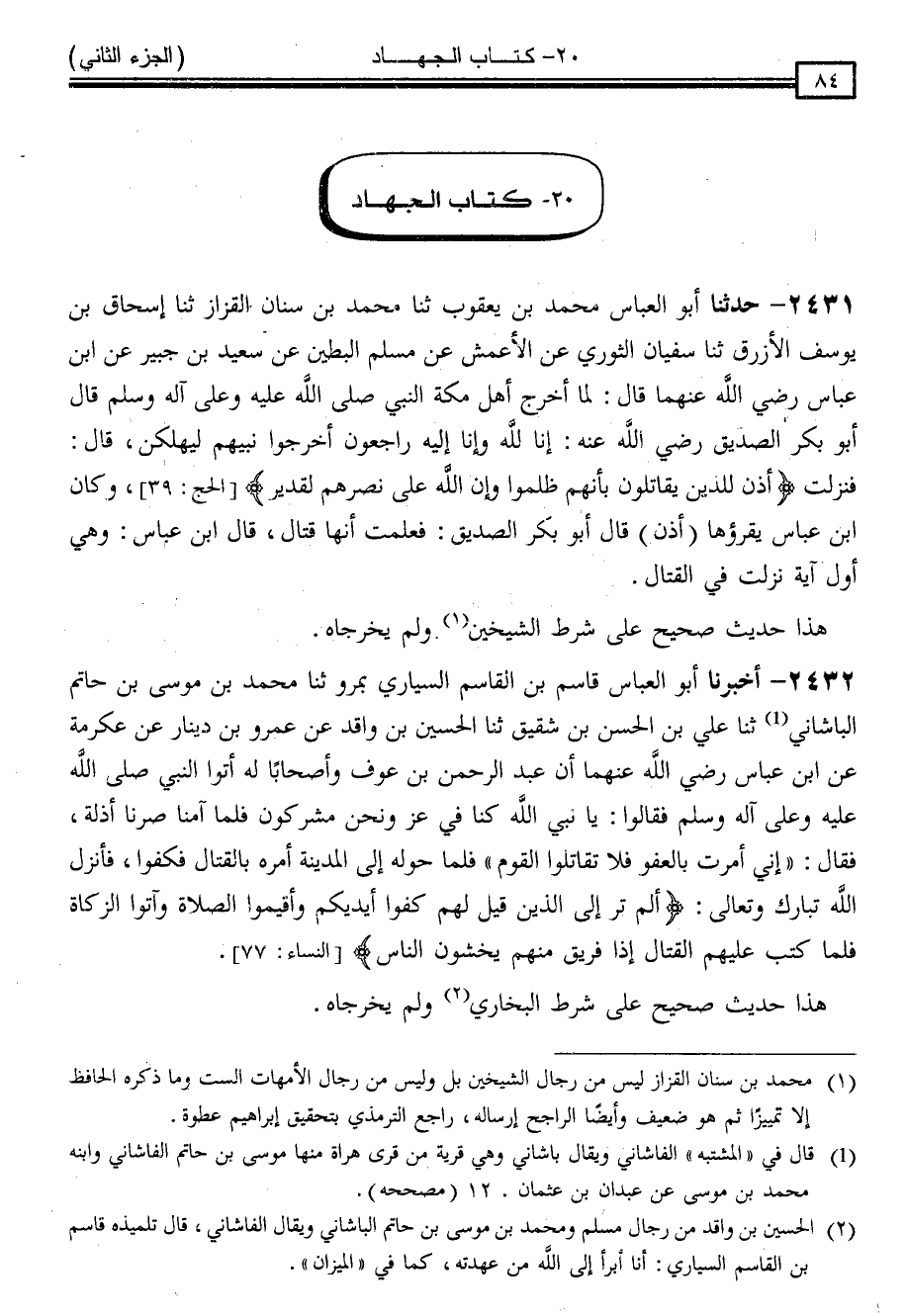 2432 - أَخْبَرَنَا أَبُو الْعَبَّاسِ قَاسِمُ بْنُ الْقَاسِمِ السَّيَّارِيُّ بِمَرْوَ ، ثنا مُحَمَّدُ بْنُ مُوسَى بْنِ حَاتِمٍ الْقَاشَانِيُّ * ، ثنا عَلِيُّ بْنُ الْحَسَنِ بْنِ شَقِيقٍ ، ثنا الْحُسَيْنُ بْنُ وَاقِدٍ ، عَنْ عَمْرِو بْنِ دِينَارٍ ، عَنْ عِكْرِمَةَ ، عَنِ ابْنِ عَبَّاسٍ رَضِيَ اللَّهُ عَنْهُمَا ، أَنَّ عَبْدَ الرَّحْمَنِ بْنَ عَوْفٍ وَأَصْحَابًا لَهُ ، أَتَوُا النَّبِيَّ صَلَّى اللَّهُ عَلَيْهِ وَسَلَّمَ فَقَالُوا: يَا نَبِيَّ اللَّهِ كُنَّا فِي عِزٍّ وَنَحْنُ مُشْرِكُونَ ، فَلَمَّا آمَنَّا صِرْنَا أَذِلَّةً . فَقَالَ: " إِنِّي أُمِرْتُ بِالْعَفْوِ ، فَلَا تُقَاتِلُوا الْقَوْمَ " فَلَمَّا حَوَّلَهُ إِلَى الْمَدِينَةِ ، أَمَرَهُ بِالْقِتَالِ ، فَكَفُّوا ، فَأَنْزَلَ اللَّهُ تَبَارَكَ وَتَعَالَى { أَلَمْ تَرَ إِلَى الَّذِينَ قِيلَ لَهُمْ كُفُّوا أَيْدِيَكُمْ وَأَقِيمُوا الصَّلَاةَ وَآتُوا الزَّكَاةَ فَلَمَّا كُتِبَ عَلَيْهِمُ الْقِتَالُ إِذَا فَرِيقٌ مِنْهُمْ يَخْشَوْنَ النَّاسَ } [النساء: 77] "