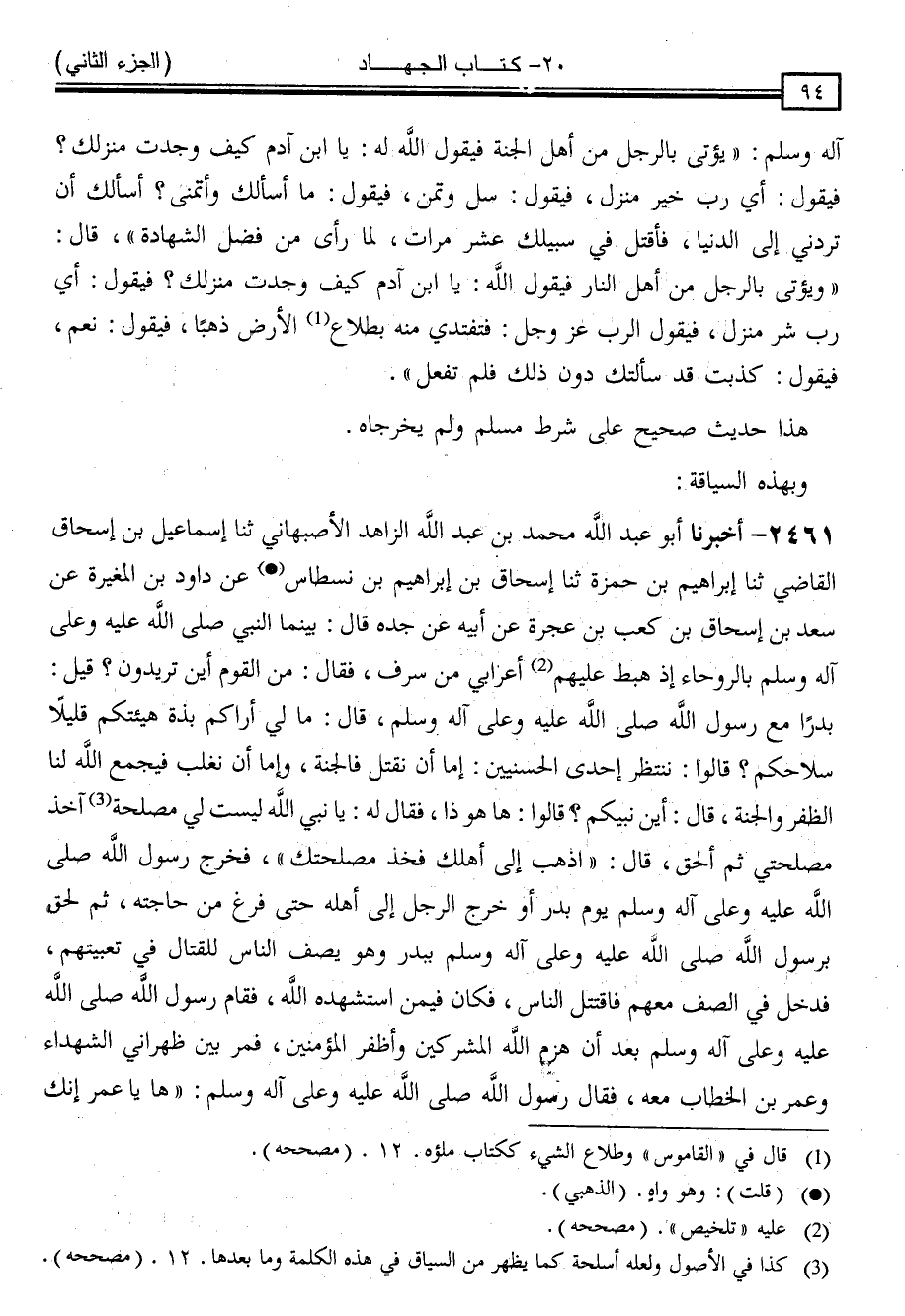 2461 - أَخْبَرَنَا أَبُو عَبْدِ اللَّهِ مُحَمَّدُ بْنُ عَبْدِ اللَّهِ الزَّاهِدُ الْأَصْبَهَانِيُّ ، ثنا إِسْمَاعِيلُ بْنُ إِسْحَاقَ الْقَاضِي ، ثنا إِبْرَاهِيمُ بْنُ حَمْزَةَ ، ثنا إِسْحَاقُ بْنُ إِبْرَاهِيمَ بْنِ نِسْطَاسٍ ، عَنْ دَاوُدَ بْنِ الْمُغِيرَةِ ، عَنْ سَعْدِ بْنِ إِسْحَاقَ بْنِ كَعْبِ بْنِ عُجْرَةَ ، عَنْ أَبِيهِ ، عَنْ جَدِّهِ ، قَالَ: بَيْنَمَا النَّبِيُّ صَلَّى اللَّهُ عَلَيْهِ وَسَلَّمَ بِالرَّوْحَاءِ إِذْ هَبَطَ عَلَيْهِمْ أَعْرَابِيٌّ مِنْ سَرِفَ فَقَالَ: مَنِ الْقَوْمُ أَيْنَ تُرِيدُونَ ؟ قِيلَ: بَدْرًا مَعَ رَسُولِ اللَّهِ صَلَّى اللَّهُ عَلَيْهِ وَسَلَّمَ قَالَ: مَا لِي أَرَاكُمْ بَذَّةً هَيْئَتُكُمْ قَلِيلًا سِلَاحُكُمْ ؟ قَالُوا: نَنْتَظِرُ إِحْدَى الْحُسْنَيَيْنِ إِمَّا أَنْ نُقْتَلَ فَالْجَنَّةُ ، وَإِمَّا أَنْ نَغْلِبَ فَيَجْمَعَ اللَّهُ لَنَا الظَّفَرَ وَالْجَنَّةَ . قَالَ: أَيْنَ نَبِيُّكُمْ ؟ قَالُوا: هَا هُوَ ذَا . فَقَالَ لَهُ: يَا نَبِيَّ اللَّهِ ، لَيْسَتْ لِي مَصْلَحَةٌ آخُذُ مَصْلَحَتِي ثُمَّ أَلْحَقُ . قَالَ: " اذْهَبْ إِلَى أَهْلِكَ فَخُذْ مَصْلَحَتَكَ " فَخَرَجَ رَسُولُ اللَّهِ صَلَّى اللَّهُ عَلَيْهِ وَسَلَّمَ يَؤُمُّ بَدْرًا وَخَرَجَ الرَّجُلُ إِلَى أَهْلِهِ حَتَّى فَرَغَ مِنْ حَاجَتِهِ ، ثُمَّ لَحِقَ بِرَسُولِ اللَّهِ صَلَّى اللَّهُ عَلَيْهِ وَسَلَّمَ بِبَدْرٍ ، وَهُوَ يَصُفُّ النَّاسَ لِلْقِتَالِ فِي تَعْبِئَتِهِمْ ، فَدَخَلَ فِي الصَّفِّ مَعَهُمْ فَاقْتَتَلَ النَّاسُ ، فَكَانَ فِيمَنِ اسْتَشْهَدَهُ اللَّهُ فَقَامَ رَسُولُ اللَّهِ صَلَّى اللَّهُ عَلَيْهِ وَسَلَّمَ بَعْدَ أَنْ هَزَمَ اللَّهُ الْمُشْرِكِينَ وَأَظْفَرَ الْمُؤْمِنِينَ فَمَرَّ بَيْنَ ظَهْرَانَيِ الشُّهَدَاءِ ، وَعُمَرُ بْنُ الْخَطَّابِ مَعَهُ فَقَالَ رَسُولُ اللَّهِ صَلَّى اللَّهُ عَلَيْهِ وَسَلَّمَ: " هَا يَا عُمَرُ ، إِنَّكَ -[95]- تُحِبُّ الْحَدِيثَ وَإِنَّ لِلشُّهَدَاءِ سَادَةً ، وَأَشْرَافًا وَمُلُوكًا ، وَإِنَّ هَذَا يَا عُمَرُ مِنْهُمْ "