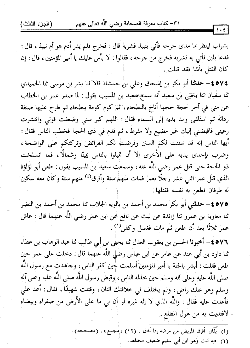 4574 - حَدَّثَنَا أَبُو بَكْرِ بْنُ إِسْحَاقَ ، وَعَلِيُّ بْنُ حَمْشَاذٍ ، قَالَا: ثنا بِشْرُ بْنُ مُوسَى ، ثنا الْحُمَيْدِيُّ ، ثنا سُفْيَانُ ، ثنا يَحْيَى بْنُ سَعِيدٍ ، أَنَّهُ سَمِعَ سَعِيدَ بْنَ الْمُسَيِّبِ يَقُولُ: لَمَّا صَدَرَ عُمَرُ بْنُ الْخَطَّابِ عَنْ مِنًى فِي آخِرِ حَجَّةٍ أَنَاخَ بِالْبَطْحَاءِ ، ثُمَّ كَوَّمَ كَوْمَةً بِبَطْحَاءَ ، ثُمَّ طَرَحَ عَلَيْهَا صِنْفَةَ رِدَائِهِ ، ثُمَّ اسْتَلْقَى وَمَدَّ يَدَيْهِ إِلَى السَّمَاءِ ، فَقَالَ: " اللَّهُمَّ كَبُرَ سِنِّي ، وَضَعُفَتْ قُوَّتِي ، وَانْتَشَرَتْ رَعِيَّتِي ، فَاقْبِضْنِي إِلَيْكَ غَيْرَ مُضَيِّعٍ وَلَا مُفَرِّطٍ " ، ثُمَّ قَدِمَ فِي ذِي الْحِجَّةِ فَخَطَبَ النَّاسَ ، فَقَالَ: " أَيُّهَا النَّاسُ ، إِنَّهُ قَدْ سَنَنْتُ لَكُمُ السُّنَنَ ، وَفُرِضْتُ لَكُمُ الْفَرَائِضَ ، وَتَرَكْتُكُمْ عَلَى الْوَاضِحَةِ - وَضَرَبَ بِإِحْدَى يَدَيْهِ عَلَى الْأُخْرَى - إِلَّا أَنْ تَمِيلُوا بِالنَّاسِ يَمِينًا وَشِمَالًا " ، فَمَا انْسَلَخْتَ ذُو الْحِجَّةِ حَتَّى قُتِلَ عُمَرُ رَضِيَ اللَّهُ عَنْهُ ، وَسَمِعْتُ سَعِيدَ بْنَ الْمُسَيِّبِ يَقُولُ: " طَعَنَ أَبُو لُؤْلُؤَةَ الَّذِي قَتَلَ عُمَرَ اثْنَيْ عَشَرَ رَجُلًا بِعُمَرَ فَمَاتَ مِنْهُمْ سِتَّةٌ ، وَأُفْرِقَ مِنْهُمْ سِتَّةٌ ، وَكَانَ مَعَهُ سِكِّينٌ لَهُ طَرَفَانِ فَطَعَنَ بِهِ نَفْسَهُ فَقَتَلَهَا "