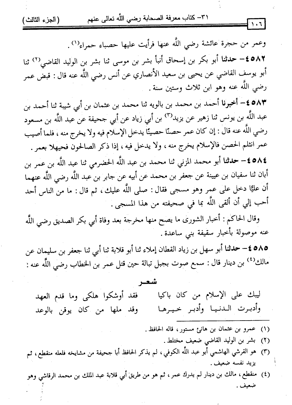 4584 - حَدَّثَنَا أَبُو مُحَمَّدٍ الْمُزَنِيُّ ، ثنا مُحَمَّدُ بْنُ عَبْدِ اللَّهِ الْحَضْرَمِيُّ ، ثنا عَبْدُ اللَّهِ بْنُ عُمَرَ بْنِ أَبَانَ ، ثنا سُفْيَانُ بْنُ عُيَيْنَةَ ، عَنْ جَعْفَرِ بْنِ مُحَمَّدٍ ، عَنْ أَبِيهِ ، عَنْ جَابِرِ بْنِ عَبْدِ اللَّهِ رَضِيَ اللَّهُ عَنْهُمَا ، أَنَّ عَلِيًّا دَخَلَ عَلَى عُمَرَ وَهُوَ مُسَجًّى ، فَقَالَ: " صَلَّى اللَّهُ عَلَيْكَ " ، ثُمَّ قَالَ: " مَا مِنَ النَّاسِ أَحَدٌ أَحَبُّ إِلَيَّ أَنْ أَلْقَى اللَّهَ بِمَا فِي صَحِيفَتِهِ مِنْ هَذَا الْمُسَجَّى " قَالَ الْحَاكِمُ: " أَخْبَارُ الشُّورَى مَا يَصِحُّ مِنْهَا مَخْرَجُهُ بَعْدَ وَفَاةِ أَبِي بَكْرٍ الصِّدِّيقِ رَضِيَ اللَّهُ عَنْهُ مَوْصُولَةٌ بِأَخْبَارِ سَقِيفَةِ بَنِي سَاعِدَةَ