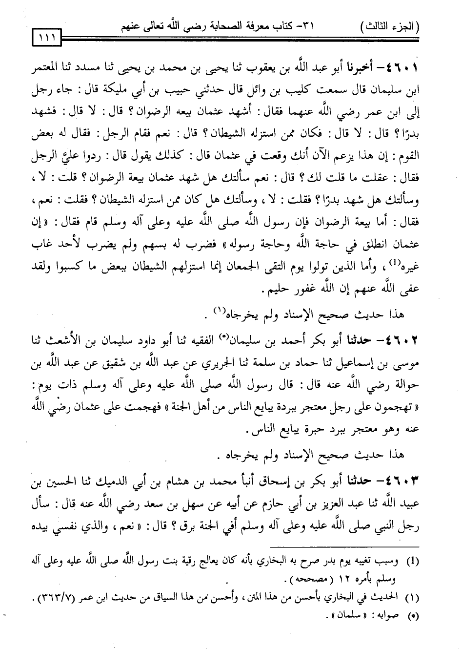 4601 - أَخْبَرَنَا أَبُو عَبْدِ اللَّهِ [مُحَمَّدُ] بْنُ يَعْقُوبَ ، ثنا يَحْيَى بْنُ مُحَمَّدِ بْنُ يَحْيَى ، ثنا مُسَدَّدٌ ، ثنا الْمُعْتَمِرُ بْنُ سُلَيْمَانَ ، قَالَ: سَمِعْتُ كُلَيْبَ بْنَ وَائِلٍ ، قَالَ: حَدَّثَنِي حَبِيبُ بْنُ أَبِي مُلَيْكَةَ ، قَالَ: جَاءَ رَجُلٌ إِلَى ابْنِ عُمَرَ رَضِيَ اللَّهُ عَنْهُمَا ، فَقَالَ: أَشَهِدَ عُثْمَانُ بَيْعَةَ الرِّضْوَانِ ؟ قَالَ: لَا ، قَالَ: فَشَهِدَ بَدْرًا ، قَالَ: لَا ، قَالَ: " فَكَانَ مِمَّنِ اسْتَزَلَّهُ الشَّيْطَانُ ؟ قَالَ: نَعَمْ ، فَقَامَ الرَّجُلُ فَقَالَ لَهُ بَعْضُ الْقَوْمِ: إِنَّ هَذَا يَزْعُمُ الْآنَ أَنَّكَ وَقَعْتَ فِي عُثْمَانَ ، قَالَ: كَذَلِكَ يَقُولُ: قَالَ: رُدُّوا عَلَيَّ الرَّجُلَ ، فَقَالَ: عَقَلْتَ مَا قُلْتُ لَكَ ؟ قَالَ: نَعَمْ ، سَأَلْتُكَ هَلْ شَهِدَ عُثْمَانُ بَيْعَةَ الرِّضْوَانِ ؟ قُلْتَ: لَا ، وَسَأَلْتُكَ هَلْ شَهِدَ بَدْرًا ؟ فَقُلْتُ: لَا ، وَسَأَلْتُكَ هَلْ كَانَ مِمَّنِ اسْتَزَلَّهُ الشَّيْطَانُ ؟ فَقُلْتَ: نَعَمْ ، فَقَالَ: أَمَّا بَيْعَةُ الرِّضْوَانِ ، فَإِنَّ رَسُولَ اللَّهِ صَلَّى اللَّهُ عَلَيْهِ وَسَلَّمَ قَامَ ، فَقَالَ: " إِنَّ عُثْمَانَ انْطَلَقَ فِي حَاجَةِ اللَّهِ وَحَاجَةِ رَسُولِهِ " فَضَرَبَ لَهُ بِسَهْمٍ ، وَلَمْ يَضْرِبْ لِأَحَدٍ غَابَ غَيْرَهُ ، وَأَمَّا الَّذِينَ تَوَلَّوْا يَوْمَ الْتَقَى الْجَمْعَانِ ، إِنَّمَا اسْتَزَلَّهُمُ الشَّيْطَانُ بِبَعْضِ مَا كَسَبُوا ، وَلَقَدْ عَفَا اللَّهُ عَنْهُمْ إِنَّ اللَّهَ غَفُورٌ حَلِيمٌ