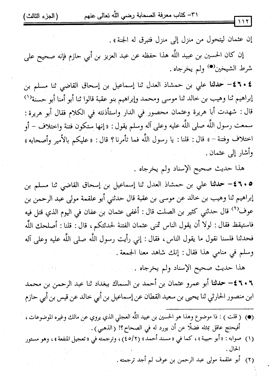 4605 - حَدَّثَنَا عَلِيُّ بْنُ حَمْشَاذَ الْعَدْلُ ، ثنا إِسْمَاعِيلُ بْنُ إِسْحَاقَ الْقَاضِي ، ثنا مُسْلِمُ بْنُ إِبْرَاهِيمَ ، ثنا وُهَيْبُ بْنُ خَالِدٍ ، عَنْ مُوسَى بْنِ عُقْبَةَ قَالَ: حَدَّثَنِي أَبُو عَلْقَمَةَ ، مَوْلَى عَبْدِ الرَّحْمَنِ بْنِ عَوْفٍ ، قَالَ: حَدَّثَنِي كَثِيرُ بْنُ الصَّلْتِ ، قَالَ: أَغْفَى عُثْمَانُ بْنُ عَفَّانَ فِي الْيَوْمِ الَّذِي قُتِلَ فِيهِ فَاسْتَيْقَظَ ، فَقَالَ: " لَوْلَا أَنْ يَقُولُ النَّاسُ تَمَنَّى عُثْمَانُ الْفِتْنَةَ لَحَدَّثْتُكُمْ ، قَالَ: قُلْنَا: أَصْلَحَكَ اللَّهُ فَحَدِّثْنَا ، فَلَسْنَا نَقُولُ مَا يَقُولُ النَّاسُ ، فَقَالَ: إِنِّي رَأَيْتُ رَسُولَ اللَّهِ صَلَّى اللَّهُ عَلَيْهِ وَسَلَّمَ فِي مَنَامِي هَذَا ، فَقَالَ: " إِنَّكَ شَاهِدٌ مَعَنَا الْجُمُعَةَ "