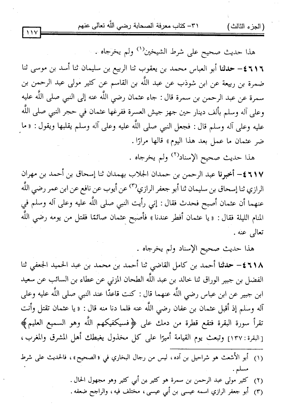4618 - حَدَّثَنَا أَحْمَدُ بْنُ كَامِلٍ الْقَاضِي ، ثنا أَحْمَدُ بْنُ مُحَمَّدِ بْنِ عَبْدِ الْحَمِيدِ الْجُعْفِيُّ ، ثنا الْفَضْلُ بْنُ جُبَيْرٍ الْوَرَّاقُ ، ثنا خَالِدُ بْنُ عَبْدِ اللَّهِ الطَّحَّانُ الْمُزَنِيُّ ، عَنْ عَطَاءِ بْنِ السَّائِبِ ، عَنْ سَعِيدِ بْنِ جُبَيْرٍ ، عَنِ ابْنِ عَبَّاسٍ رَضِيَ اللَّهُ عَنْهُمَا قَالَ: كُنْتُ قَاعِدًا عِنْدَ النَّبِيِّ صَلَّى اللَّهُ عَلَيْهِ وَسَلَّمَ إِذْ أَقْبَلَ عُثْمَانُ بْنُ عَفَّانَ رَضِيَ اللَّهُ عَنْهُ ، فَلَمَّا دَنَا مِنْهُ ، قَالَ: " يَا عُثْمَانُ ، تُقْتَلُ وَأَنْتَ تَقْرَأُ سُورَةَ الْبَقَرَةِ ، فَتَقَعُ مِنْ دَمِكَ عَلَى: { فَسَيَكْفِيكَهُمُ اللَّهُ وَهُوَ السَّمِيعُ الْعَلِيمُ } [البقرة: 137] ، وَتُبْعَثُ يَوْمَ الْقِيَامَةِ أَمِيرًا عَلَى كُلِّ مَخْذُولٍ ، يَغْبِطُكَ أَهْلُ الْمَشْرِقِ وَالْمَغْرِبِ ، -[118]- وَتَشْفَعُ فِي عَدَدِ رَبِيعَةَ وَمُضَرَ " قَالَ الْحَاكِمُ: " قَدْ ذَكَرْتُ الْأَخْبَارَ الْمَسَانِيدَ فِي هَذَا الْبَابِ فِي كِتَابِ مَقْتَلِ عُثْمَانَ رَضِيَ اللَّهُ عَنْهُ فَلَمُ اسْتَحْسِنْ ذِكْرَهَا عَنْ آخِرِهَا فِي هَذَا الْمَوْضِعِ ، فَإِنَّ فِي هَذَا الْقَدْرِ كِفَايَةٌ ، فَأَمَّا الَّذِي ادَّعَتْهُ الْمُبْتَدِعَةُ مِنْ مَعُونَةِ أَمِيرِ الْمُؤْمِنِينَ عَلِيِّ بْنِ أَبِي طَالِبٍ عَلَى قَتْلِهِ ، فَإِنَّهُ كَذِبٌ وَزُورٌ فَقَدْ تَوَاتَرَتِ الْأَخْبَارُ بِخِلَافِهِ "