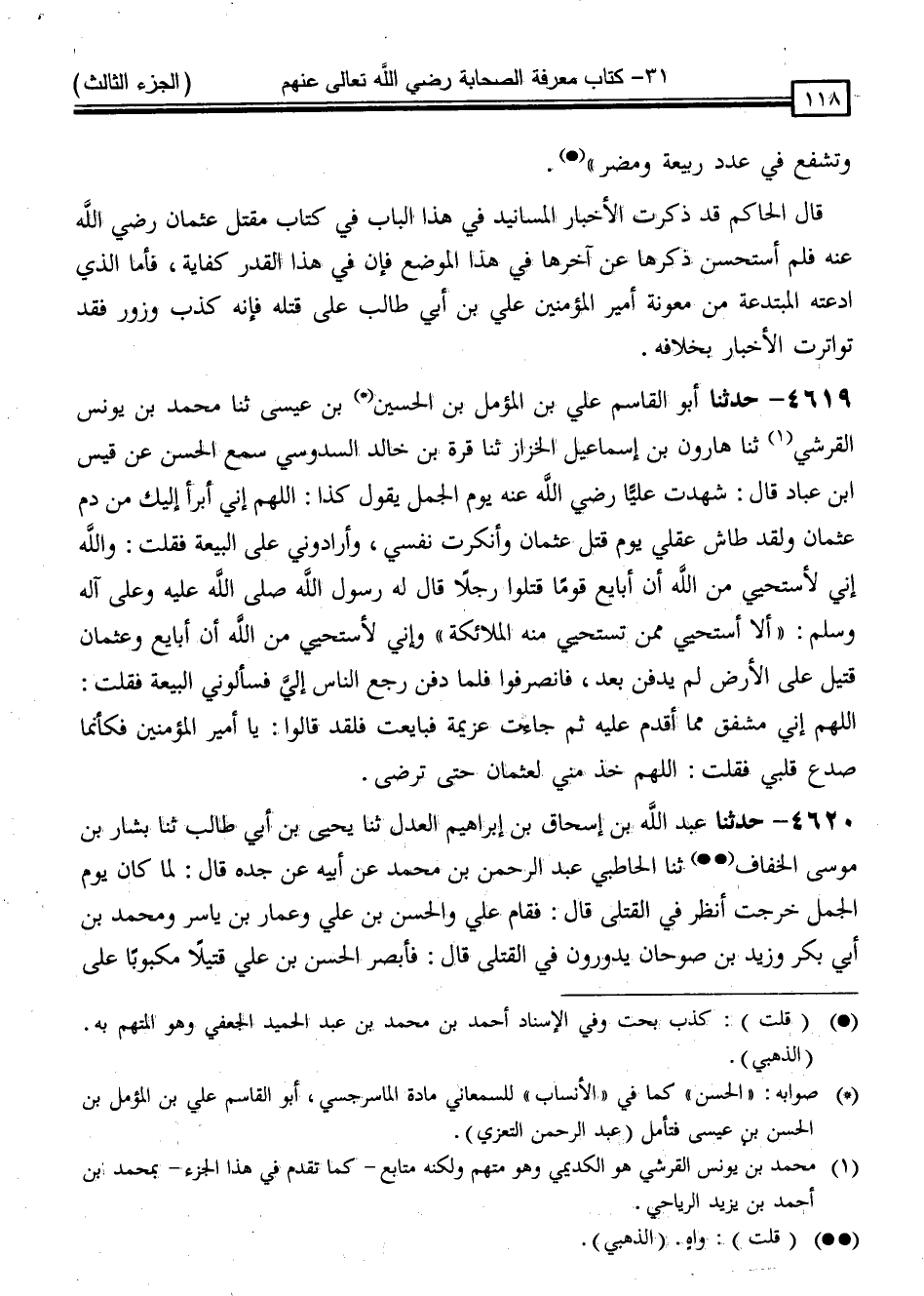 4620 - حَدَّثَنَا عَبْدُ اللَّهِ بْنُ إِسْحَاقَ بْنِ إِبْرَاهِيمَ ، الْعَدْلُ ، ثنا يَحْيَى بْنُ أَبِي طَالِبٍ ، ثنا بَشَّارُ بْنُ مُوسَى الْخَفَّافُ ، ثنا الْحَاطِبِيُّ عَبْدُ الرَّحْمَنِ بْنُ مُحَمَّدٍ ، عَنْ أَبِيهِ ، عَنْ جَدِّهِ قَالَ: لَمَّا كَانَ يَوْمُ الْجَمَلِ خَرَجْتُ أَنْظُرُ فِي الْقَتْلَى ، قَالَ: فَقَامَ عَلِيٌّ ، وَالْحَسَنُ بْنُ عَلِيٍّ ، وَعَمَّارُ بْنُ يَاسِرٍ ، وَمُحَمَّدُ بْنُ أَبِي بَكْرٍ ، وَزَيْدُ بْنُ صُوحَانَ يَدُورُونَ فِي الْقَتْلَى ، قَالَ: فَأَبْصَرَ الْحَسَنُ بْنُ عَلِيٍّ قَتِيلًا مَكْبُوبًا عَلَى -[119]- وَجْهِهِ ، فَقَلَبَهُ عَلَى قَفَاهُ ، ثُمَّ صَرَخَ ، ثُمَّ قَالَ: إِنَّا لِلَّهِ وَإِنَّا إِلَيْهِ رَاجِعُونَ ، فَرِحَ قُرَيْشٌ وَاللَّهِ ، فَقَالَ لَهُ أَبُوهُ: مَنْ هُوَ يَا بَنِي ؟ قَالَ: مُحَمَّدُ بْنُ طَلْحَةَ بْنِ عُبَيْدِ اللَّهِ ، فَقَالَ: إِنَّا لِلَّهِ وَإِنَّا إِلَيْهِ رَاجِعُونَ ، أَمَا وَاللَّهِ لَقَدْ كَانَ شَابًّا صَالِحًا ، ثُمَّ قَعَدَ كَئِيبًا حَزِينًا ، فَقَالَ لَهُ الْحَسَنُ: يَا أَبَتِ ، قَدْ كُنْتُ أَنْهَاكَ عَنْ هَذَا الْمَسِيرِ ، فَغَلَبَكَ عَلَى رَأْيِكَ فُلَانٌ وَفُلَانٌ ، قَالَ: قَدْ كَانَ ذَاكَ يَا بُنَيَّ ، وَلَوَدِدْتُ أَنِّي مُتُّ قَبْلَ هَذَا بِعِشْرِينَ سَنَةً ، قَالَ مُحَمَّدُ بْنُ حَاطِبٍ: فَقُمْتُ ، فَقُلْتُ: يَا أَمِيرَ الْمُؤْمِنِينَ ، إِنَّا قَادِمُونَ الْمَدِينَةَ ، وَالنَّاسُ سَائِلُونَا عَنْ عُثْمَانَ ، فَمَاذَا تَقُولُ فِيهِ ؟ قَالَ: فَتَكَلَّمَ عَمَّارُ بْنُ يَاسِرٍ ، وَمُحَمَّدُ بْنُ أَبِي بَكْرٍ فَقَالَا: وَقَالَا ، فَقَالَ لَهُمَا عَلِيٌّ: " يَا عَمَّارُ ، وَيَا مُحَمَّدُ تَقُولَانِ: أَنَّ عُثْمَانَ اسْتَأْثَرَ وَأَسَاءَ الْإِمْرَةَ ، وَعَاقَبْتُمُ وَاللَّهِ ، فَأَسْأَتُمُ الْعُقُوبَةَ ، وَسَتَقْدُمُونَ عَلَى حَكَمٍ عَدْلٍ يَحْكُمُ بَيْنَكُمْ " ، ثُمَّ قَالَ: " يَا مُحَمَّدُ بْنُ حَاطِبٍ إِذَا قَدِمْتَ الْمَدِينَةَ وَسُئِلَتْ عَنْ عُثْمَانَ ، فَقُلْ: كَانَ وَاللَّهِ مِنَ الَّذِينَ آمَنُوا وَعَمِلُوا الصَّالِحَاتِ ، ثُمَّ اتَّقُوا وَآمَنُوا ، ثُمَّ اتَّقُوا وَأَحْسَنُوا ، وَاللَّهُ يُحِبُّ الْمُحْسِنِينَ ، وَعَلَى اللَّهِ فَلْيَتَوَكَّلِ الْمُؤْمِنُونَ "