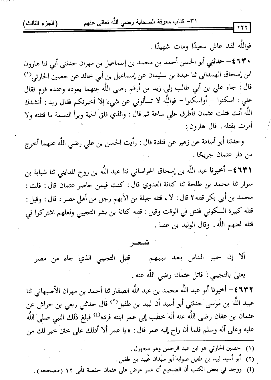4630 - حَدَّثَنِي أَبُو الْحَسَنِ أَحْمَدُ بْنُ مُحَمَّدِ بْنِ إِسْمَاعِيلَ بْنِ مِهْرَانَ ، حَدَّثَنِي أَبِي ، ثنا هَارُونُ بْنُ إِسْحَاقَ الْهَمْدَانِيُّ ، ثنا عَبْدَةُ بْنُ سُلَيْمَانَ ، عَنْ إِسْمَاعِيلَ بْنِ أَبِي خَالِدٍ ، عَنْ حُصَيْنٍ الْحَارِثِيِّ قَالَ: جَاءَ عَلِيُّ بْنُ أَبِي طَالِبٍ إِلَى زَيْدِ بْنِ أَرْقَمَ رَضِيَ اللَّهُ عَنْهُمَا يَعُودُهُ وَعِنْدَهُ قَوْمٌ ، فَقَالَ عَلِيٌّ: " اسْكُنُوا أَوِ اسْكُتُوا فَوَاللَّهِ لَا تَسْأَلُونِي عَنْ شَيْءٍ إِلَّا أَخْبَرْتُكُمْ " ، فَقَالَ زَيْدٌ: أَنْشُدُكَ اللَّهَ ، أَنْتَ قَتَلْتَ عُثْمَانَ ؟ فَأَطْرَقَ عَلِيٌّ سَاعَةً ، ثُمَّ قَالَ: " وَالَّذِي فَلَقَ الْحَبَّةَ وَبَرَأَ النَّسَمَةَ مَا قَتَلْتُهُ ، وَلَا أَمَرْتُ بِقَتْلِهِ "