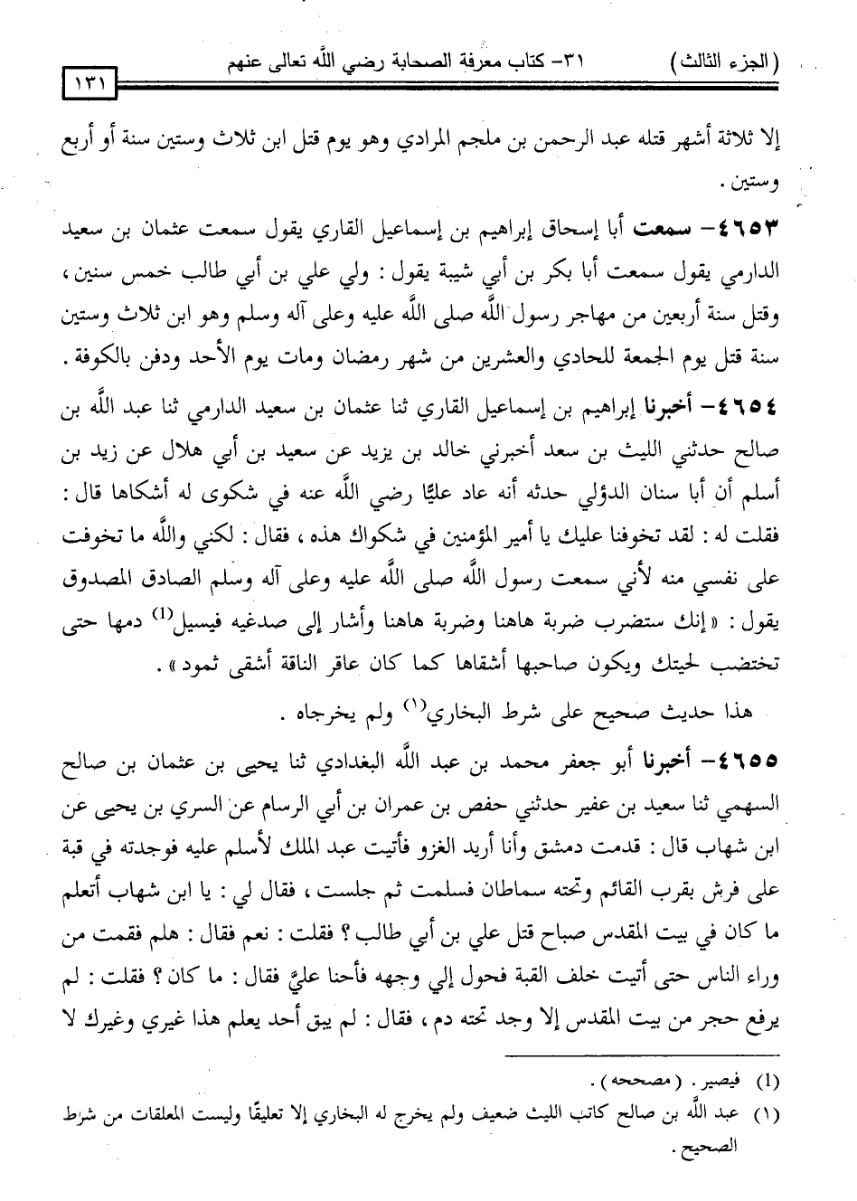 4654 - أَخْبَرَنَا إِبْرَاهِيمُ بْنُ إِسْمَاعِيلَ الْقَارِئُ ، ثنا عُثْمَانُ بْنُ سَعِيدٍ الدَّارِمِيُّ ، ثنا عَبْدُ اللَّهِ بْنُ صَالِحٍ ، حَدَّثَنِي اللَّيْثُ بْنُ سَعْدٍ ، أَخْبَرَنِي خَالِدُ بْنُ يَزِيدَ ، عَنْ سَعِيدِ بْنِ أَبِي هِلَالٍ ، عَنْ زَيْدِ بْنِ أَسْلَمَ ، أَنَّ أَبَا سِنَانٍ الدُّؤَلِيَّ حَدَّثَهُ ، أَنَّهُ عَادَ عَلِيًّا رَضِيَ اللَّهُ عَنْهُ فِي شَكْوَى لَهُ أَشْكَاهَا ، قَالَ: فَقُلْتُ لَهُ: لَقَدْ تَخَوَّفْنَا عَلَيْكَ يَا أَمِيرَ الْمُؤْمِنِينَ فِي شَكْوَاكَ هَذِهِ ، فَقَالَ: لَكِنِّي وَاللَّهِ مَا تَخَوَّفْتُ عَلَى نَفْسِي مِنْهُ ، لِأَنِّي سَمِعْتُ رَسُولَ اللَّهِ صَلَّى اللَّهُ عَلَيْهِ وَسَلَّمَ الصَّادِقَ الْمَصْدُوقَ ، يَقُولُ: " إِنَّكَ سَتُضْرَبُ ضَرْبَةً هَا هُنَا وَضَرْبَةً هَا هُنَا - وَأَشَارَ إِلَى صُدْغَيْهِ - فَيَسِيلُ دَمُهَا حَتَّى تَخْتَضِبَ لِحْيَتُكَ ، وَيَكُونُ صَاحِبُهَا أَشْقَاهَا ، كَمَا كَانَ عَاقِرُ النَّاقَةِ أَشْقَى ثَمُودَ "