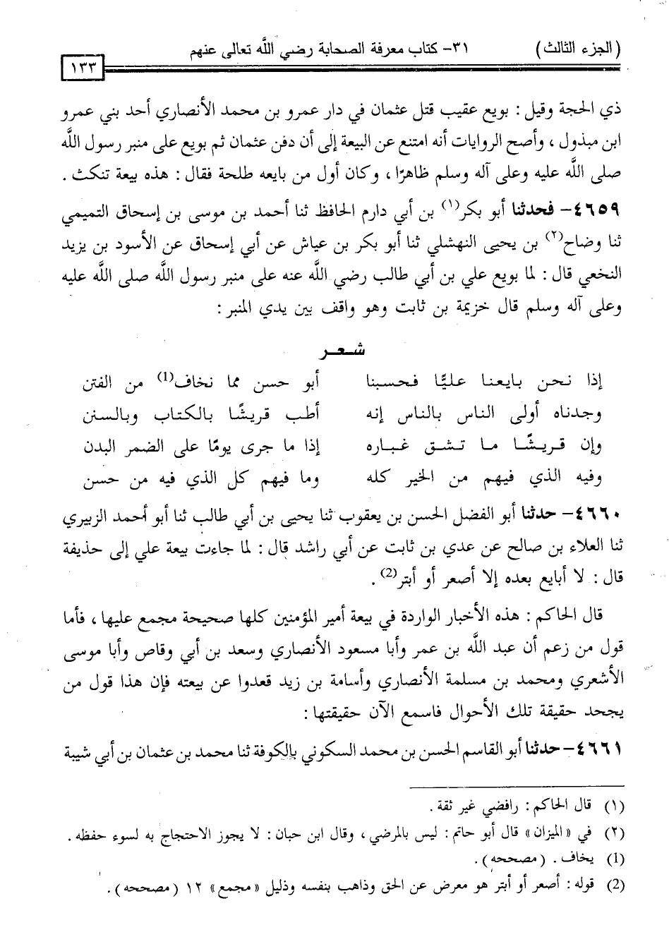 قَالَ الْحَاكِمُ: " هَذِهِ الْأَخْبَارُ الْوَارِدَةُ فِي بَيْعَةِ أَمِيرِ الْمُؤْمِنِينَ كُلُّهَا صَحِيحَةٌ مُجْمَعٌ عَلَيْهَا ، فَأَمَّا قَوْلُ مَنْ زَعَمَ أَنَّ عَبْدَ اللَّهِ بْنَ عَمْرٍو أَبَا مَسْعُودٍ الْأَنْصَارِيَّ ، وَسَعْدَ بْنَ أَبِي وَقَّاصٍ ، وَأَبَا مُوسَى الْأَشْعَرِيَّ ، وَمُحَمَّدَ بْنَ مَسْلَمَةَ الْأَنْصَارِيَّ ، وَأُسَامَةَ بْنَ زَيْدٍ قَعَدُوا عَنْ بَيْعَتِهِ ، فَإِنَّ هَذَا قَوْلُ مَنْ يَجْحَدُ حَقِيقَةَ تِلْكَ الْأَحْوَالِ فَاسْمَعِ الْآنَ حَقِيقَتَهَا "
