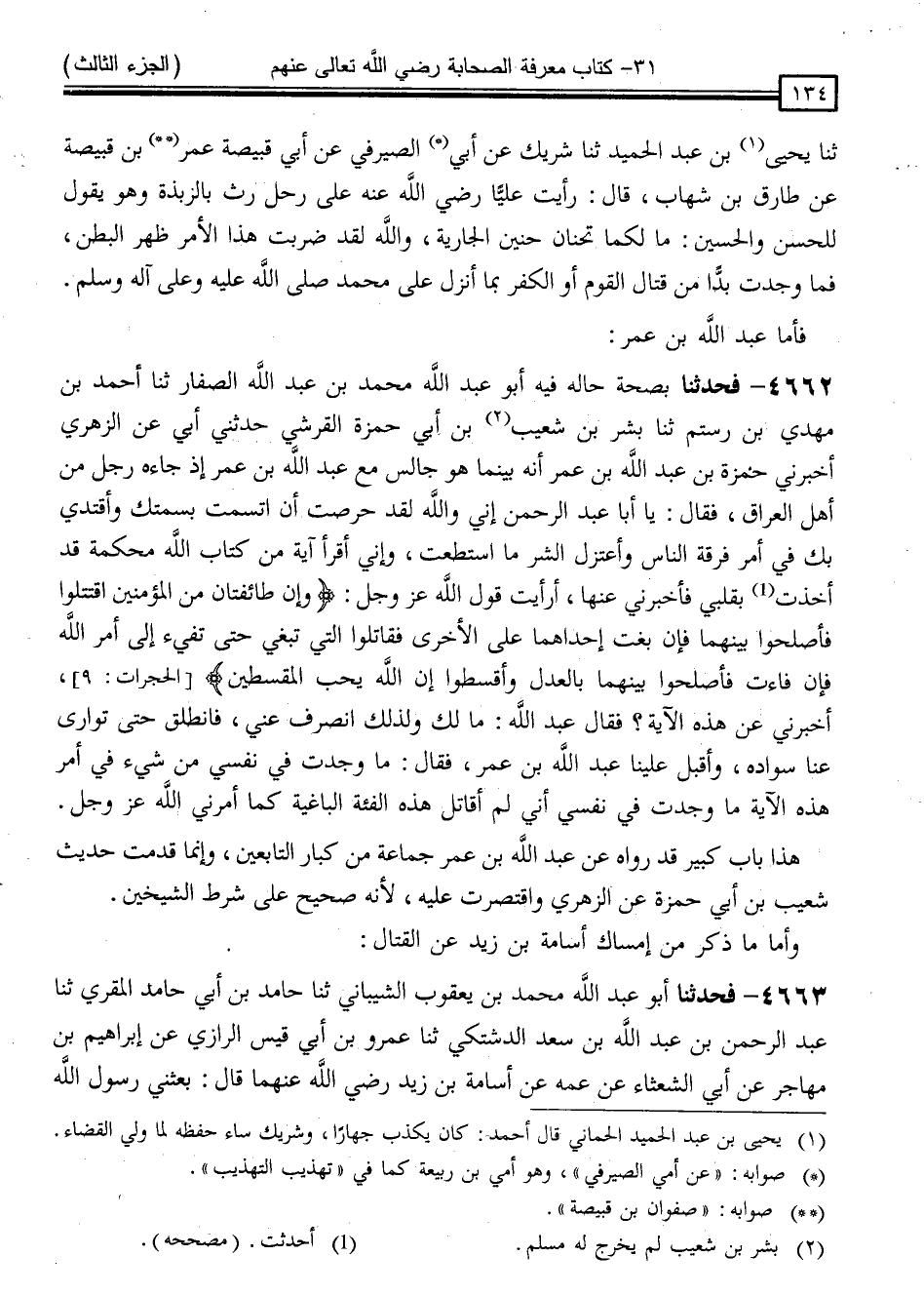 4662 - فَحَدَّثَنَا بِصِحَّةِ حَالِهِ فِيهِ أَبُو عَبْدِ اللَّهِ مُحَمَّدُ بْنُ عَبْدِ اللَّهِ الصَّفَّارُ ، ثنا أَحْمَدُ بْنُ مَهْدِيِّ بْنِ رُسْتُمَ ، ثنا بِشْرُ بْنُ شُعَيْبِ بْنِ أَبِي حَمْزَةَ الْقُرَشِيُّ ، حَدَّثَنِي أَبِي ، عَنِ الزُّهْرِيِّ ، أَخْبَرَنِي حَمْزَةُ بْنُ عَبْدِ اللَّهِ بْنِ عُمَرَ أَنَّهُ ، بَيْنَمَا هُوَ جَالِسٌ مَعَ عَبْدِ اللَّهِ بْنِ عُمَرَ إِذْ جَاءَهُ رَجُلٌ مِنْ أَهْلِ الْعِرَاقِ ، فَقَالَ: يَا أَبَا عَبْدِ الرَّحْمَنِ ، إِنِّي وَاللَّهِ لَقَدْ حَرَصْتُ أَنْ أَتَسَمَّتُ بِسَمْتِكَ ، وَأَقْتَدِي بِكَ فِي أَمْرِ فُرْقَةِ النَّاسِ ، وَأَعْتَزِلُ الشَّرَّ مَا اسْتَطَعْتُ ، وَإِنِّي أَقْرَأُ آيَةً مِنْ كِتَابِ اللَّهِ مُحْكَمَةً قَدْ أَخَذَتْ بِقَلْبِي فَأَخْبِرْنِي عَنْهَا ، أَرَأَيْتَ قَوْلَ اللَّهِ عَزَّ وَجَلَّ: { وَإِنْ طَائِفَتَانِ مِنَ الْمُؤْمِنِينَ اقْتَتَلُوا فَأَصْلِحُوا بَيْنَهُمَا فَإِنْ بَغَتْ إِحْدَاهُمَا عَلَى الْأُخْرَى فَقَاتِلُوا الَّتِي تَبْغِي حَتَّى تَفِيءَ إِلَى أَمْرِ اللَّهِ فَإِنْ فَاءَتْ فَأَصْلِحُوا بَيْنَهُمَا بِالْعَدْلِ وَأَقْسِطُوا إِنَّ اللَّهَ يُحِبُّ الْمُقْسِطِينَ } [الحجرات: 9] أَخْبِرْنِي عَنْ هَذِهِ الْآيَةِ ، فَقَالَ عَبْدُ اللَّهِ: مَا لَكَ وَلِذَلِكَ ؟ انْصَرِفْ عَنِّي ، فَانْطَلَقَ حَتَّى تَوَارَى عَنّا سَوَادُهُ ، وَأَقْبَلَ عَلَيْنَا عَبْدُ اللَّهِ بْنُ عُمَرَ فَقَالَ: " مَا وَجَدْتُ فِي نَفْسِي مِنْ شَيْءٍ فِي أَمْرِ هَذِهِ الْآيَةِ مَا وَجَدْتُ فِي نَفْسِي أَنِّي لَمْ أُقَاتِلْ هَذِهِ الْفِئَةَ الْبَاغِيَةَ كَمَا أَمَرَنِي اللَّهُ عَزَّ وَجَلَّ "