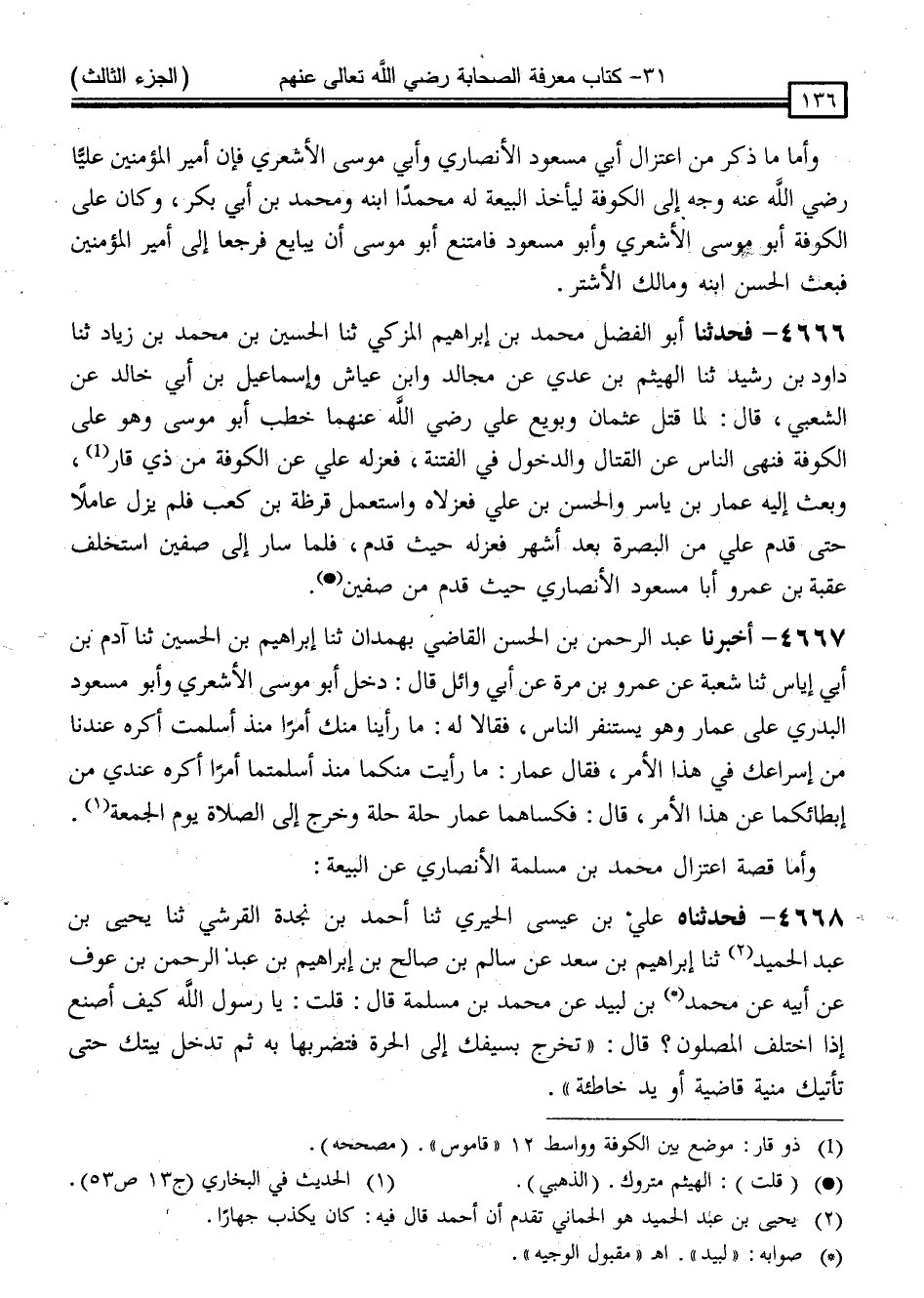 4666 - فَحَدَّثَنَا أَبُو الْفَضْلِ مُحَمَّدُ بْنُ إِبْرَاهِيمَ الْمُزَكِّي ، ثنا الْحُسَيْنُ بْنُ مُحَمَّدِ بْنِ زِيَادٍ ، ثنا دَاوُدُ بْنُ رُشَيْدٍ ، ثنا الْهَيْثَمُ بْنُ عَدِيٍّ ، عَنْ مُجَالِدٍ ، وَابْنِ عَيَّاشٍ ، وَإِسْمَاعِيلَ بْنِ أَبِي خَالِدٍ ، عَنِ الشَّعْبِيِّ قَالَ: " لَمَّا قُتِلَ عُثْمَانُ ، وَبُويِعَ عَلِيٌّ رَضِيَ اللَّهُ عَنْهُمَا ، خَطَبَ أَبُو مُوسَى وَهُوَ عَلَى الْكُوفَةِ ، فَنَهَى النَّاسَ عَنِ الْقِتَالِ ، وَالدُّخُولِ فِي الْفِتْنَةِ ، فَعَزَلَهُ عَلِيٌّ عَنِ الْكُوفَةِ ، مِنْ ذِي قَارٍ ، وَبَعَثَ إِلَيْهِ عَمَّارَ بْنَ يَاسِرٍ وَالْحَسَنَ بْنَ عَلِيٍّ فَعَزَلَاهُ ، وَاسْتَعْمَلَ قَرَظَةَ بْنَ كَعْبٍ ، فَلَمْ يَزَلْ عَامِلًا حَتَّى قَدِمَ عَلِيٌّ مِنَ الْبَصْرَةِ بَعْدَ أَشْهُرٍ فَعَزَلَهُ حَيْثُ قَدِمَ ، فَلَمَّا سَارَ إِلَى صِفِّينَ اسْتَخْلَفَ عُقْبَةَ بْنَ عَمْرٍو أَبَا مَسْعُودٍ الْأَنْصَارِيَّ حَيْثُ قَدِمَ مِنْ صِفِّينَ "