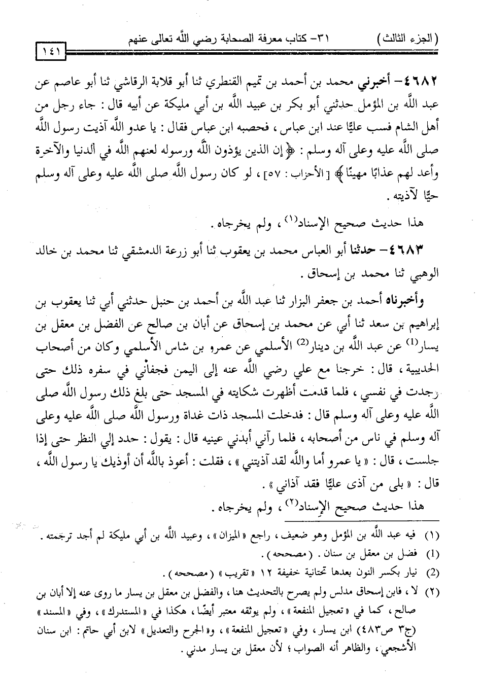 وَأَخْبَرْنَاهُ أَحْمَدُ بْنُ جَعْفَرٍ الْبَزَّارُ ، ثنا عَبْدُ اللَّهِ بْنُ أَحْمَدَ بْنِ حَنْبَلٍ ، حَدَّثَنِي أَبِي ، ثنا يَعْقُوبُ بْنُ إِبْرَاهِيمَ بْنِ سَعْدٍ ، ثنا أَبِي ، عَنْ مُحَمَّدِ بْنِ إِسْحَاقَ ، عَنْ أَبَانَ بْنِ صَالِحٍ ، عَنِ الْفَضْلِ بْنِ مَعْقِلِ بْنِ سِنَانٍ ، عَنْ عَبْدِ اللَّهِ بْنِ نِيَارٍ الْأَسْلَمِيِّ ، عَنْ عَمْرِو بْنِ شَاسٍ الْأَسْلَمِيِّ ، وَكَانَ مِنْ أَصْحَابِ الْحُدَيْبِيَةِ ، قَالَ: خَرَجْنَا مَعَ عَلِيٍّ رَضِيَ اللَّهُ عَنْهُ إِلَى الْيَمَنِ فَجَفَانِي فِي سَفَرِهِ ذَلِكَ حَتَّى وَجَدْتُ فِي نَفْسِي ، فَلَمَّا قَدِمْتُ أَظْهَرْتُ شِكَايَتَهُ فِي الْمَسْجِدِ حَتَّى بَلَغَ ذَلِكَ رَسُولَ اللَّهِ صَلَّى اللَّهُ عَلَيْهِ وَسَلَّمَ ، قَالَ: فَدَخَلْتُ الْمَسْجِدَ ذَاتَ غَدَاةٍ ، وَرَسُولُ اللَّهِ صَلَّى اللَّهُ عَلَيْهِ وَسَلَّمَ فِي نَاسٍ مِنْ أَصْحَابِهِ ، فَلَمَّا رَآنِي أَبَّدَنِي عَيْنَيْهِ ، قَالَ: يَقُولُ: حَدَّدَ إِلَيَّ النَّظَرَ حَتَّى إِذَا جَلَسْتُ ، قَالَ: " يَا عَمْرُو ، أَمَا وَاللَّهِ لَقَدْ آذَيْتَنِي " فَقُلْتُ: أَعُوذُ بِاللَّهِ أَنْ أُؤْذِيَكَ يَا رَسُولَ اللَّهِ ، قَالَ: " بَلَى ، مَنْ آذَى عَلِيًّا فَقَدْ آذَانِي "