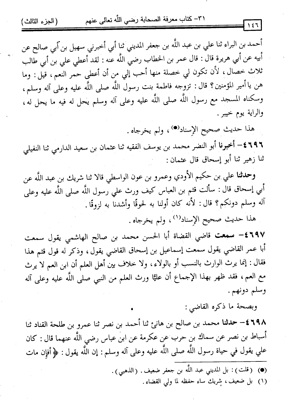 4697 - سَمِعْتُ قَاضِي الْقُضَاةَ أَبَا الْحَسَنِ مُحَمَّدَ بْنَ صَالِحٍ الْهَاشِمِيَّ يَقُولُ: سَمِعْتُ أَبَا عُمَرَ الْقَاضِي يَقُولُ: سَمِعْتُ إِسْمَاعِيلَ بْنَ إِسْحَاقَ الْقَاضِي يَقُولُ: وَذُكِرَ لَهُ قَوْلُ قُثَمَ هَذَا ، فَقَالَ: " إِنَّمَا يَرِثُ الْوَارِثُ بِالنَّسَبِ أَوْ بِالْوَلَاءِ ، وَلَا خِلَافَ بَيْنَ أَهْلِ الْعِلْمِ أَنَّ ابْنَ الْعَمِّ لَا يَرِثُ مَعَ الْعَمِّ ، فَقَدْ ظَهَرَ بِهَذَا الِإِجْمَاعِ أَنَّ عَلِيًّا وَرِثَ الْعِلْمَ مِنَ النَّبِيِّ صَلَّى اللَّهُ عَلَيْهِ وَسَلَّمَ دُونَهُمْ ، وَبِصِحَّةِ مَا ذَكَرَهُ الْقَاضِي "