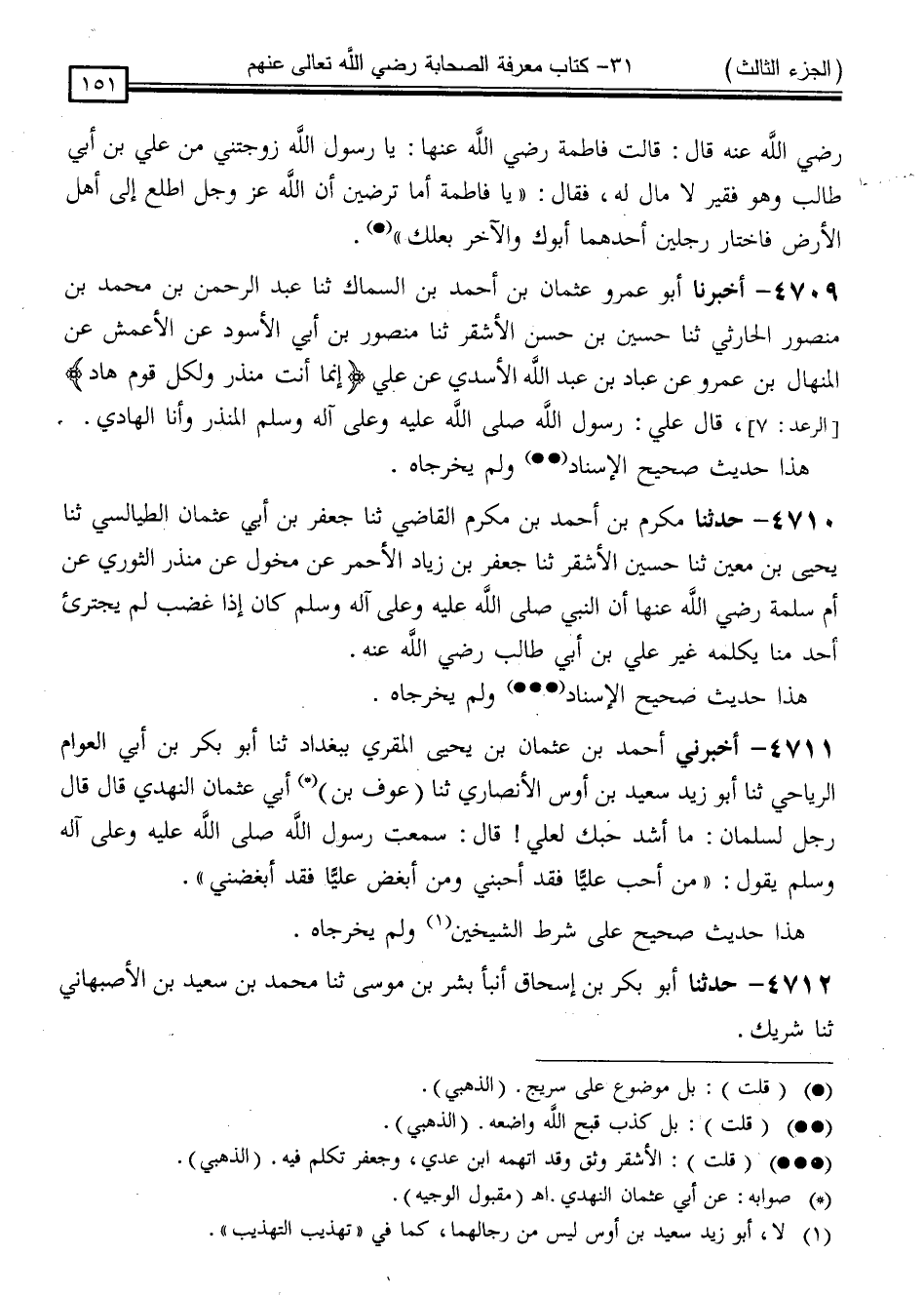 4712 - حَدَّثَنَا أَبُو بَكْرِ بْنُ إِسْحَاقَ ، أَنْبَأَ بِشْرُ بْنُ مُوسَى ، ثنا مُحَمَّدُ بْنُ سَعِيدِ بْنِ الْأَصْبَهَانِيُّ ، ثنا شَرِيكٌ ، -[152]- وَأَخْبَرَنَا أَحْمَدُ بْنُ جَعْفَرٍ الْقَطِيعِيُّ ، ثنا عَبْدُ اللَّهِ بْنُ أَحْمَدَ بْنِ حَنْبَلٍ ، حَدَّثَنِي أَبِي ، ثنا الْأَسْوَدُ بْنُ عَامِرٍ ، وَعَبْدُ اللَّهِ بْنُ نُمَيْرٍ ، قَالَا: ثنا شَرِيكٌ ، عَنْ أَبِي رَبِيعَةَ الْإِيَادِيُّ ، عَنِ ابْنِ بُرَيْدَةَ ، عَنْ أَبِيهِ قَالَ: قَالَ رَسُولُ اللَّهِ صَلَّى اللَّهُ عَلَيْهِ وَسَلَّمَ: " إِنَّ اللَّهَ أَمَرَنِي بِحُبِّ أَرْبَعَةٍ مِنْ أَصْحَابِي ، وَأَخْبَرَنِي أَنَّهُ يُحِبُّهُمْ " ، قَالَ: قُلْنَا: مَنْ هُمْ يَا رَسُولَ اللَّهِ ؟ وَكُلُّنَا نُحِبُّ أَنْ نَكُونَ مِنْهُمْ ، فَقَالَ: " أَلَا إِنَّ عَلِيًّا مِنْهُمْ ، ثُمَّ سَكَتَ ، ثُمَّ قَالَ: أَمَا إِنَّ عَلِيًّا مِنْهُمْ " ، ثُمَّ سَكَتَ