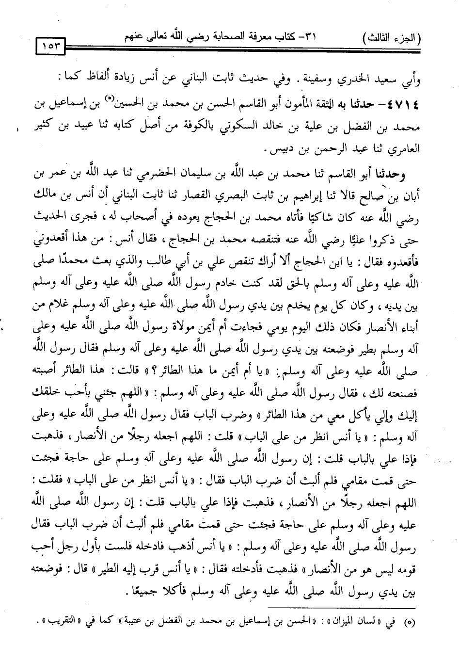 وَحَدَّثَنَا أَبُو الْقَاسِمِ ، ثنا مُحَمَّدُ بْنُ عَبْدِ اللَّهِ بْنِ سُلَيْمَانَ الْحَضْرَمِيُّ ، ثنا عَبْدُ اللَّهِ بْنُ عُمَرَ بْنِ أَبَانَ بْنِ صَالِحٍ ، قَالَا: ثنا إِبْرَاهِيمُ بْنُ ثَابِتٍ ** الْبَصْرِيُّ الْقَصَّارُ ، ثنا ثَابِتٌ الْبُنَانِيُّ ، أَنَّ أَنَسَ بْنَ مَالِكٍ رَضِيَ اللَّهُ عَنْهُ كَانَ شَاكِيًا ، فَأَتَاهُ مُحَمَّدُ بْنُ الْحَجَّاجِ يَعُودُهُ فِي أَصْحَابٍ لَهُ ، فَجَرَى الْحَدِيثُ حَتَّى ذَكَرُوا عَلِيًّا رَضِيَ اللَّهُ عَنْهُ فَتَنَقَّصَهُ مُحَمَّدُ بْنُ الْحَجَّاجِ ، فَقَالَ أَنَسٌ: مَنْ هَذَا ؟ أَقْعِدُونِي فَأَقْعَدُوهُ ، فَقَالَ: يَا ابْنَ الْحَجَّاجِ ، أَلَا أَرَاكَ تَنْقُصُ عَلِيَّ بْنَ أَبِي طَالِبٍ وَالَّذِي بَعَثَ مُحَمَّدًا صَلَّى اللَّهُ عَلَيْهِ وَسَلَّمَ بِالْحَقِّ ، لَقَدْ كُنْتُ خَادِمَ رَسُولِ اللَّهِ صَلَّى اللَّهُ عَلَيْهِ وَسَلَّمَ بَيْنَ يَدَيْهِ ، وَكَانَ كُلَّ يَوْمٍ يَخْدُمُ بَيْنَ يَدِي رَسُولِ اللَّهِ صَلَّى اللَّهُ عَلَيْهِ وَسَلَّمَ غُلَامٌ مِنْ أَبْنَاءِ الْأَنْصَارِ ، فَكَانَ ذَلِكَ الْيَوْمُ يَوْمِي فَجَاءَتْ أُمُّ أَيْمَنَ مَوْلَاةُ رَسُولِ اللَّهِ صَلَّى اللَّهُ عَلَيْهِ وَسَلَّمَ بِطَيْرٍ فَوَضَعْتُهُ بَيْنَ يَدِي رَسُولِ اللَّهِ صَلَّى اللَّهُ عَلَيْهِ وَسَلَّمَ ، فَقَالَ رَسُولُ اللَّهِ صَلَّى اللَّهُ عَلَيْهِ وَسَلَّمَ: " يَا أُمَّ أَيْمَنَ مَا هَذَا الطَّائِرُ ؟ " قَالَتْ: هَذَا الطَّائِرُ أَصَبْتُهُ فَصَنَعْتُهُ لَكَ ، فَقَالَ رَسُولُ اللَّهِ صَلَّى اللَّهُ عَلَيْهِ وَسَلَّمَ: " اللَّهُمَّ جِئْنِي بِأَحَبِّ خَلْقِكَ إِلَيْكَ وَإِلَيَّ يَأْكُلُ مَعِي مِنْ هَذَا الطَّائِرِ " وَضَرَبَ الْبَابَ ، فَقَالَ رَسُولُ اللَّهِ صَلَّى اللَّهُ عَلَيْهِ وَسَلَّمَ: " يَا أَنَسُ انْظُرْ مَنْ عَلَى الْبَابِ " ، قُلْتُ: اللَّهُمَّ اجْعَلْهُ رَجُلًا مِنَ الْأَنْصَارِ فَذَهَبْتُ ، فَإِذَا عَلِيٌّ بِالْبَابِ ، قُلْتُ: إِنَّ رَسُولَ اللَّهِ صَلَّى اللَّهُ عَلَيْهِ وَسَلَّمَ عَلَى حَاجَةٍ فَجِئْتُ حَتَّى قُمْتُ مِنْ مَقَامِي فَلَمْ أَلْبَثْ أَنْ ضَرَبَ الْبَابَ ، فَقَالَ: " يَا أَنَسُ ، انْظُرْ مَنْ عَلَى الْبَابِ " فَقُلْتُ: اللَّهُمَّ اجْعَلْهُ رَجُلًا مِنَ الْأَنْصَارِ ، فَذَهَبْتُ فَإِذَا عَلِيٌّ بِالْبَابِ ، قُلْتُ: إِنَّ رَسُولَ اللَّهِ صَلَّى اللَّهُ عَلَيْهِ وَسَلَّمَ عَلَى حَاجَةٍ ، فَجِئْتُ حَتَّى قُمْتُ مَقَامِي ، فَلَمْ أَلْبَثْ أَنْ ضَرَبَ الْبَابَ ، فَقَالَ رَسُولُ اللَّهِ صَلَّى اللَّهُ عَلَيْهِ وَسَلَّمَ: " يَا أَنَسُ اذْهَبْ فَأَدْخِلْهُ ، فَلَسْتَ بِأَوَّلِ رَجُلٍ أَحَبَّ قَوْمَهُ لَيْسَ هُوَ مِنَ الْأَنْصَارِ " ، فَذَهَبْتُ فَأَدْخَلْتُهُ ، فَقَالَ: " يَا أَنَسُ قَرِّبْ إِلَيْهِ الطَّيْرَ " ، قَالَ: فَوَضَعْتُهُ بَيْنَ يَدَيْ رَسُولِ اللَّهِ صَلَّى اللَّهُ عَلَيْهِ وَسَلَّمَ فَأَكَلَا جَمِيعًا ، -[154]- قَالَ مُحَمَّدُ بْنُ الْحَجَّاجِ: يَا أَنَسُ ، كَانَ هَذَا بِمَحْضَرٍ مِنْكَ ؟ قَالَ: نَعَمْ ، قَالَ: " أُعْطِي بِاللَّهِ عَهْدًا أَلَّا أَنْتَقِصَ عَلِيًّا بَعْدَ مَقَامِي هَذَا ، وَلَا أَعْلَمُ أَحَدًا يَنْتَقِصُهُ إِلَّا أَشْنَبَ لَهُ وَجْهَهُ "